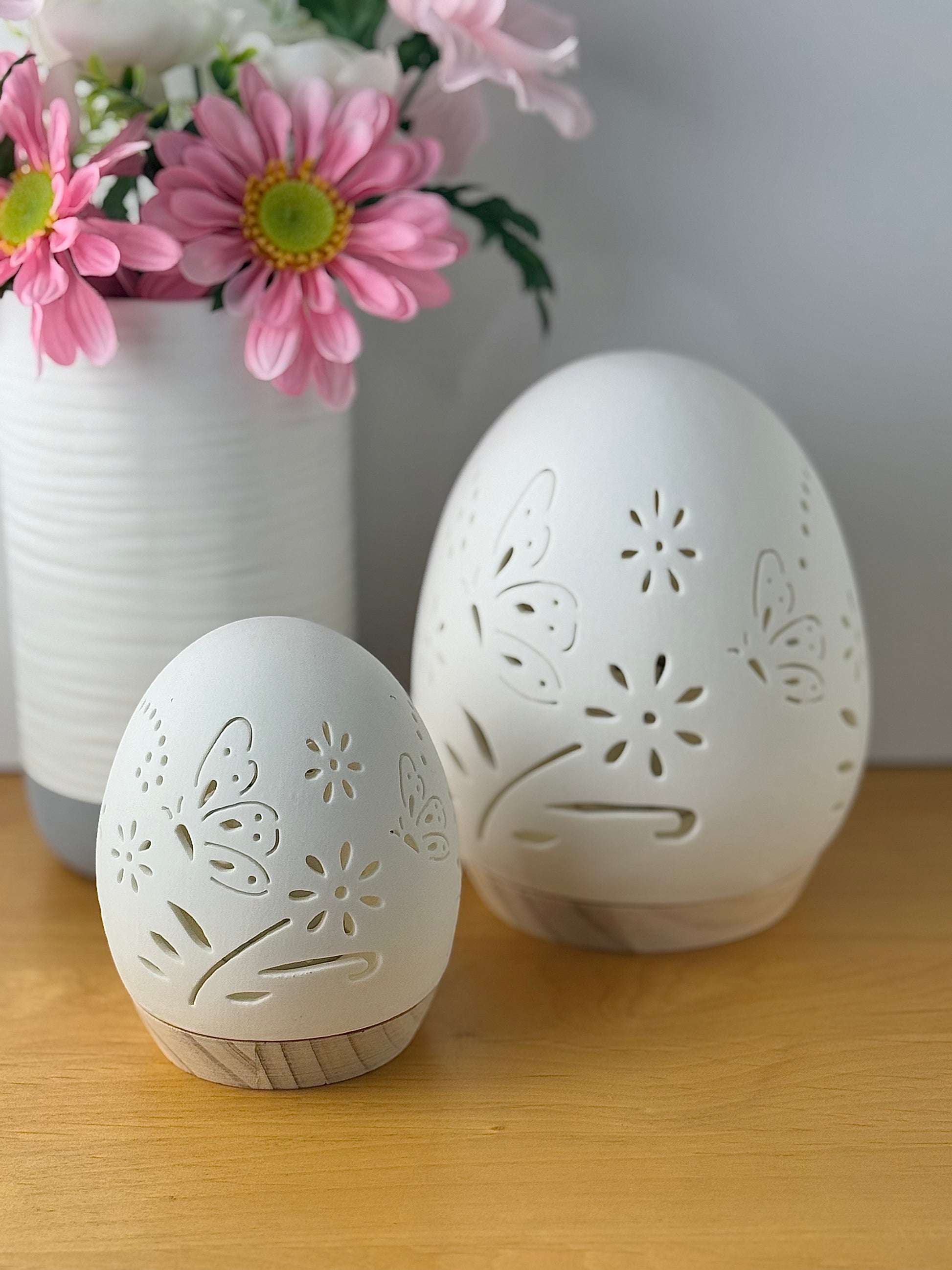 Matt ceramic eggs with cut out designs of flowers & butterflies.