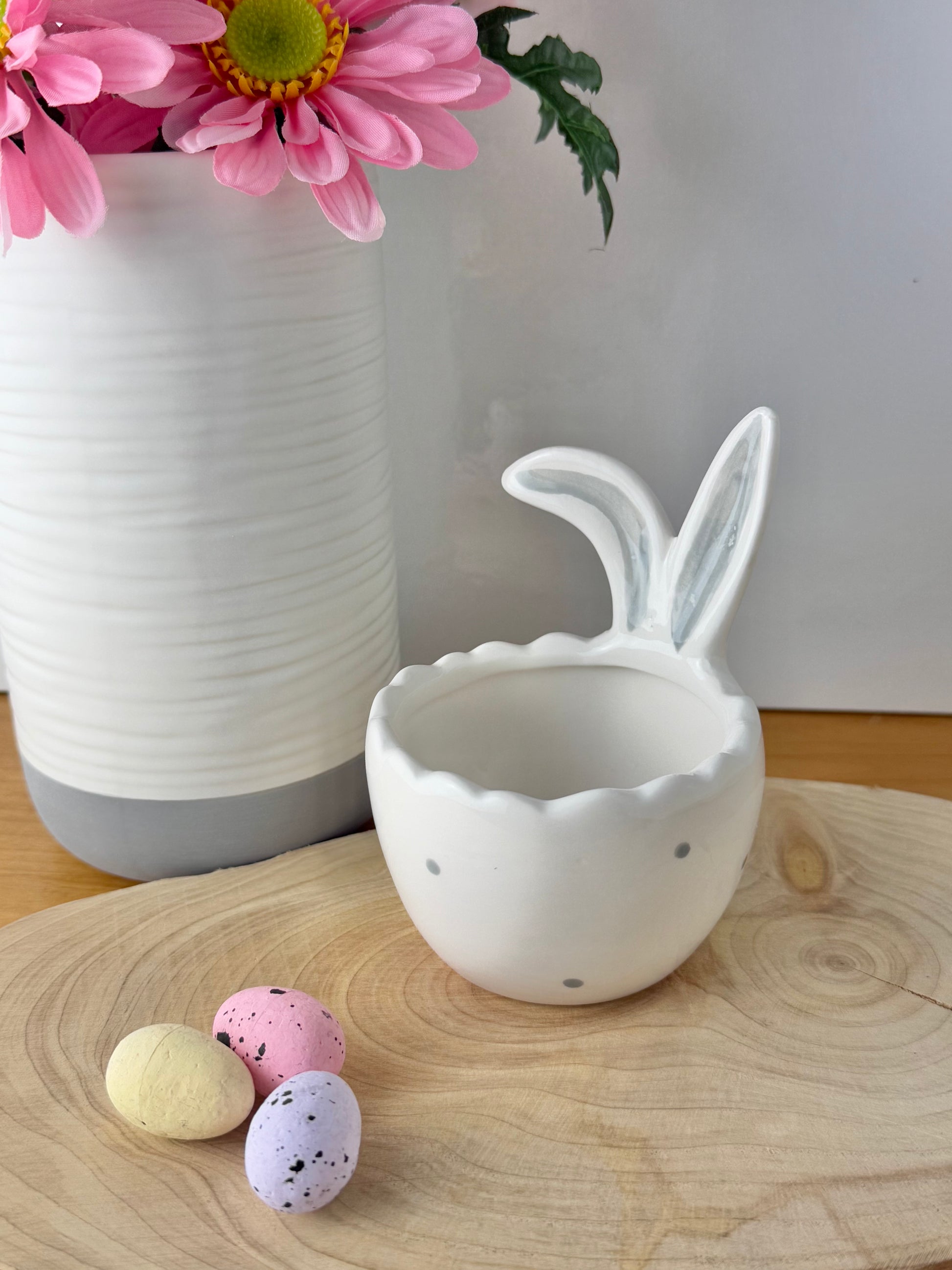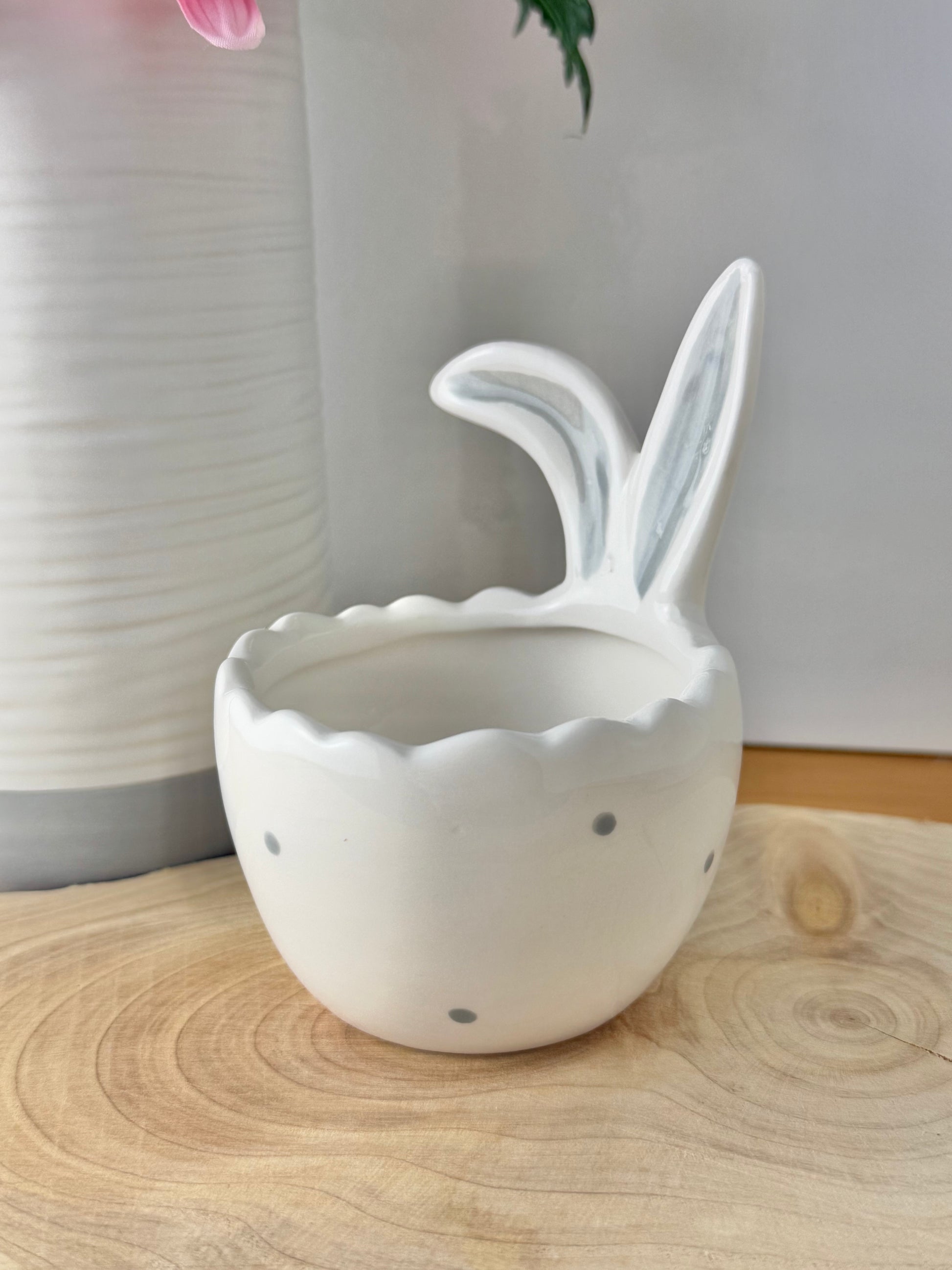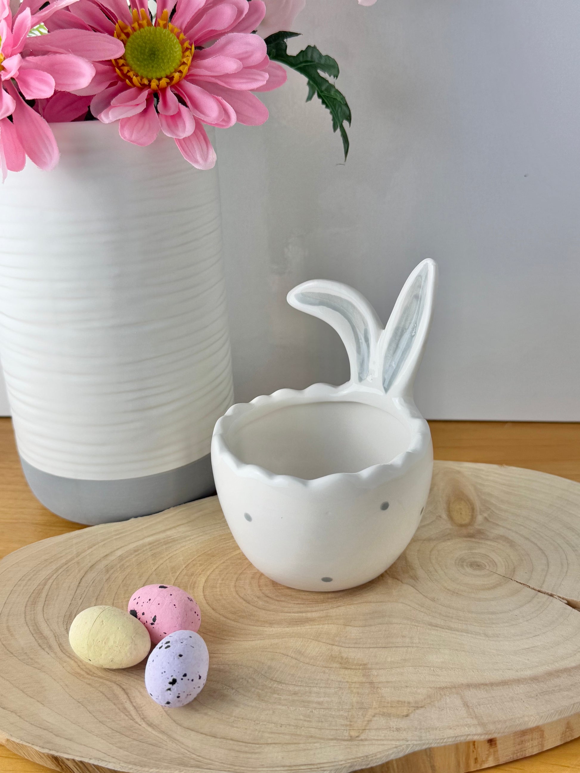 A Stunning Large White Ceramic Egg Cup with Rabbit Ears and Grey Detailing.