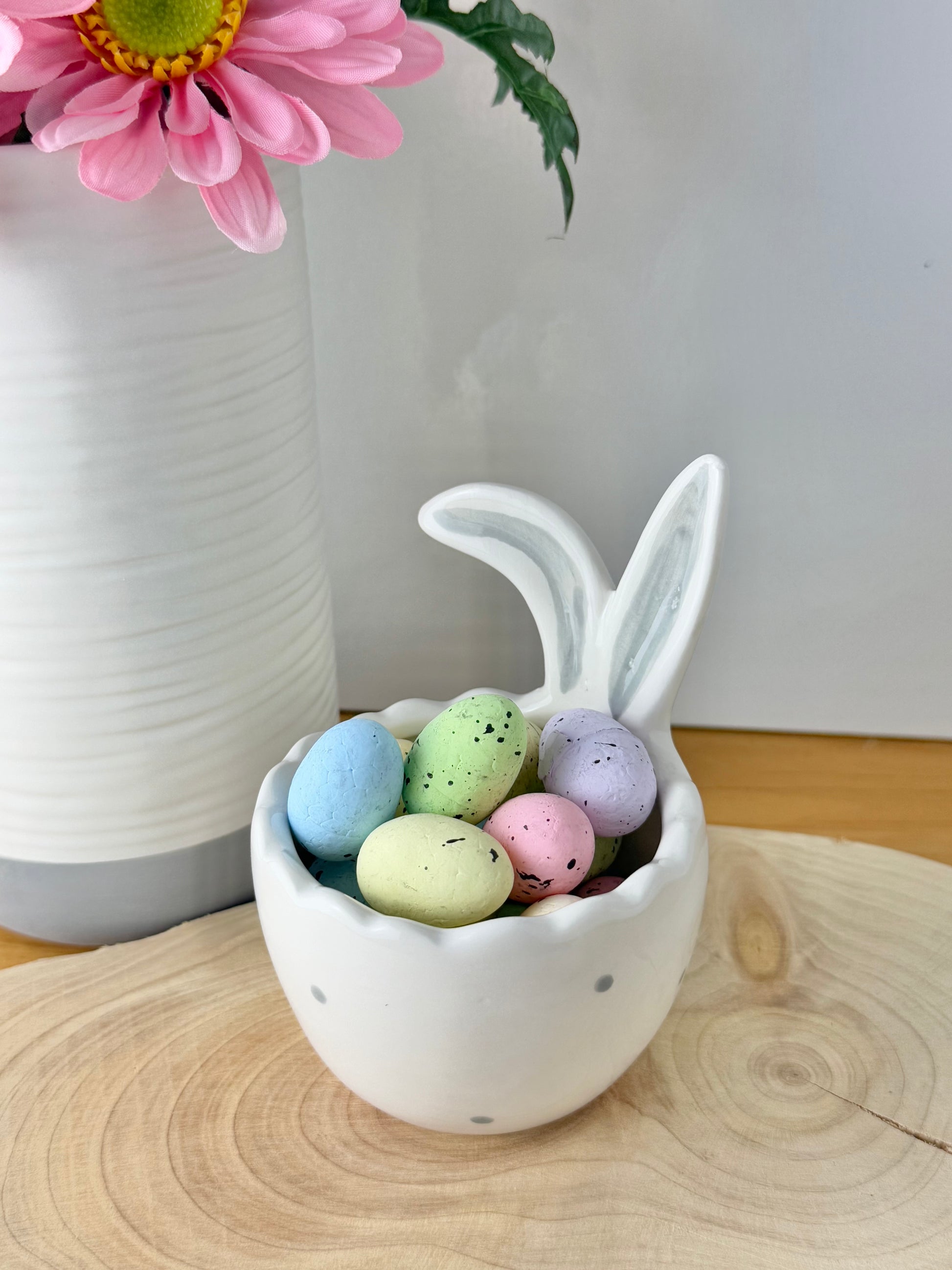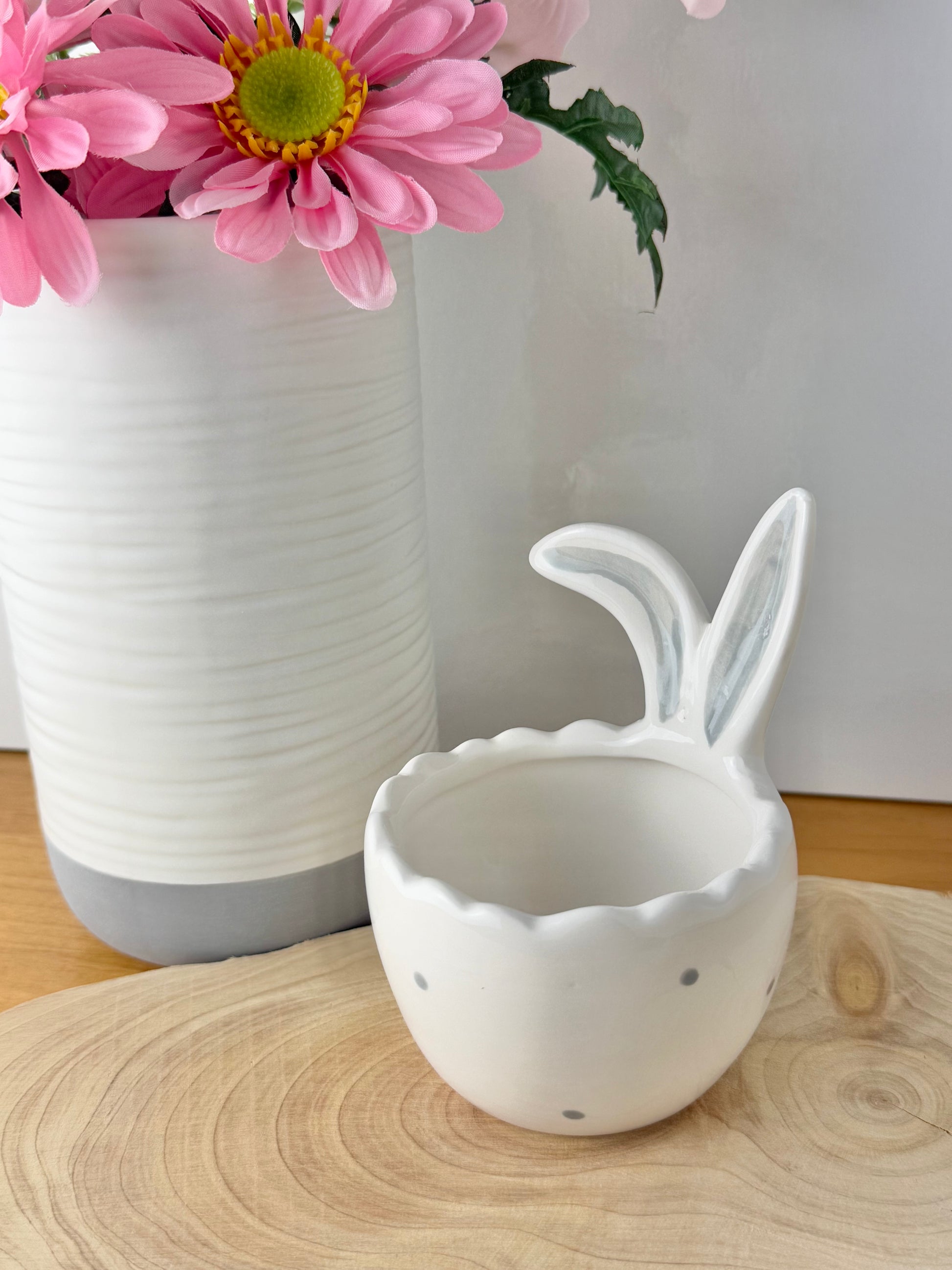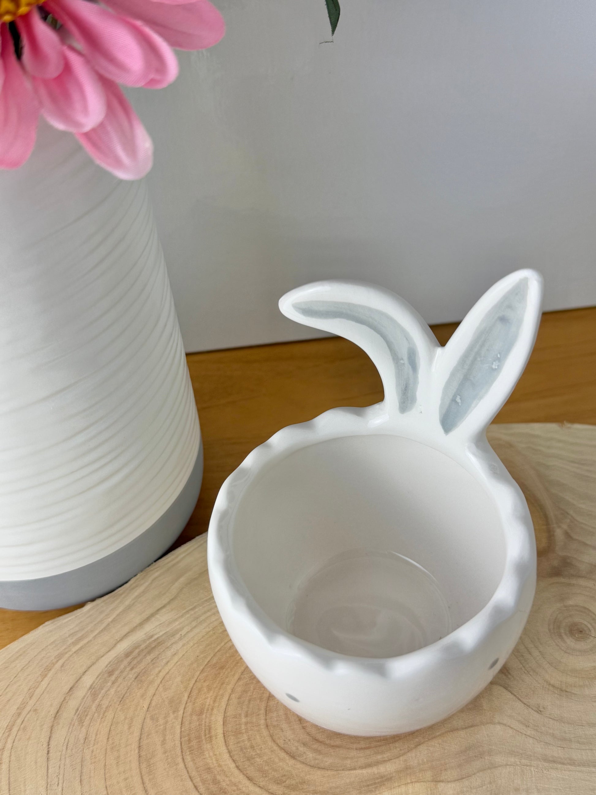 A Stunning Large White Ceramic Egg Cup with Rabbit Ears and Grey Detailing.