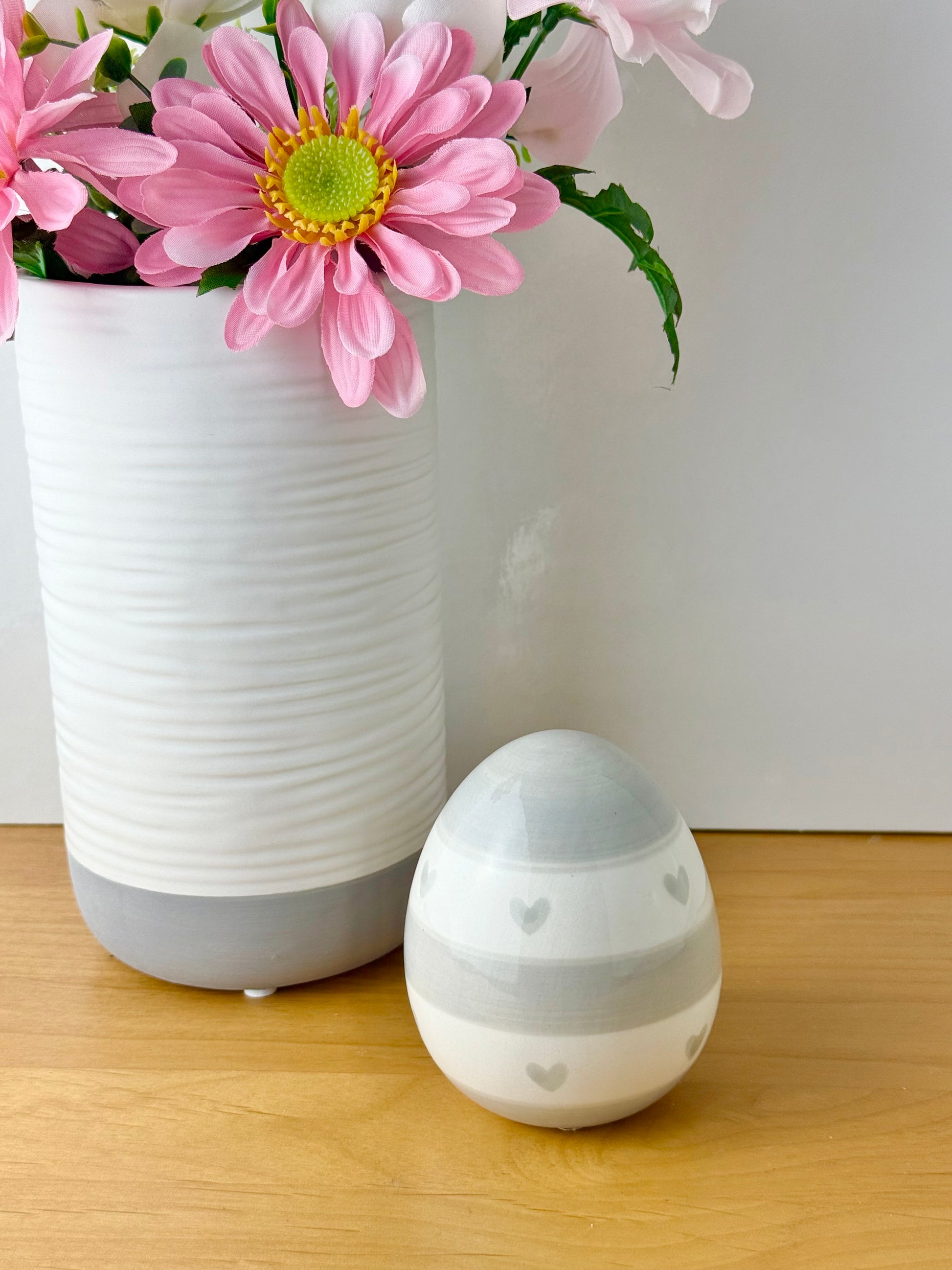 A gorgeous ceramic grey & white striped egg with grey hearts. Perfect to add to an Easter display or to keep out all year round.