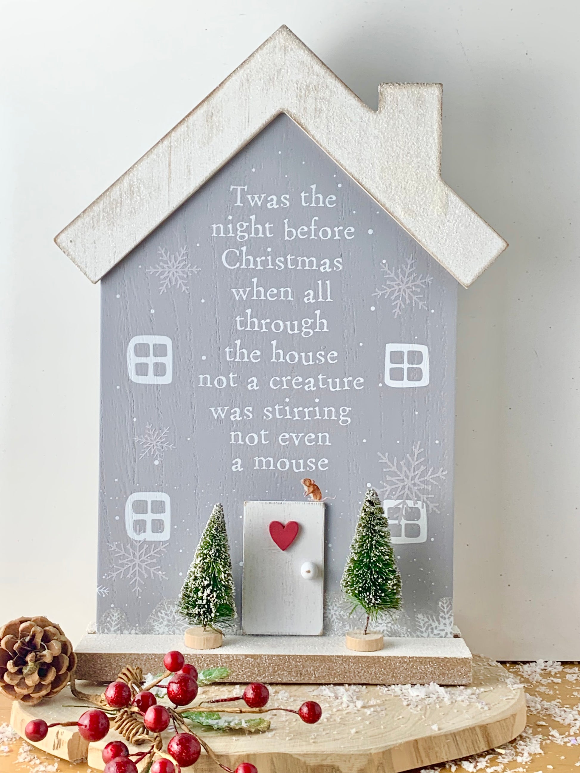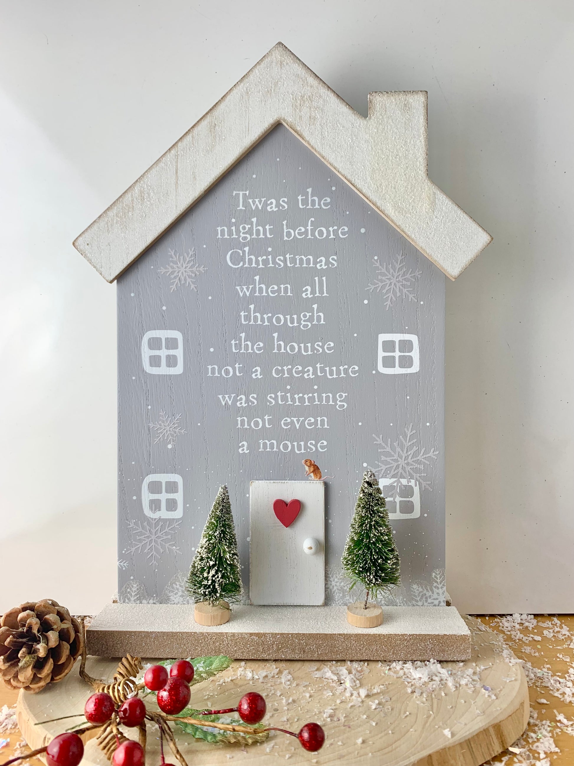 Wooden stand up sign in the shape of a house, the body is grey with white & grey writing & detail. The roof & stand is white with glitter detail.