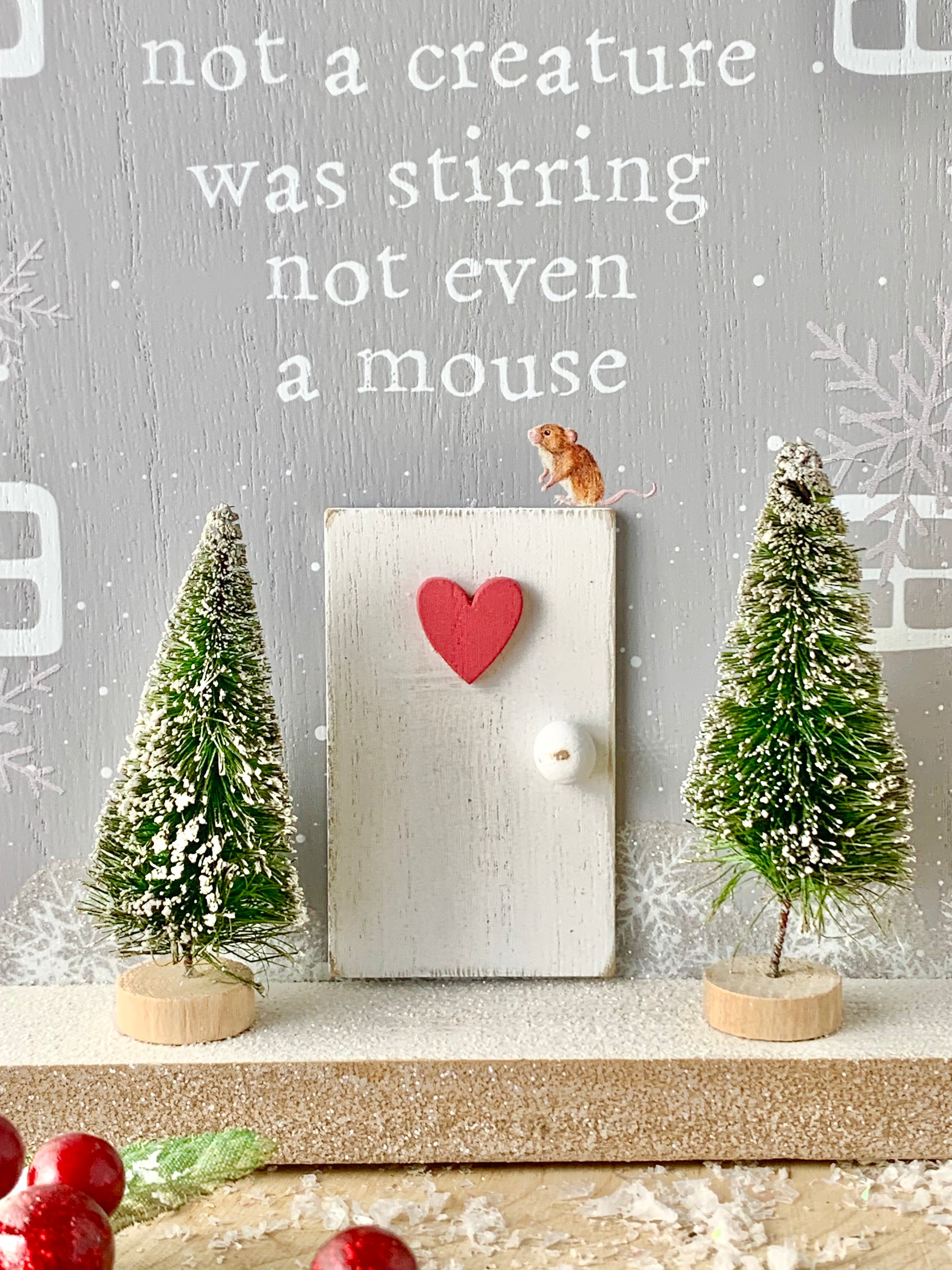 There is a tiny mouse sitting on top of the front door with 2 trees either side.