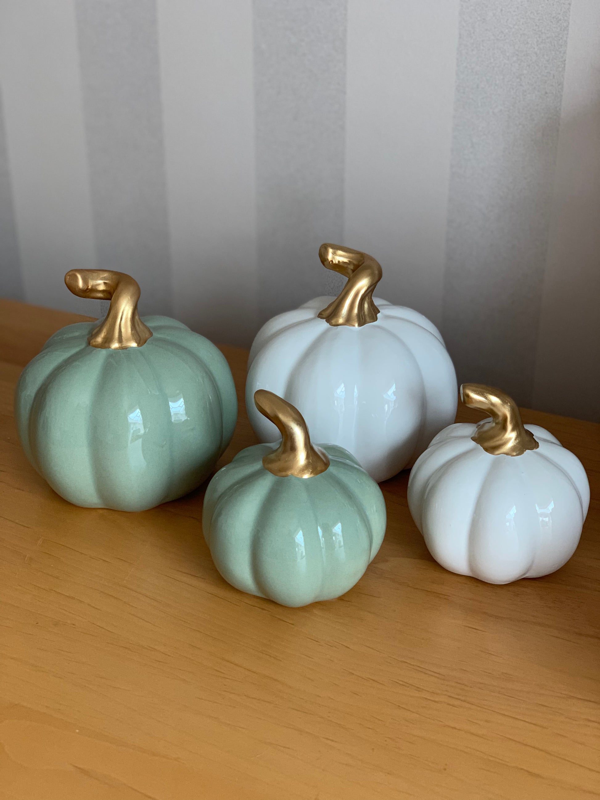 Ceramic Pumpkin Ornament in a Gorgeous Sage Green, with Beautifully Detailed Curly Gold Stalk. Finished in a Protective Glaze.