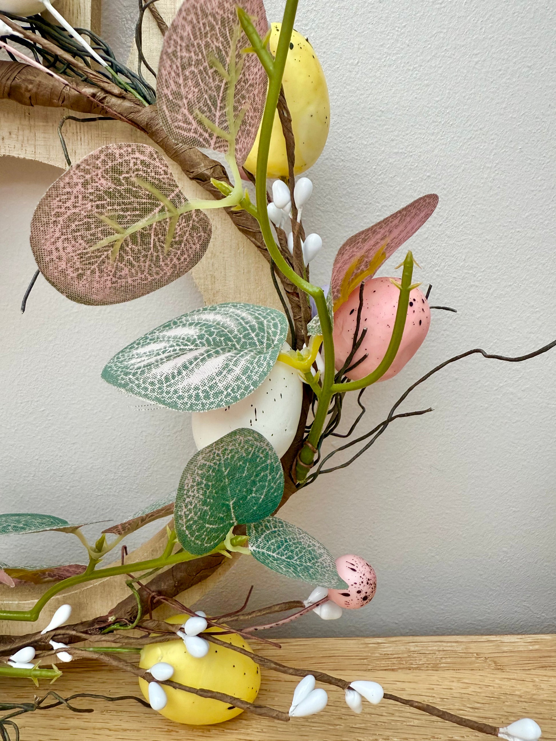 A very cute wooden bunny wreath. The round wooden wreath with bunny ears is covered at the front in faux twigs, leaves & white berries plus coloured speckled eggs in white, pink, yellow & lilac for decoration.