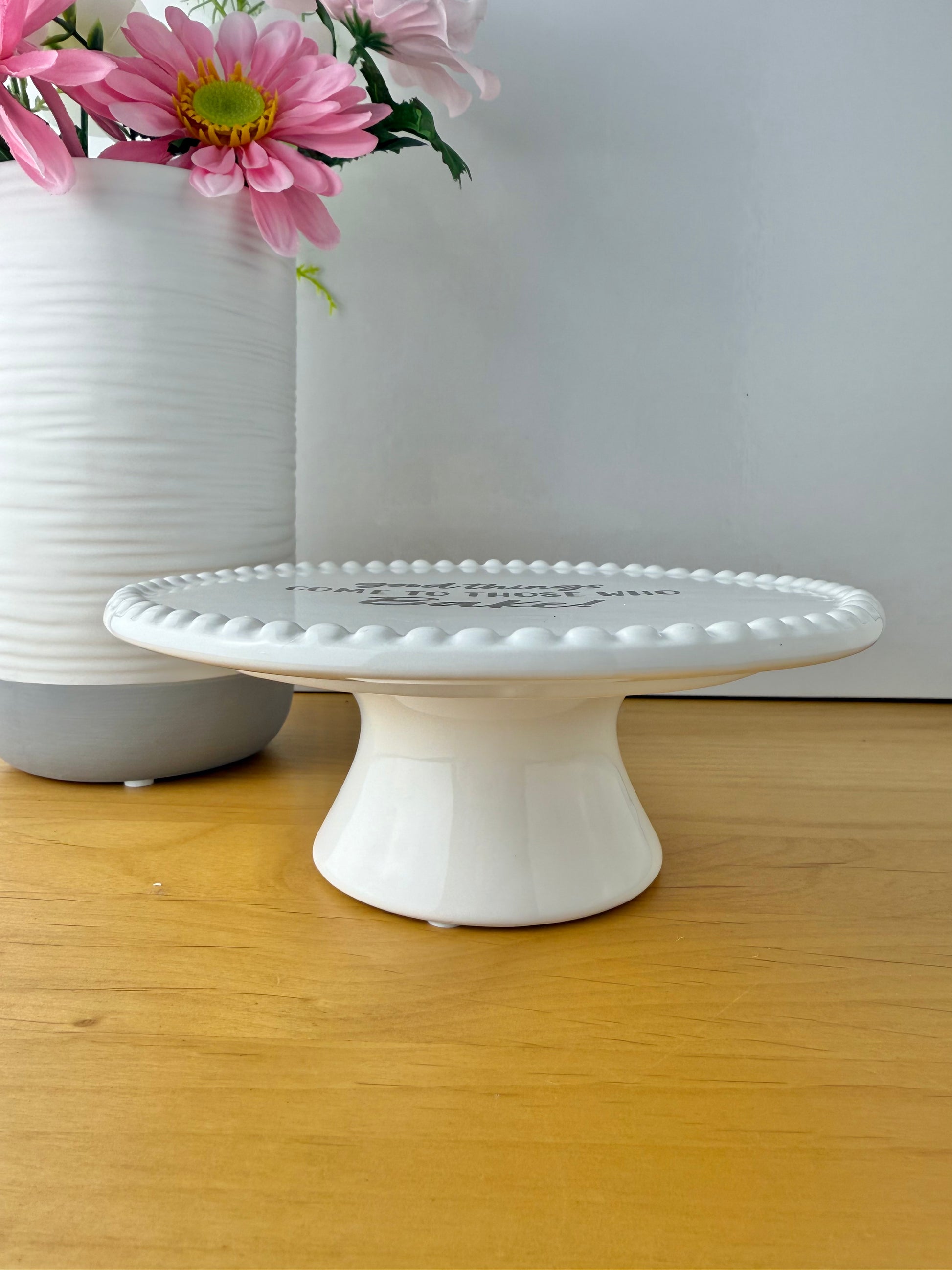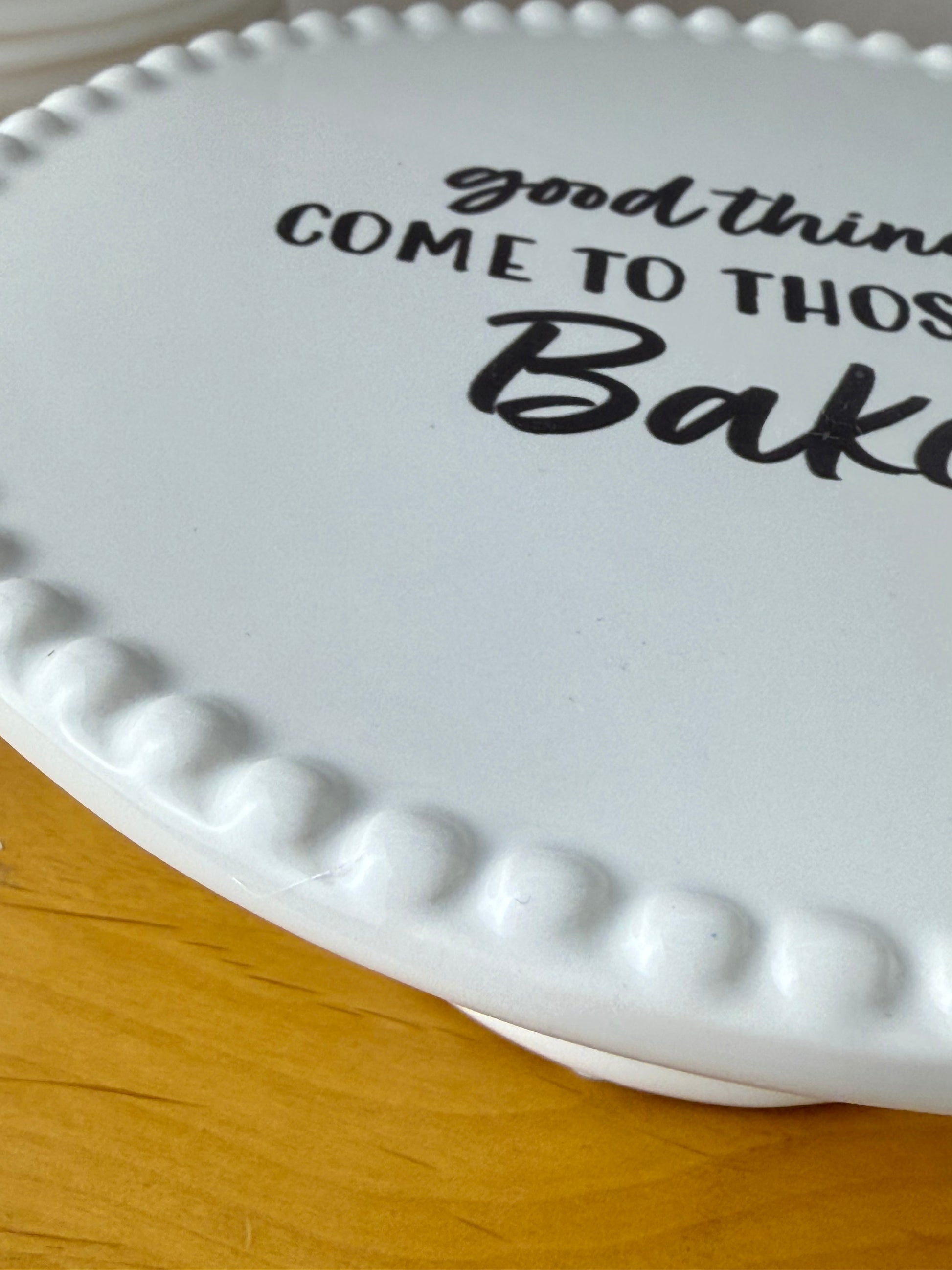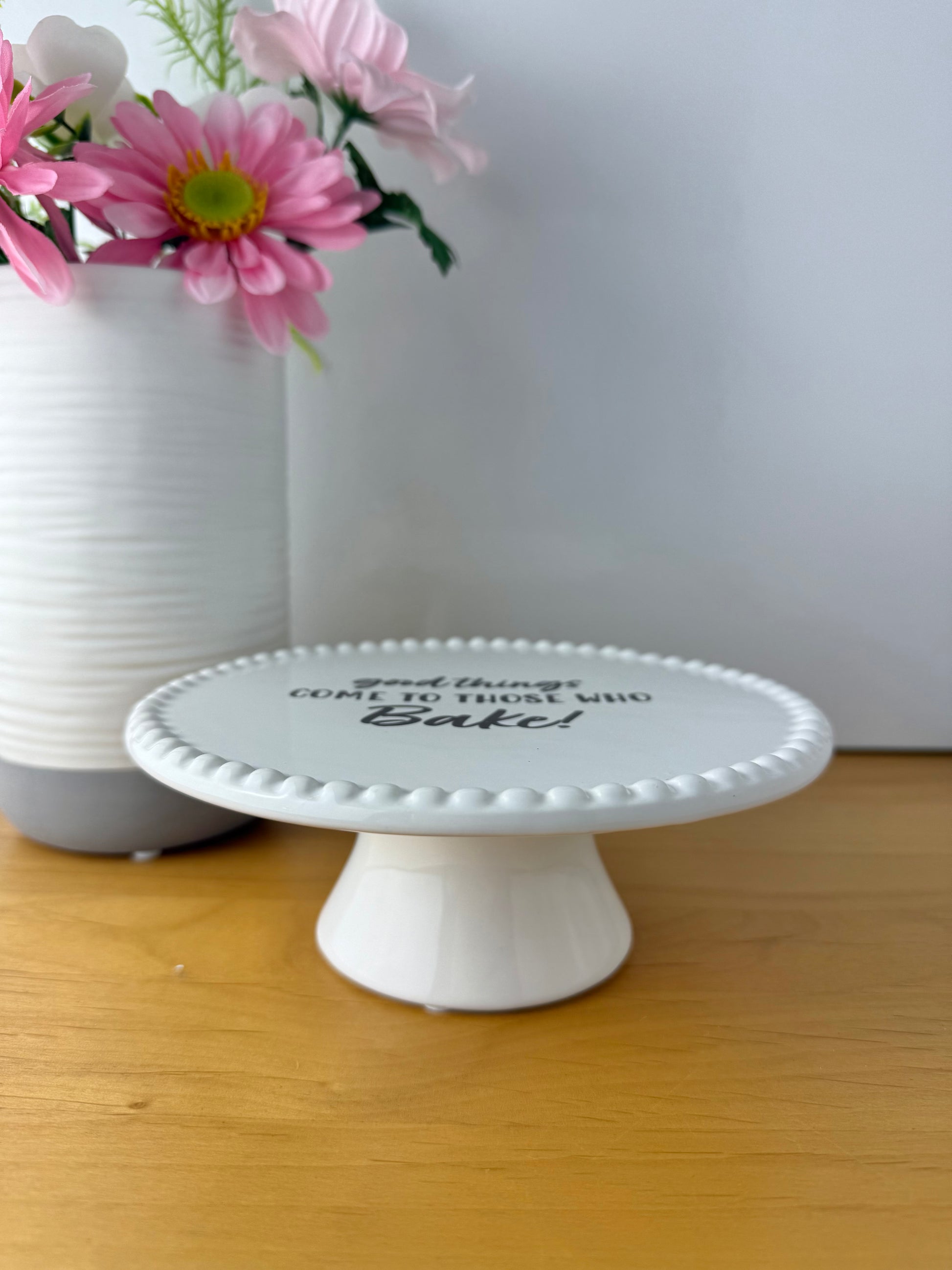 Bright white and glossy ceramic cakeplate with stylish plinth & beaded edge. Includes fun text 'Good Things Come To Those Who Bake'