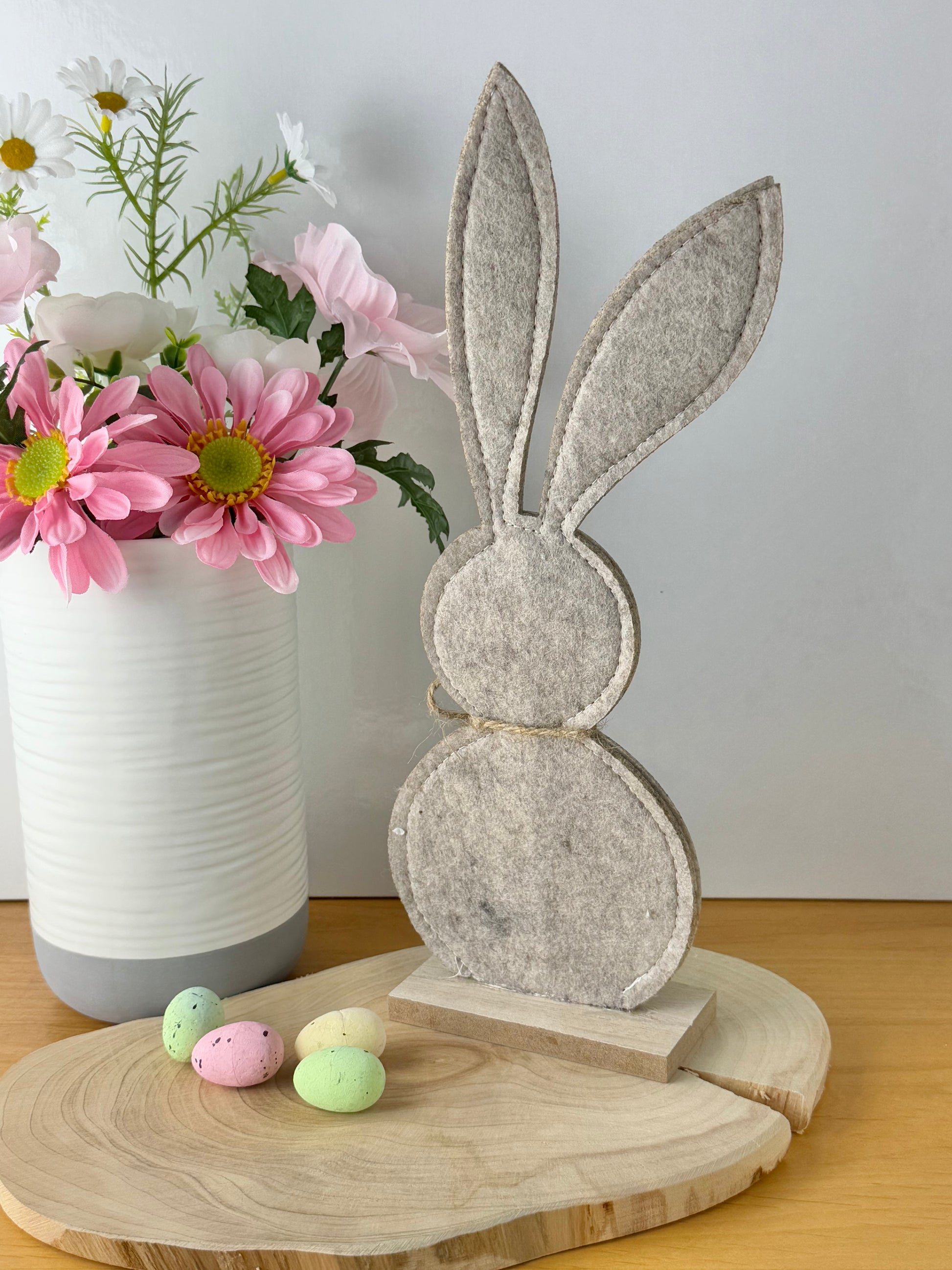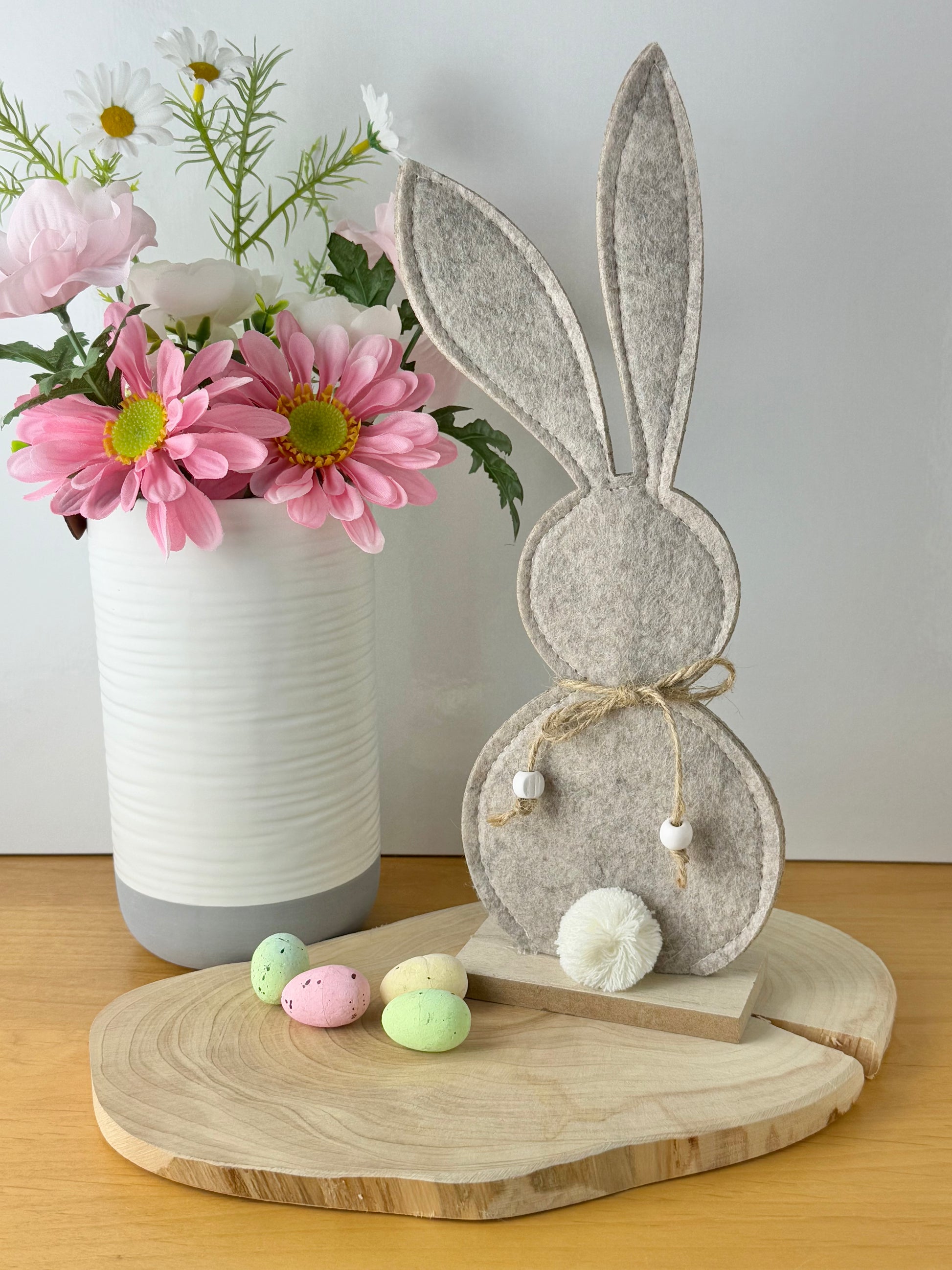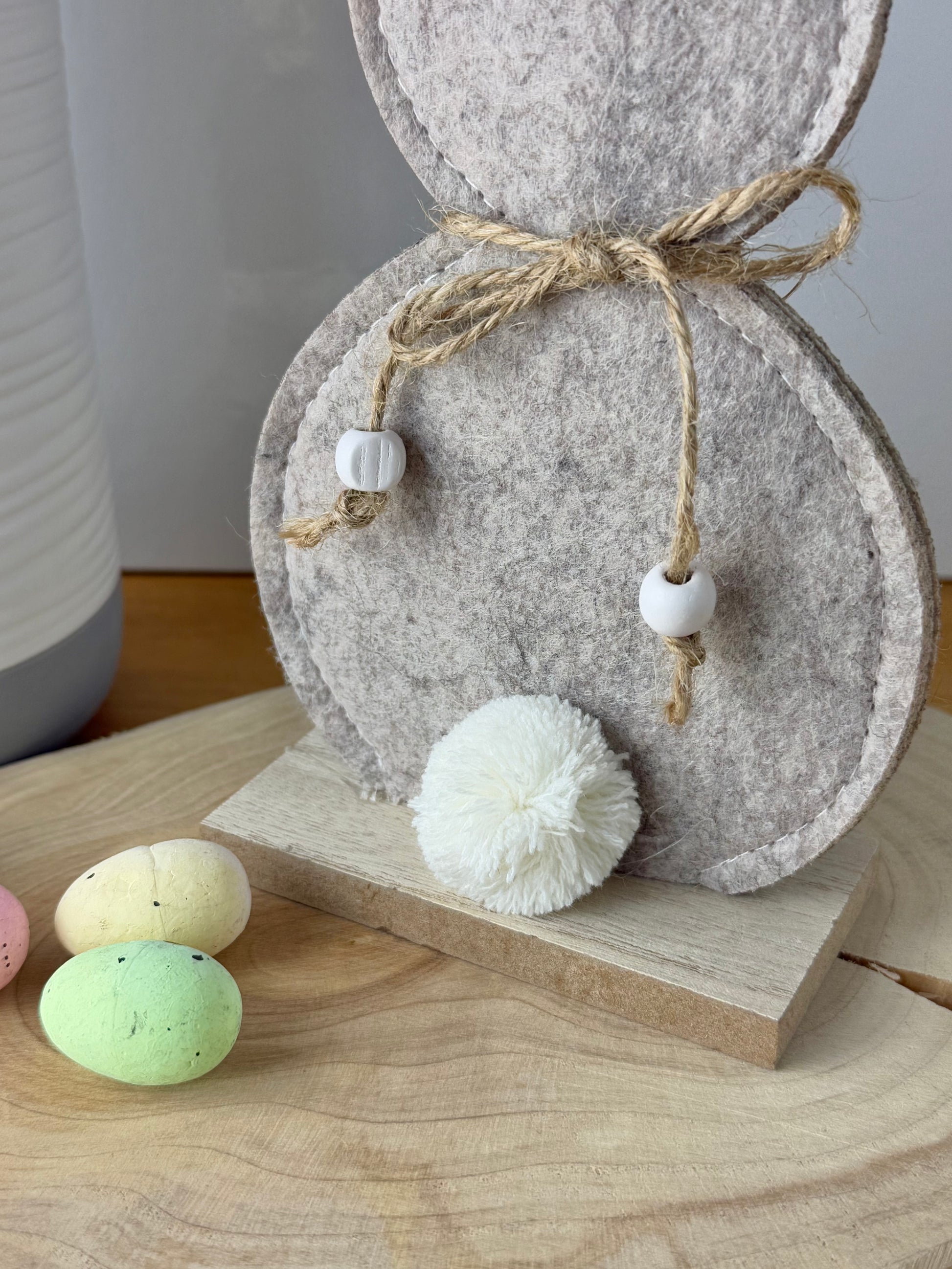 A chic felt bunny decoration. Beautifully stitched with a jute bow and fluffy pom pom tail.