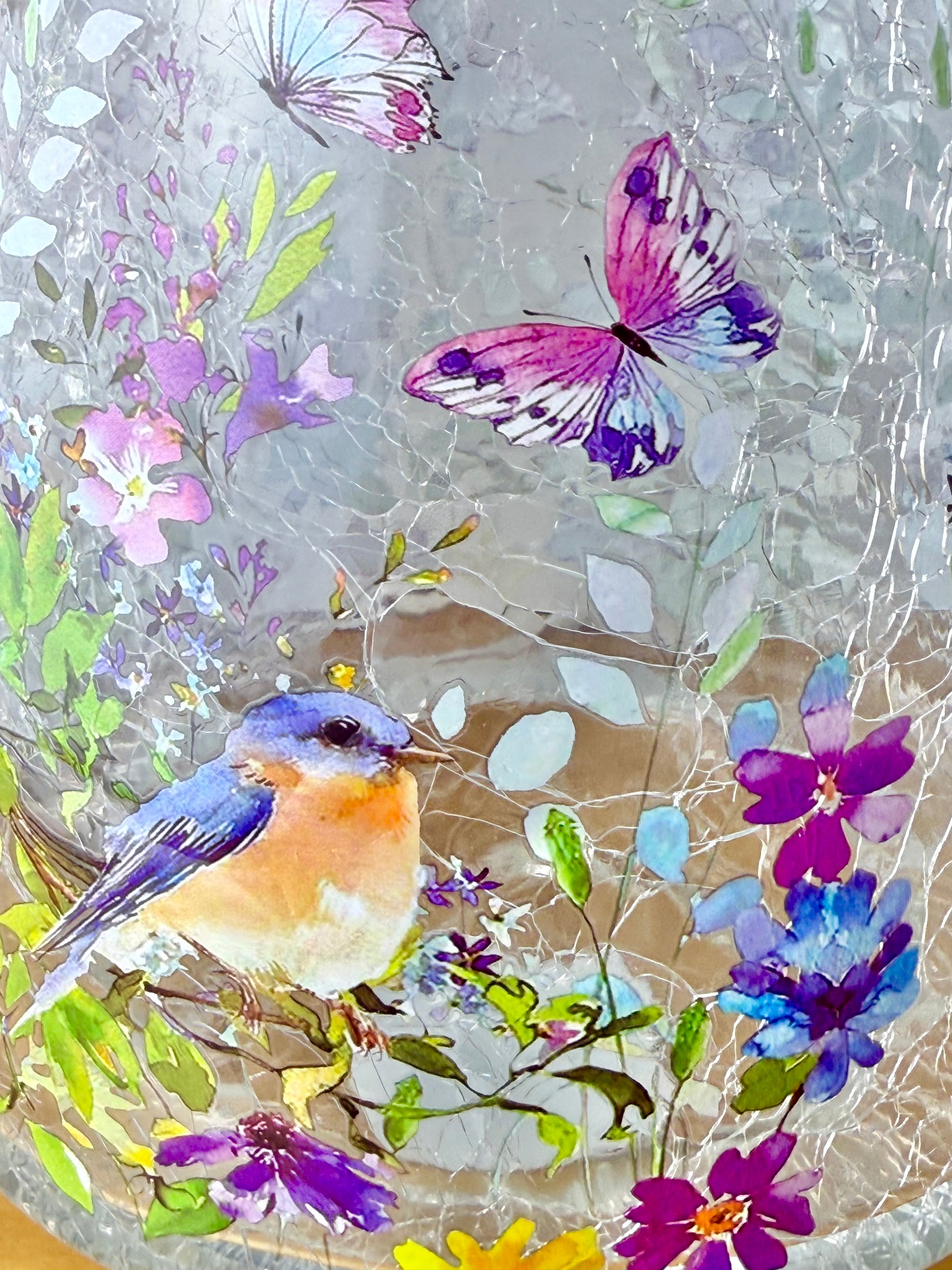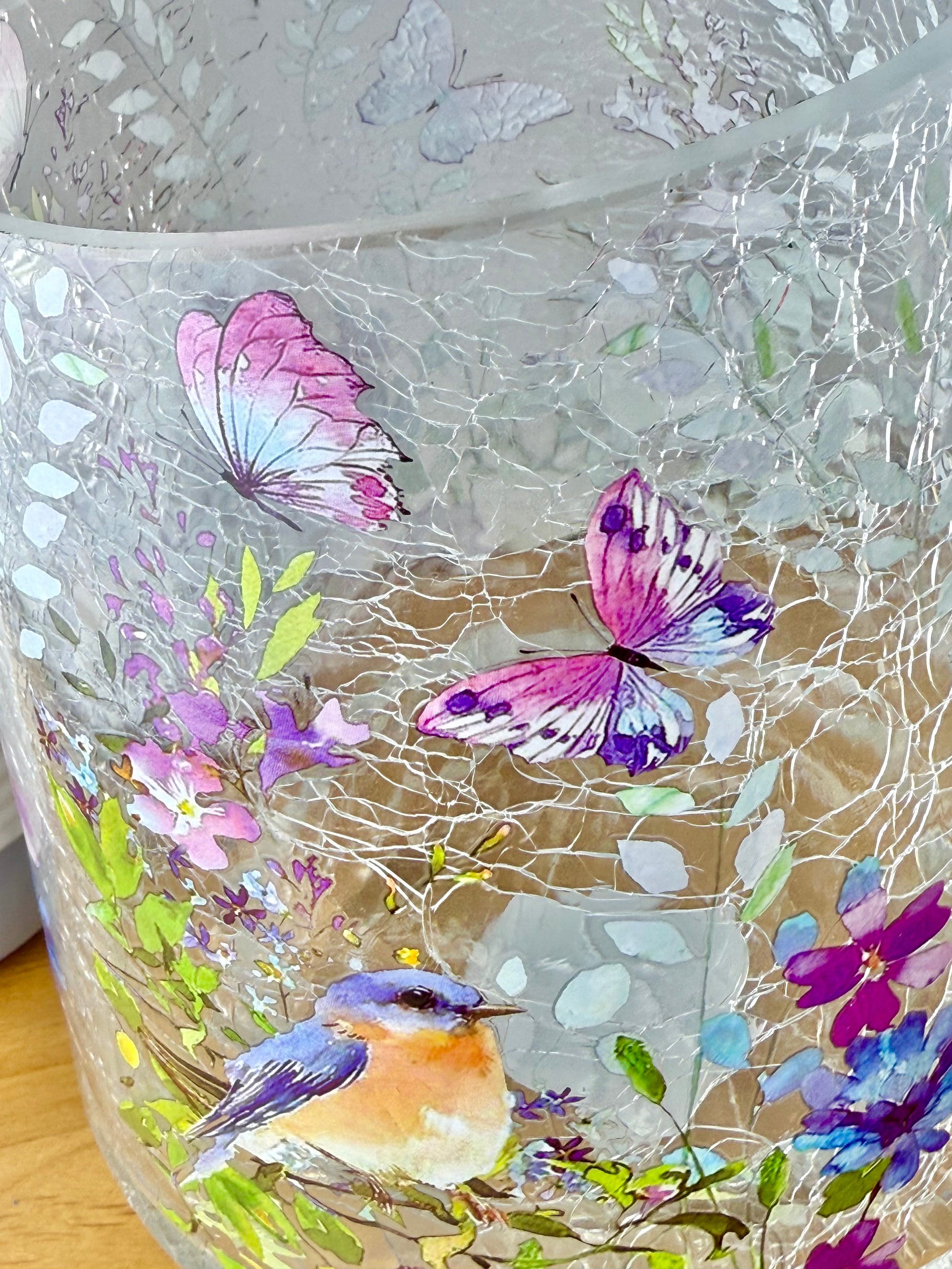 Large hurricane glass vase or candle holder decorated with flowers, butterflys and hummingbird in pastel colours.