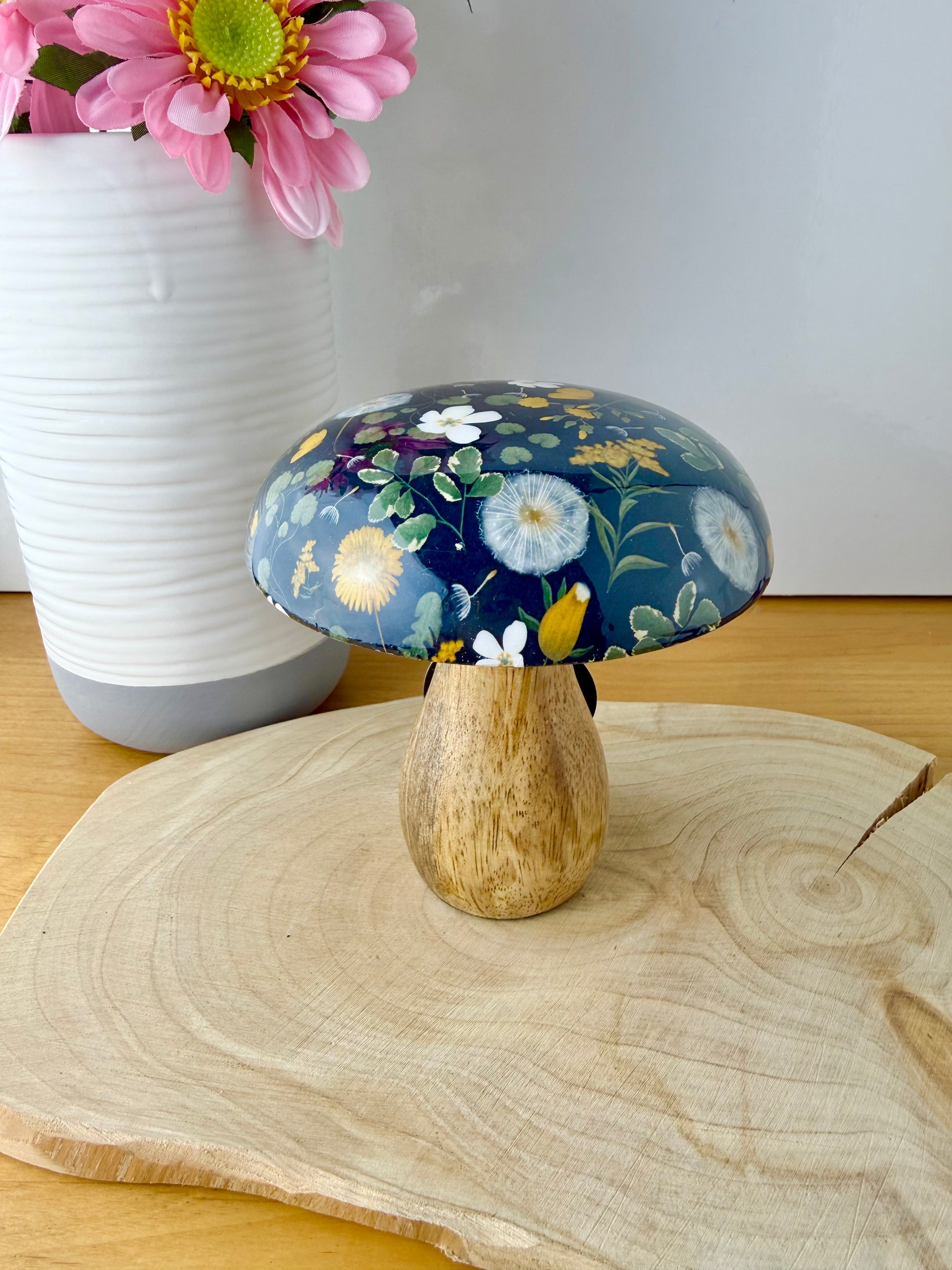 A beautifully crafted wooden mushroom with a highly decorated enamel cap.