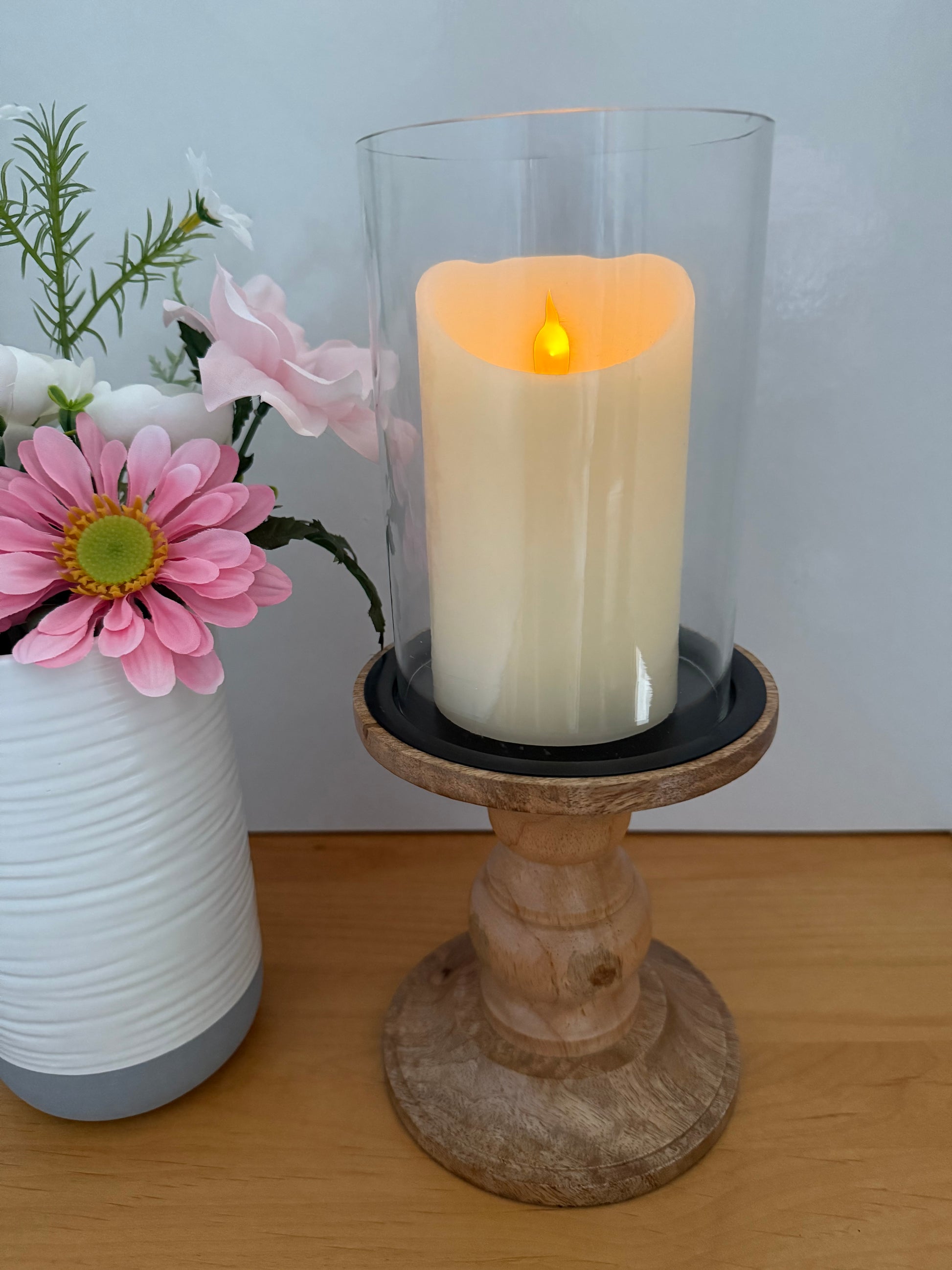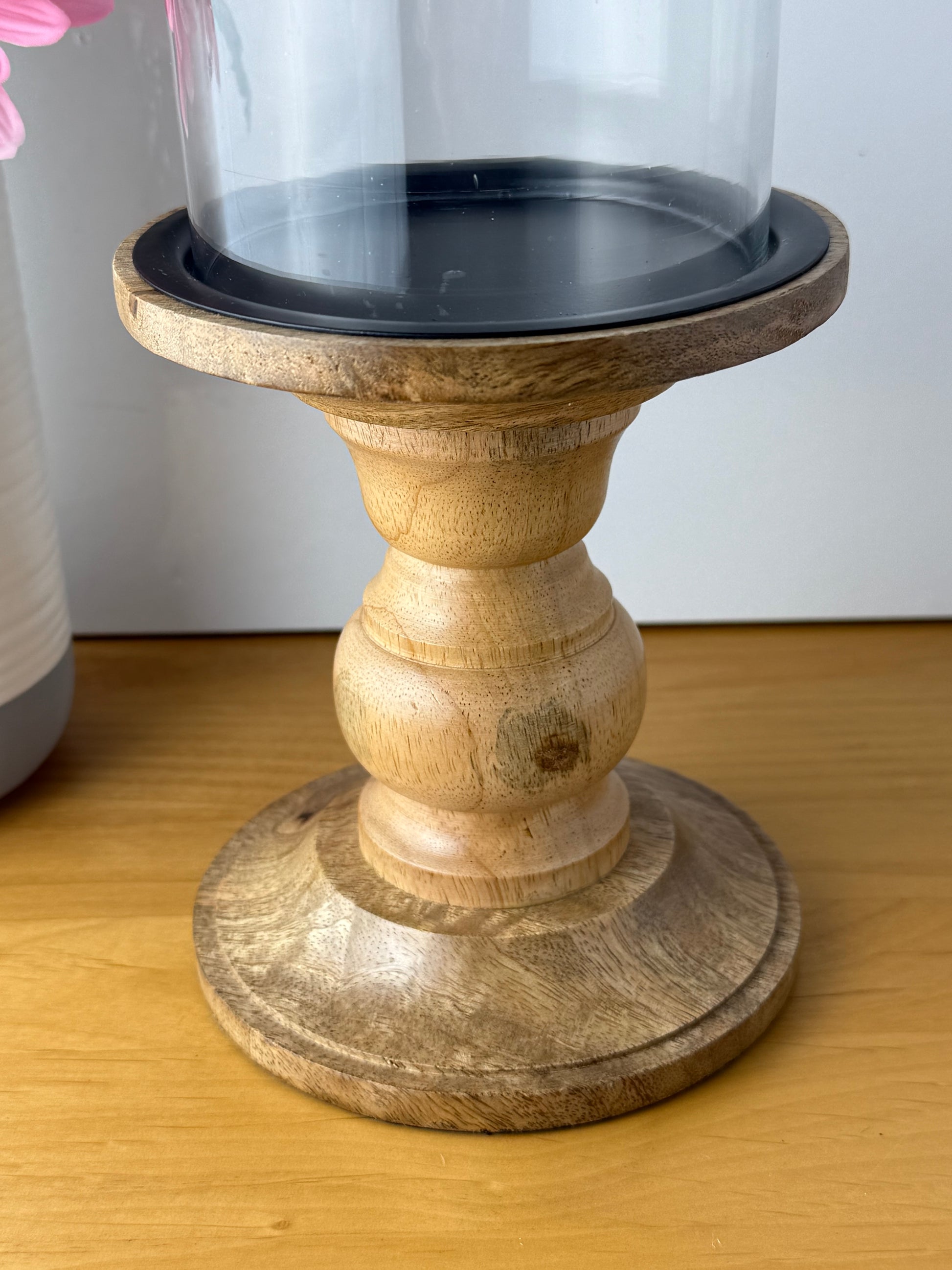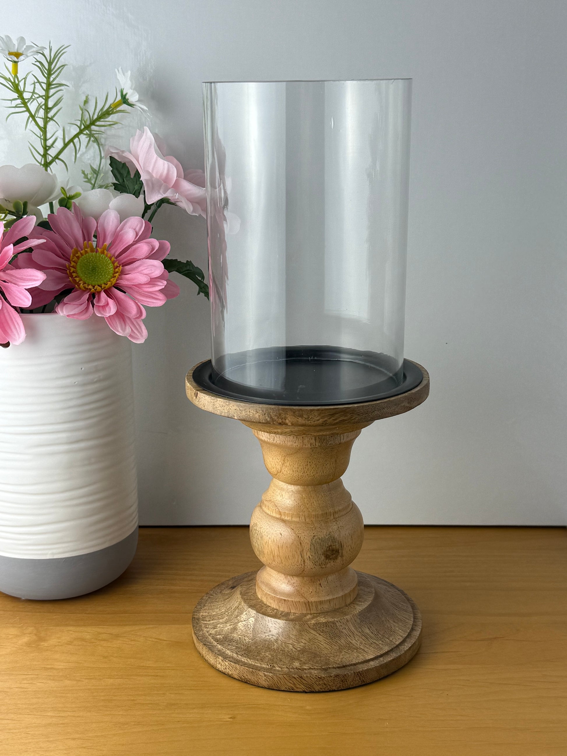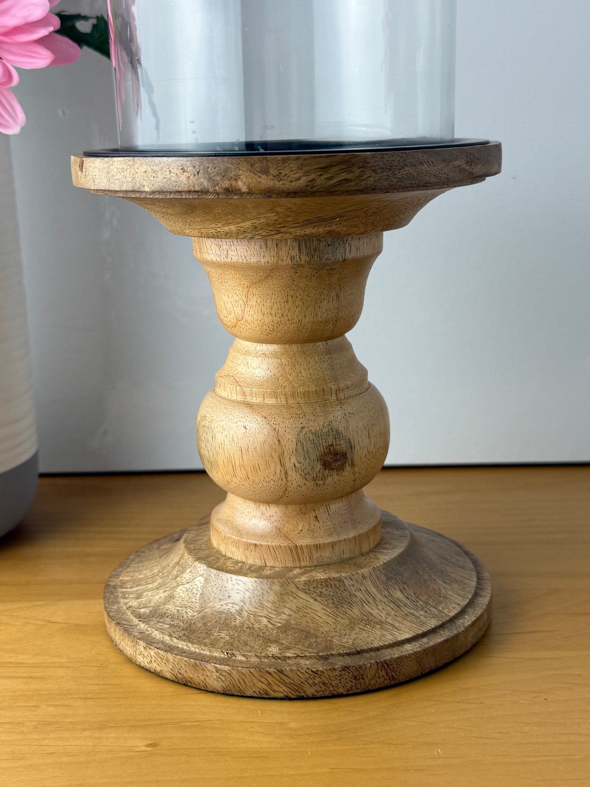 Add warm ambience to any room with this glass pillar candle holder. This country style item with a wooden stand is the ideal accessory to add to any home. Its simple yet stylish, perfect to have out all year round.
