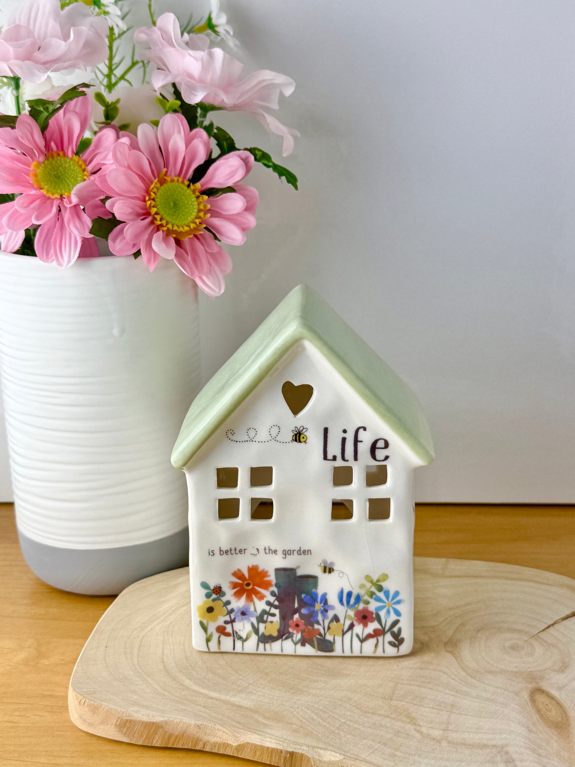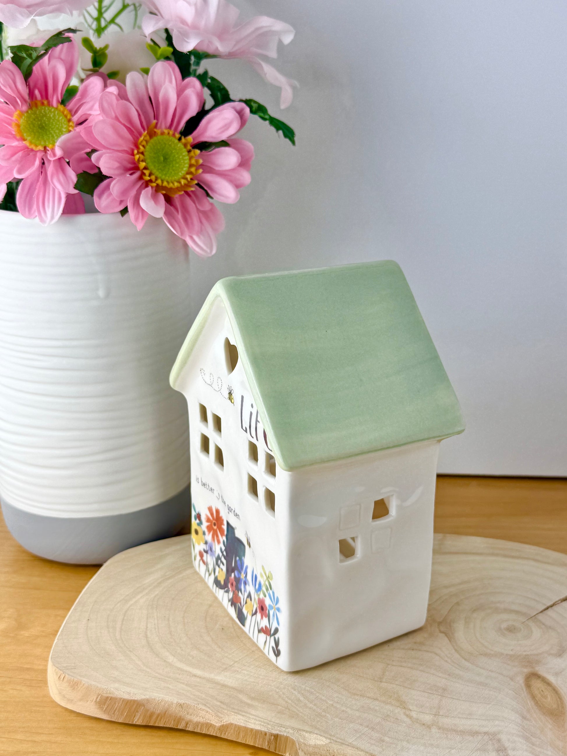 A ceramic white House T-Light Holder with a pale green roof & bright flowers & wellies painted onto the front.