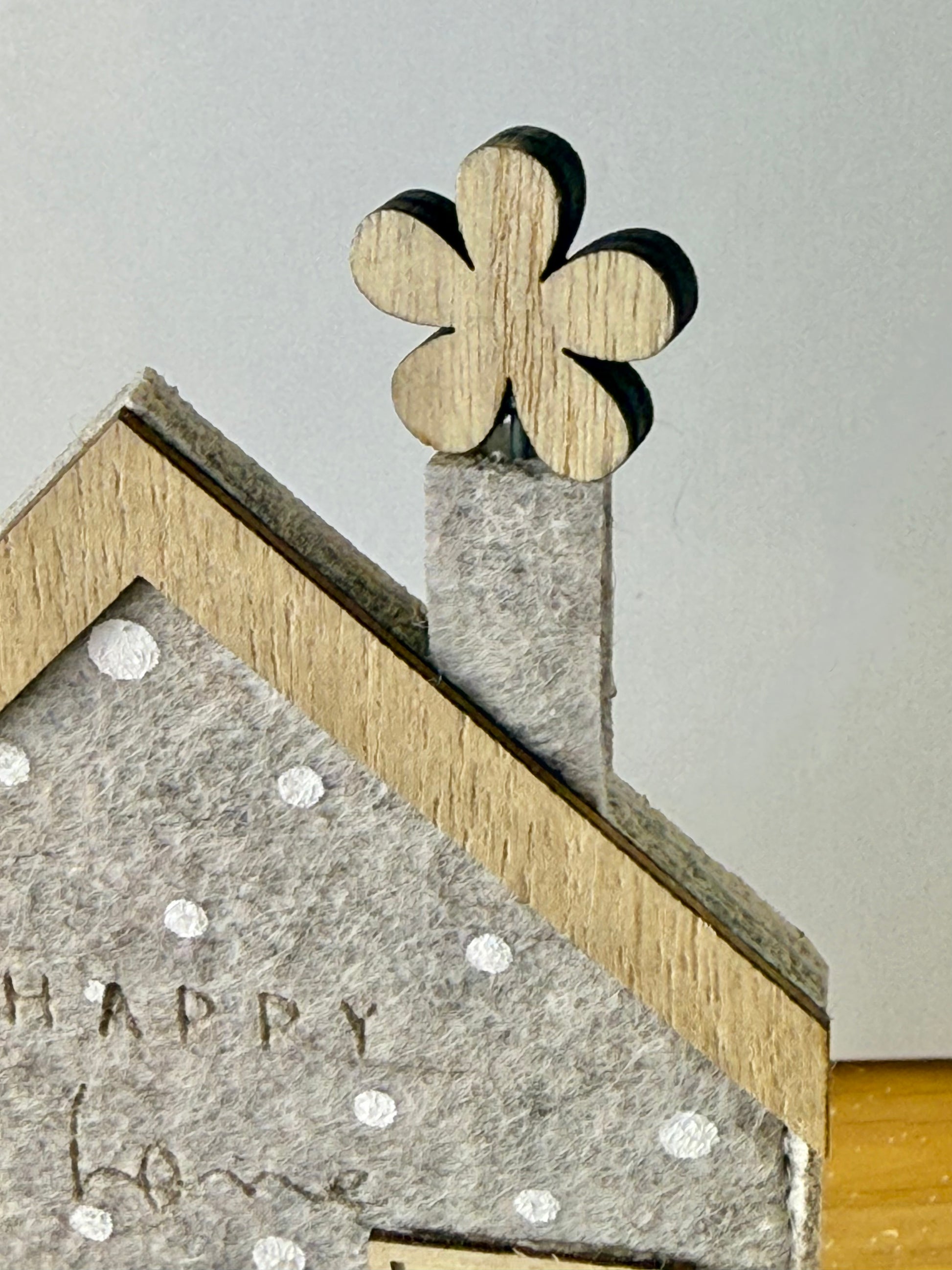 This one-of-a-kind piece boasts wooden flowers peeking out of the chimney, adding a whimsical touch to its brown felt exterior.