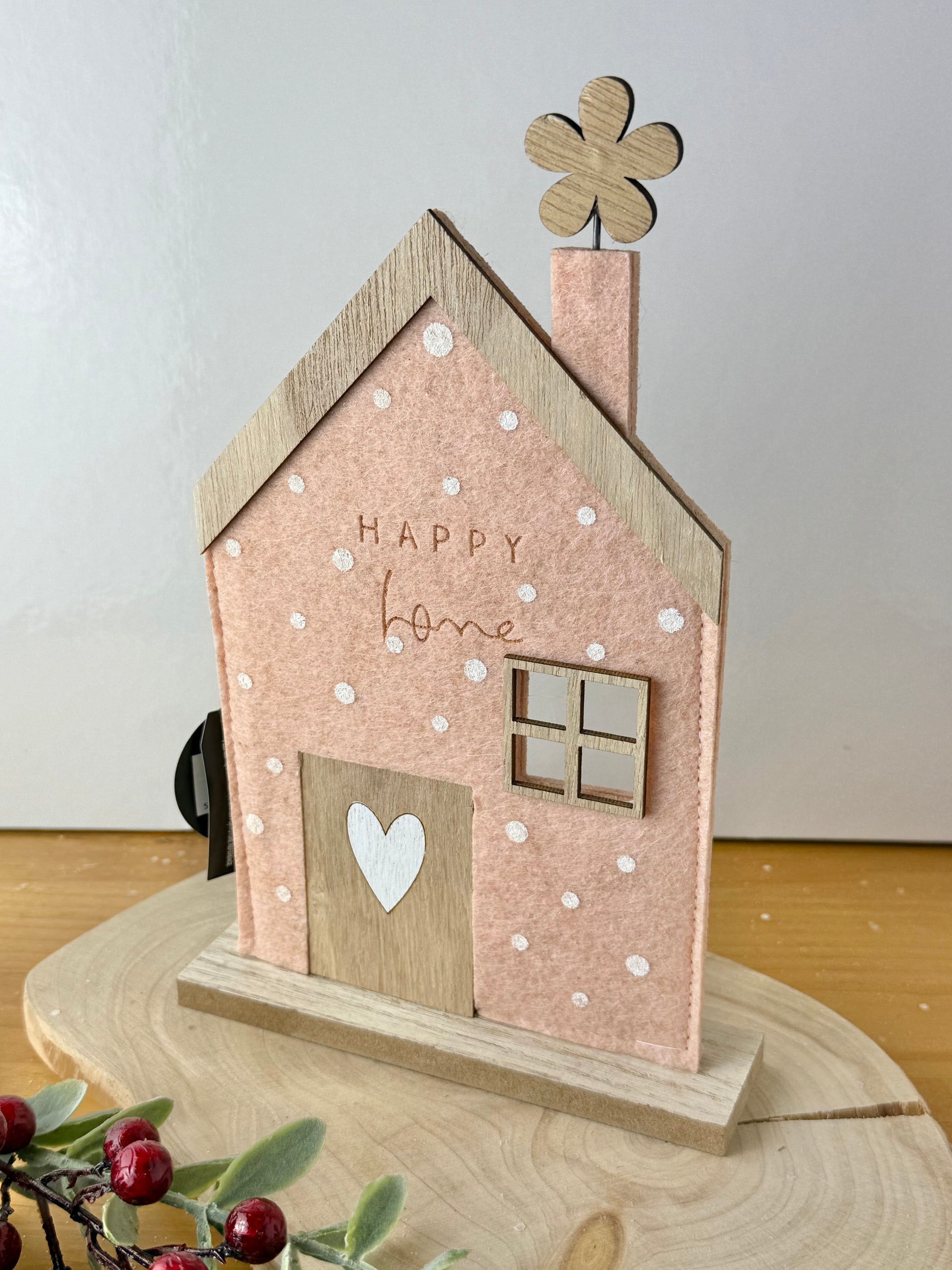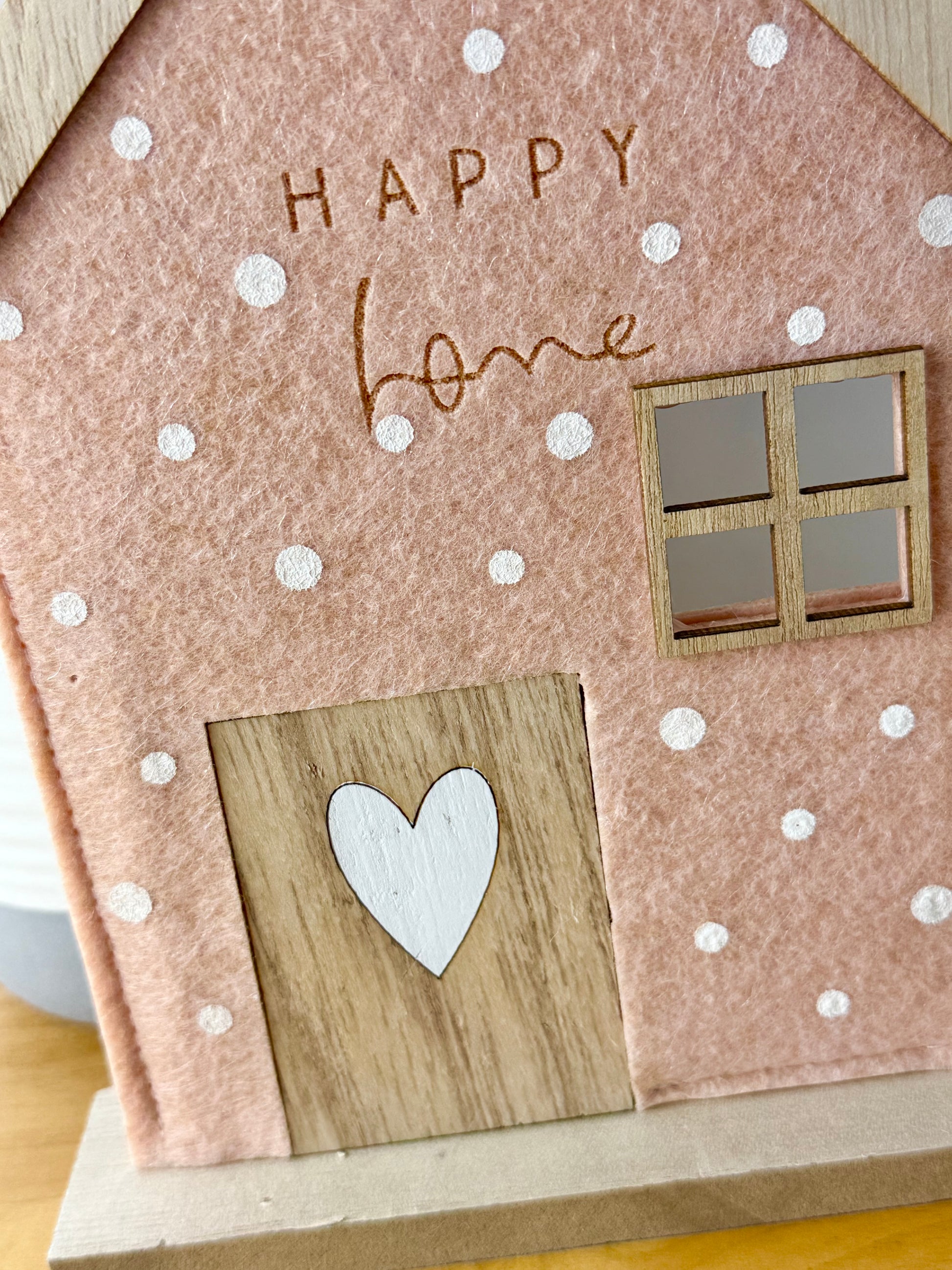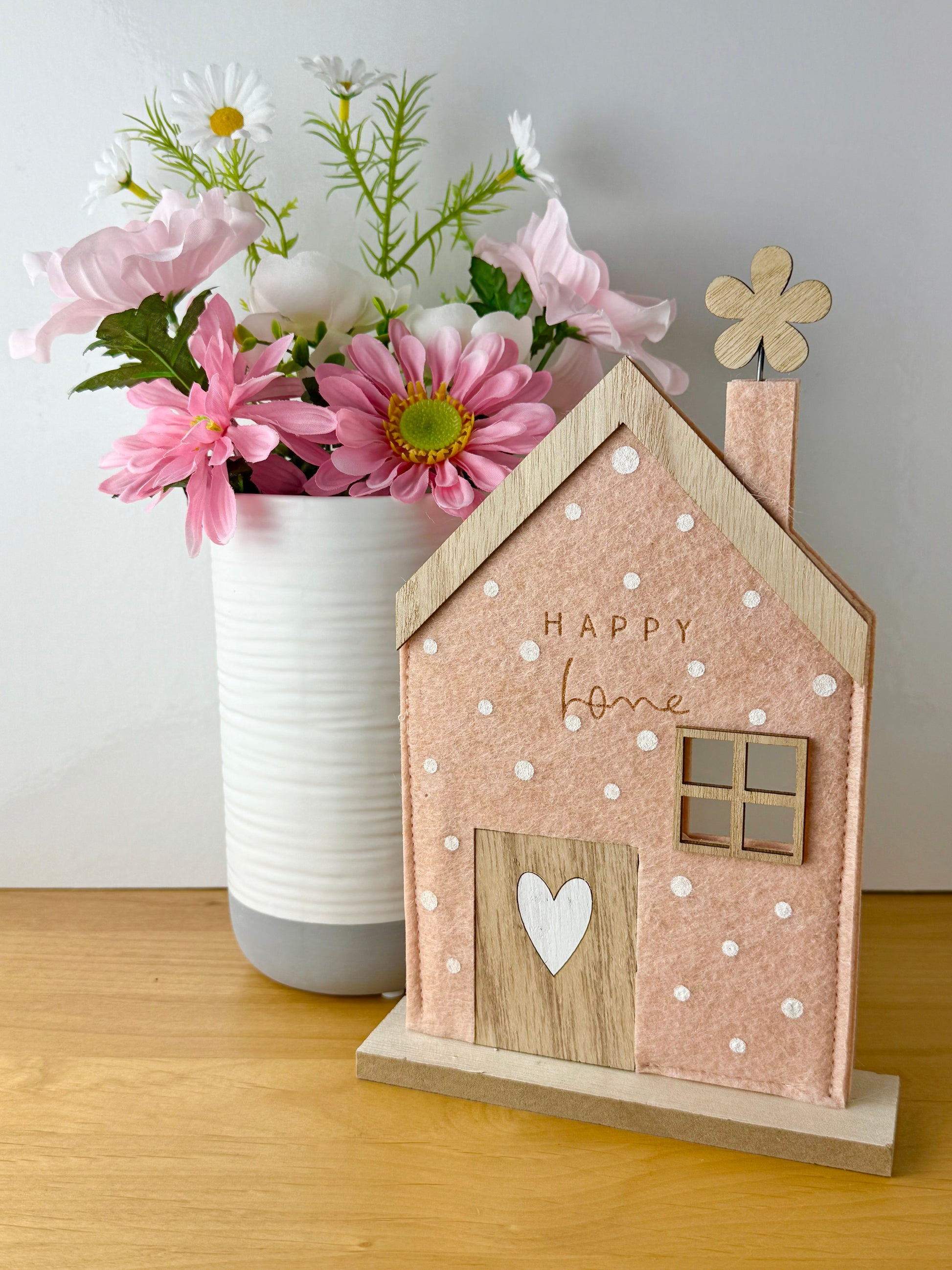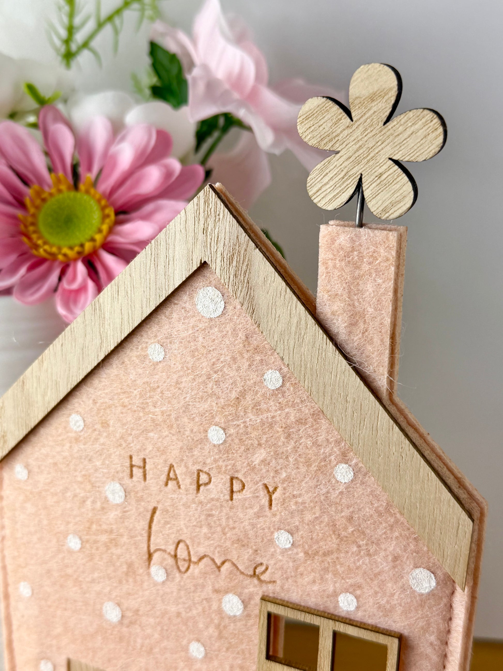 Introducing our delightful pink house, a modern addition to any household. Crafted from felt and wood, this ornament features the endearing phrase "Happy home" and is sure to bring a touch of charm to any room.