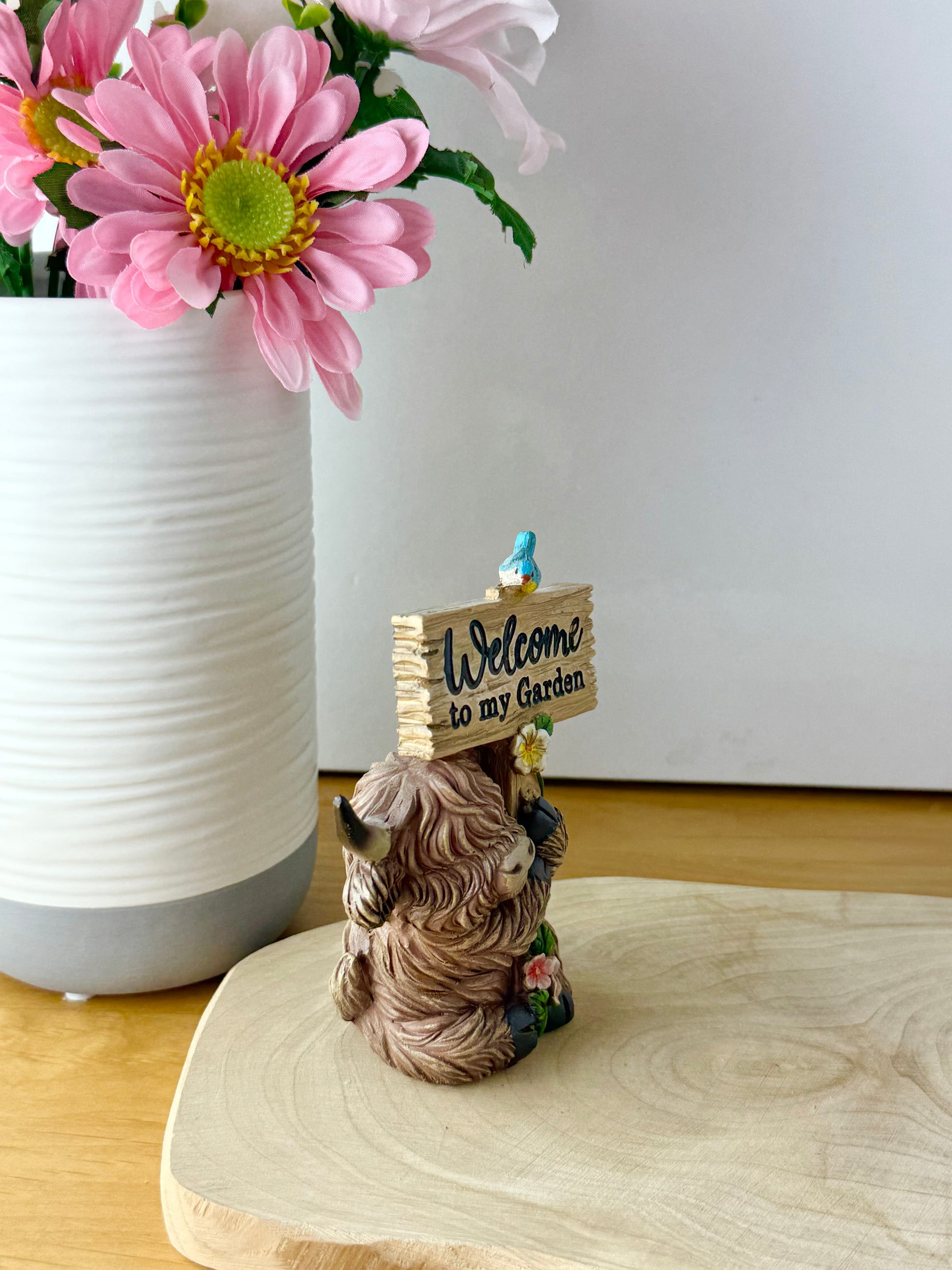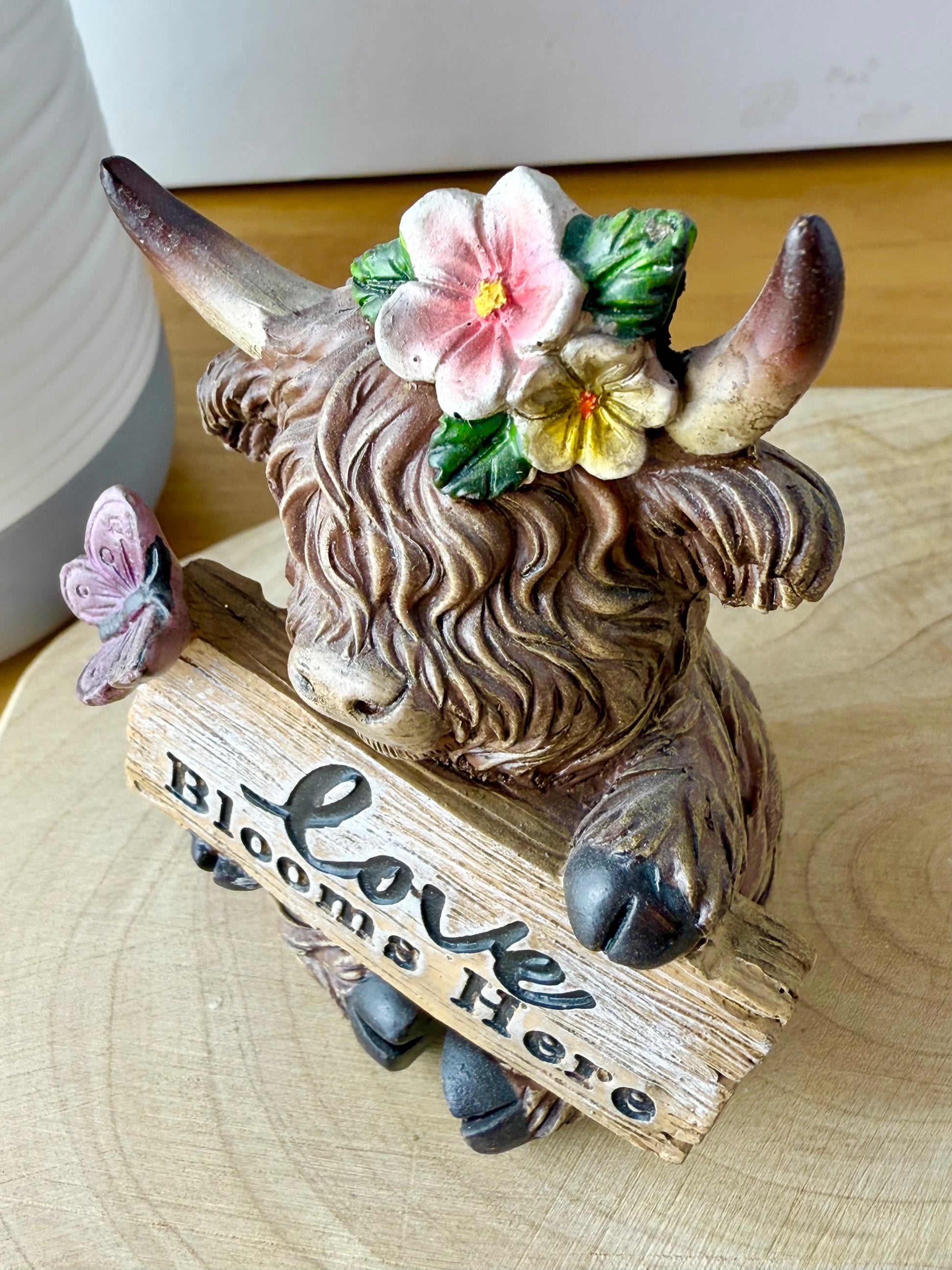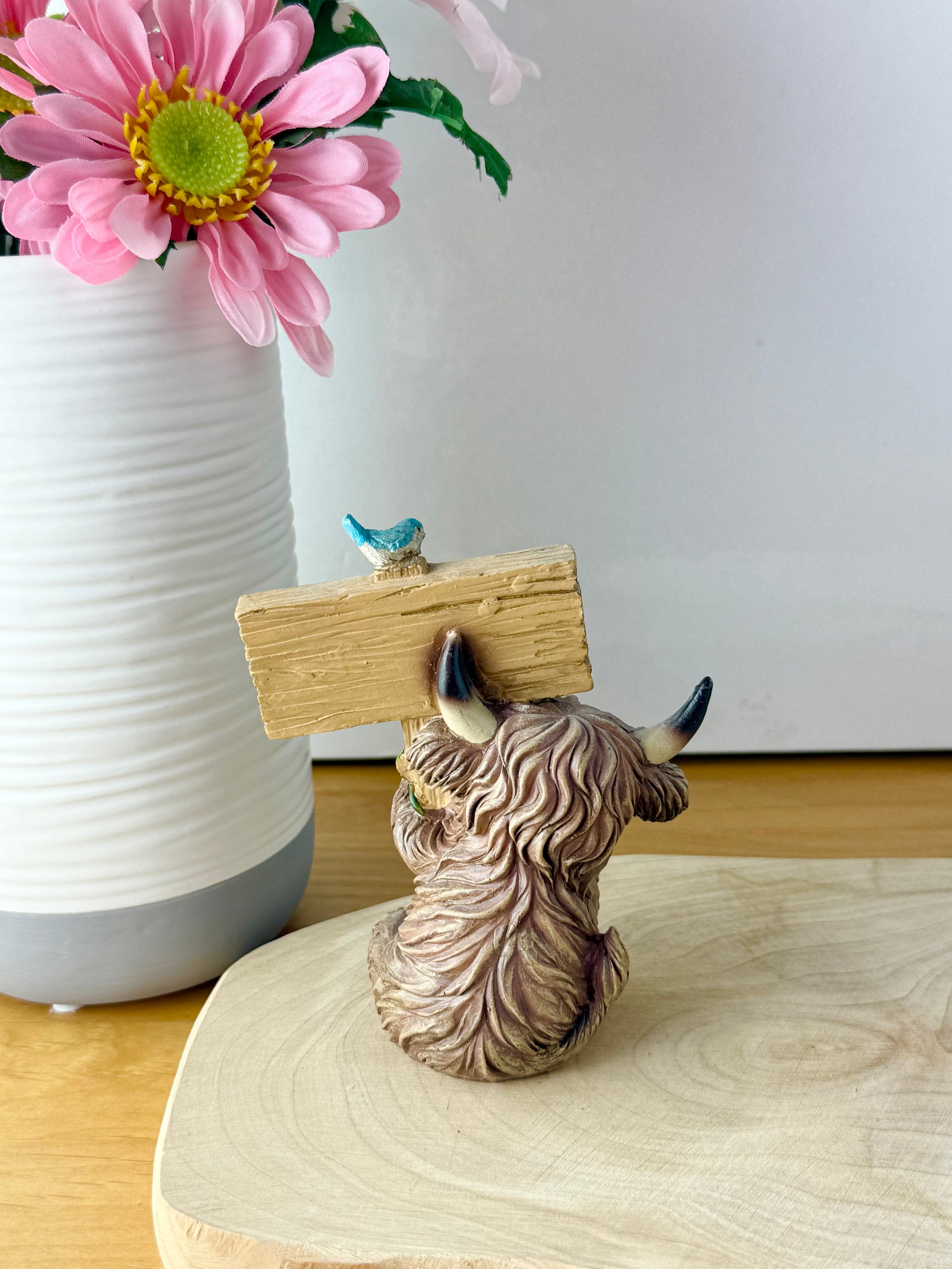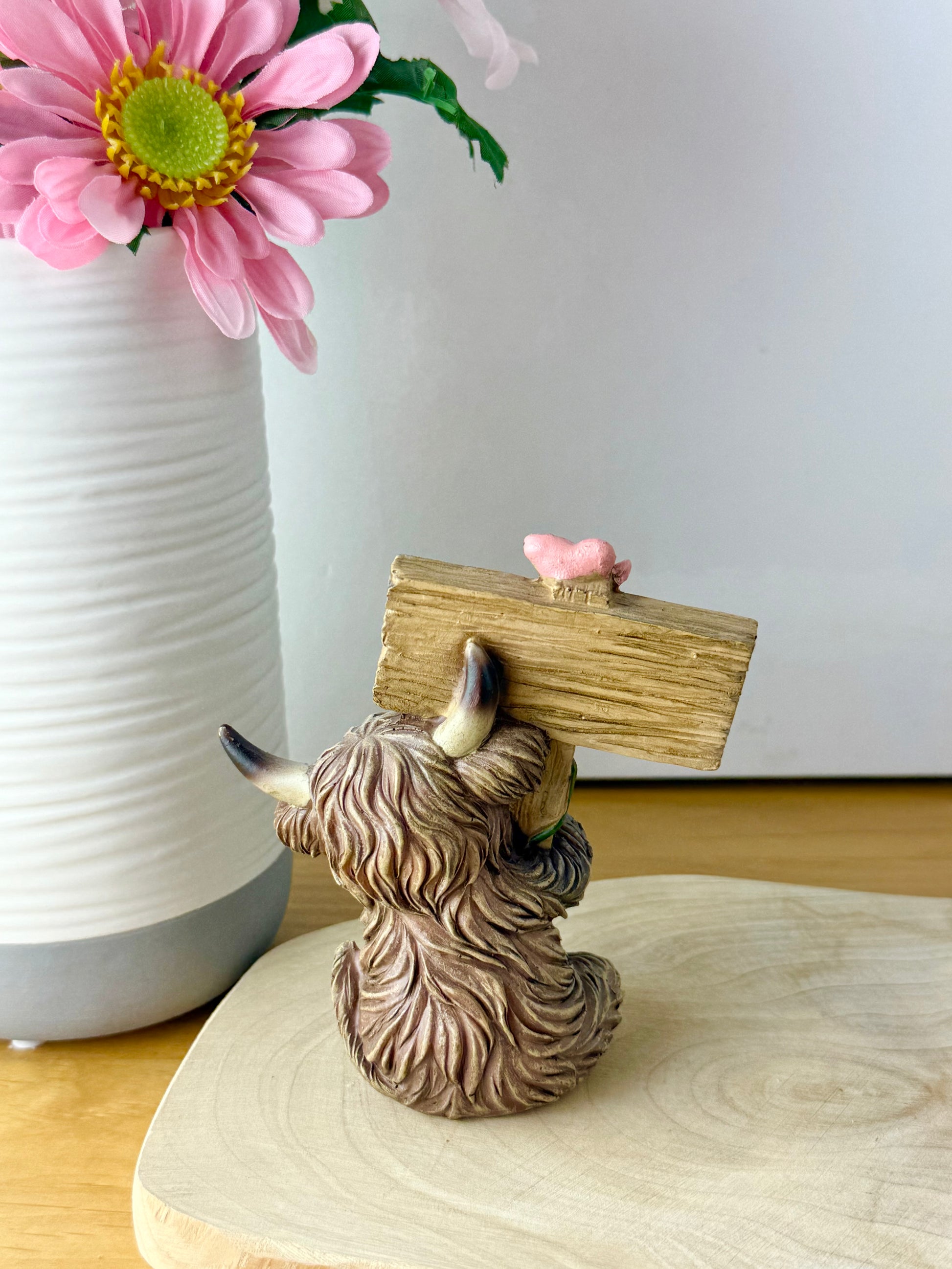 Small Highland Coos wearing flowers & signposts