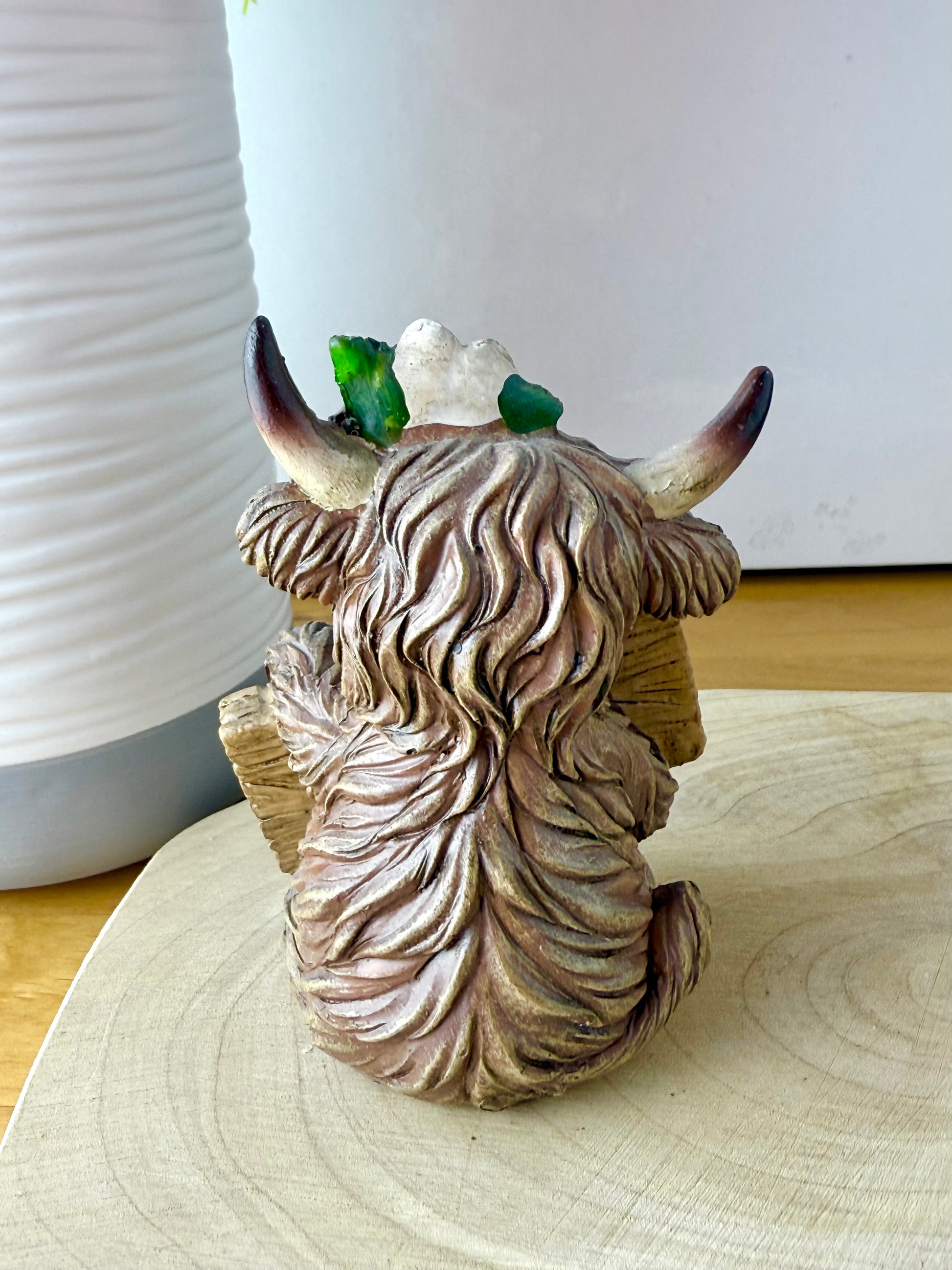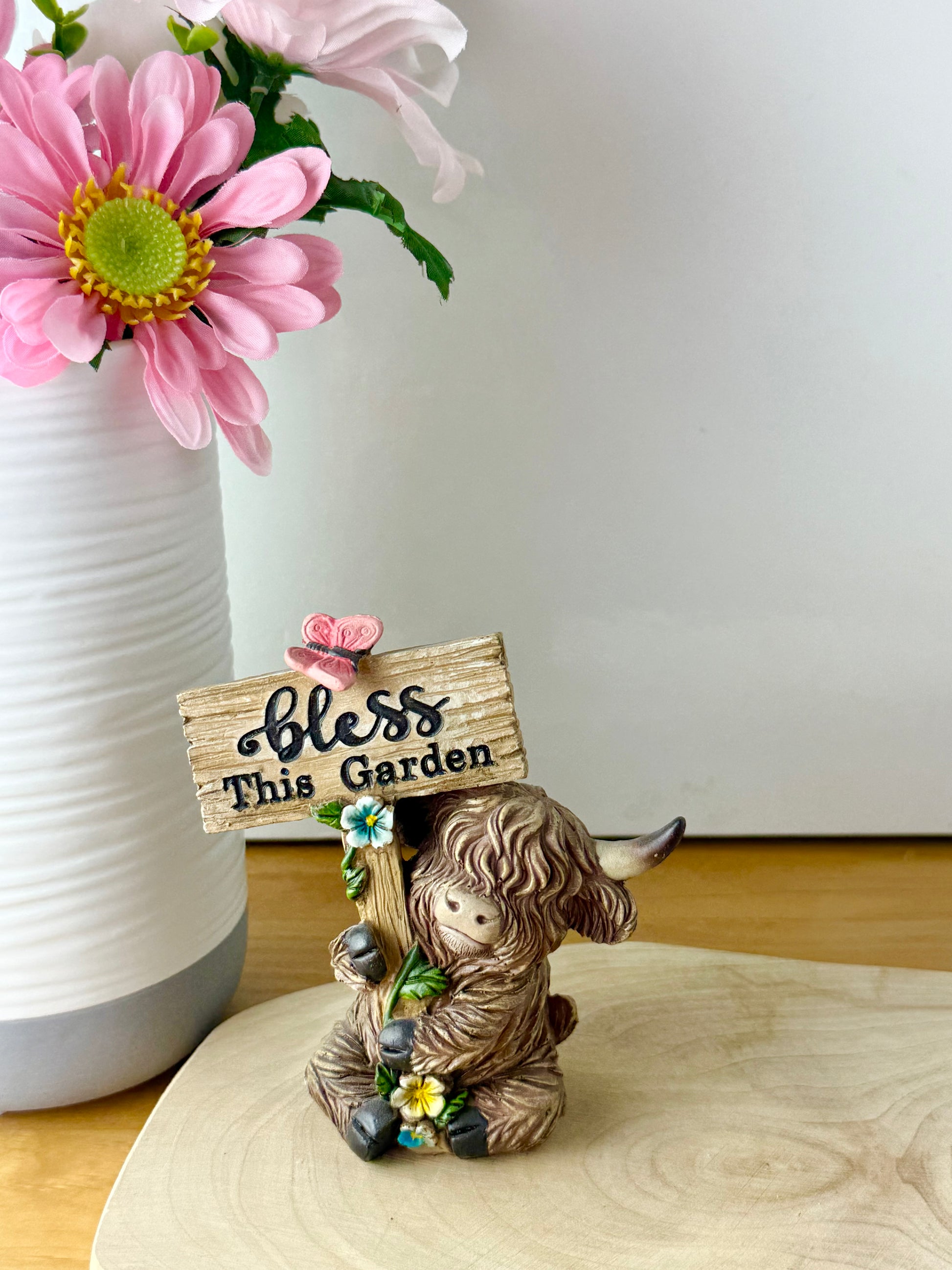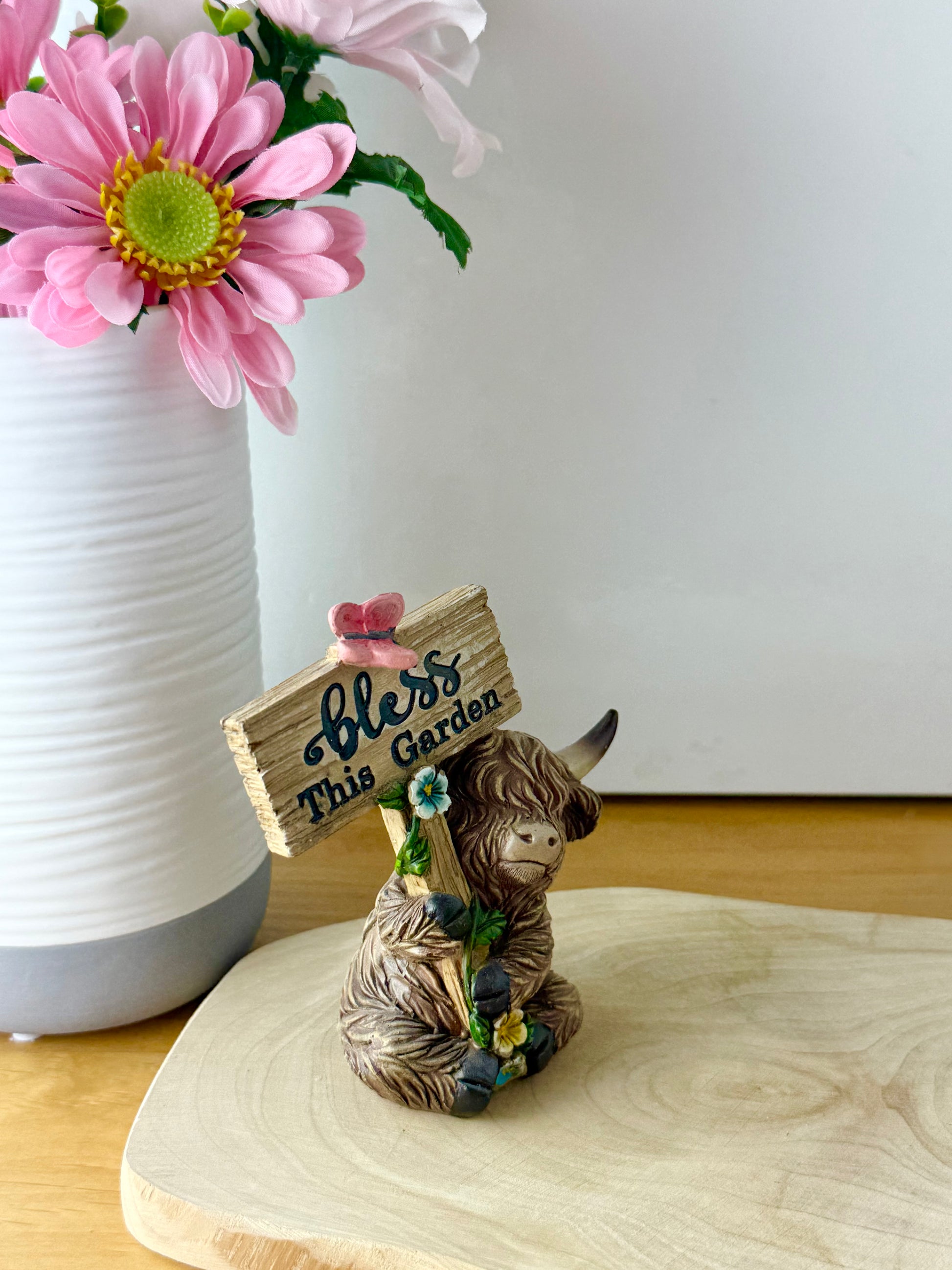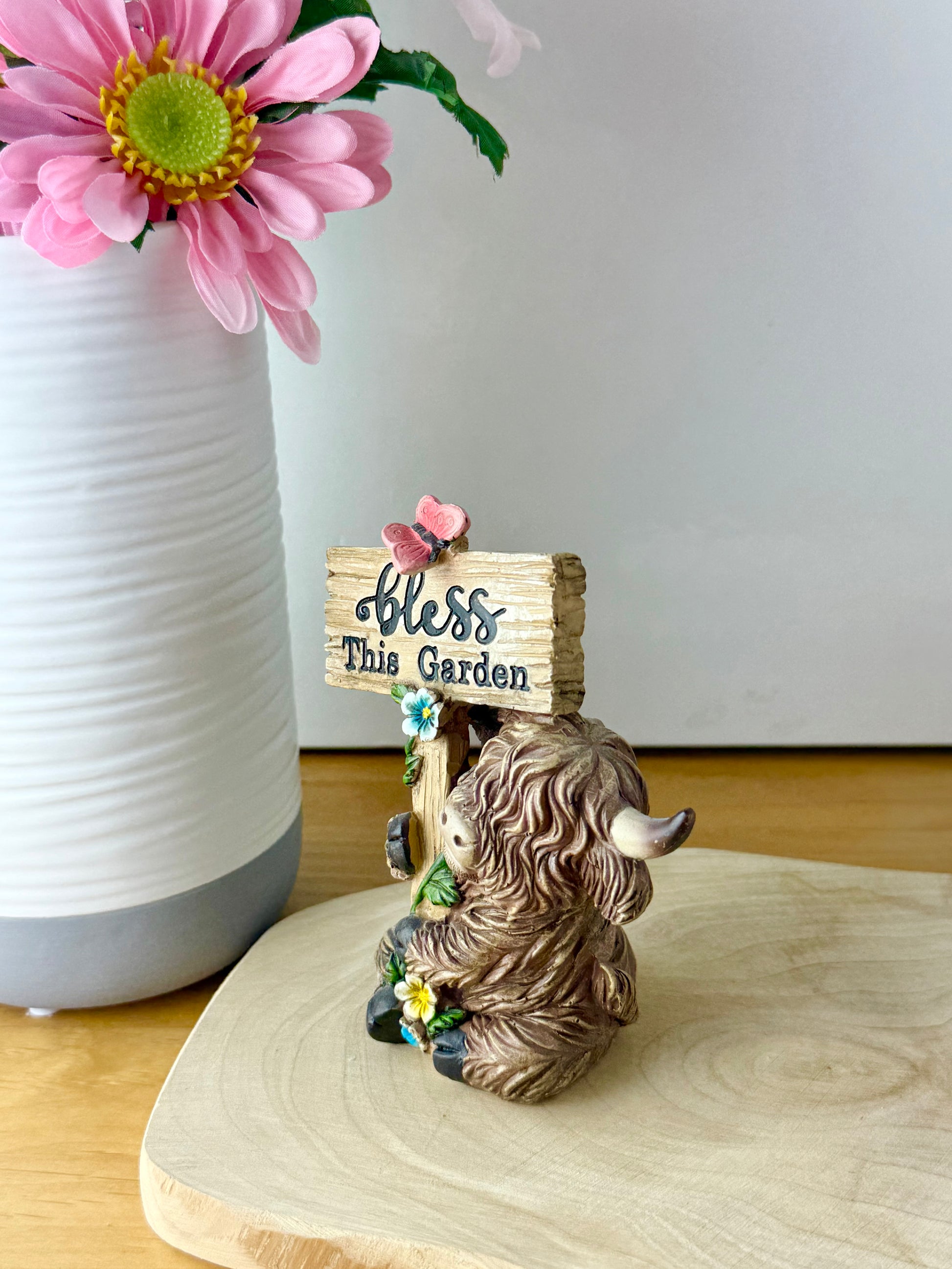 Small Highland Coos wearing flowers & signposts