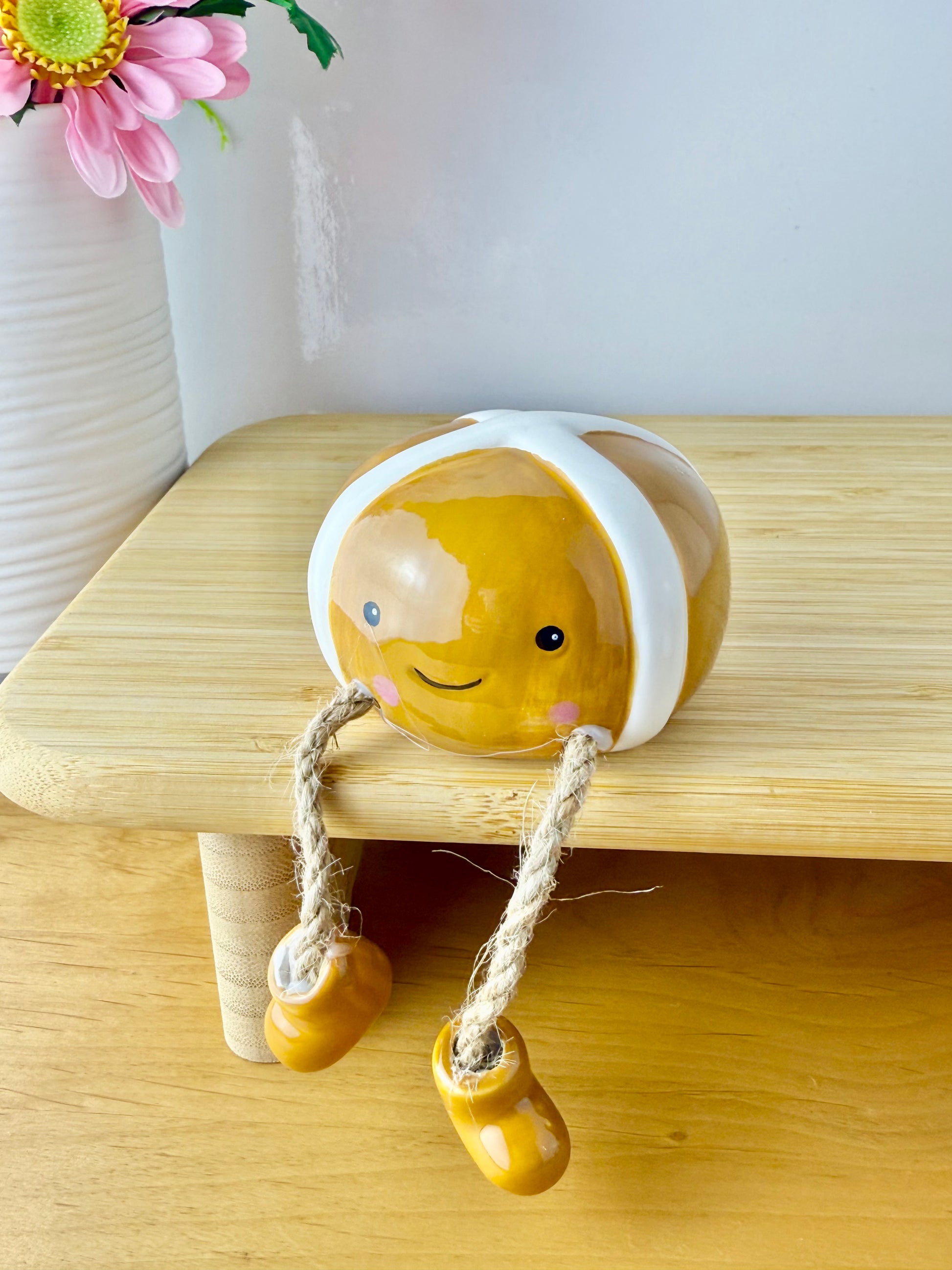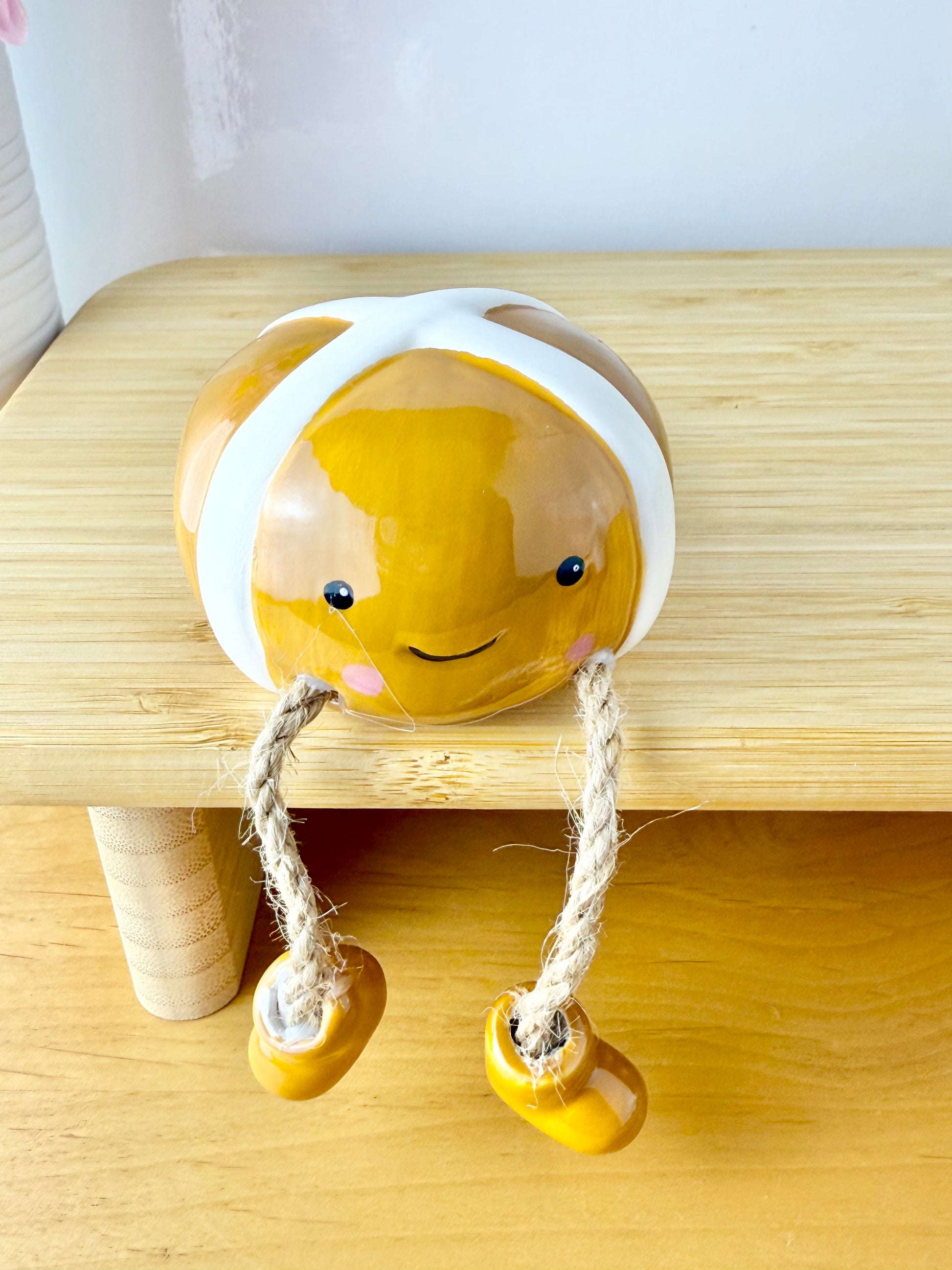 Ceramic Hot Cross bun with dangley legs perfect for sitting on a shelft or sideboard to add some fun for easter.