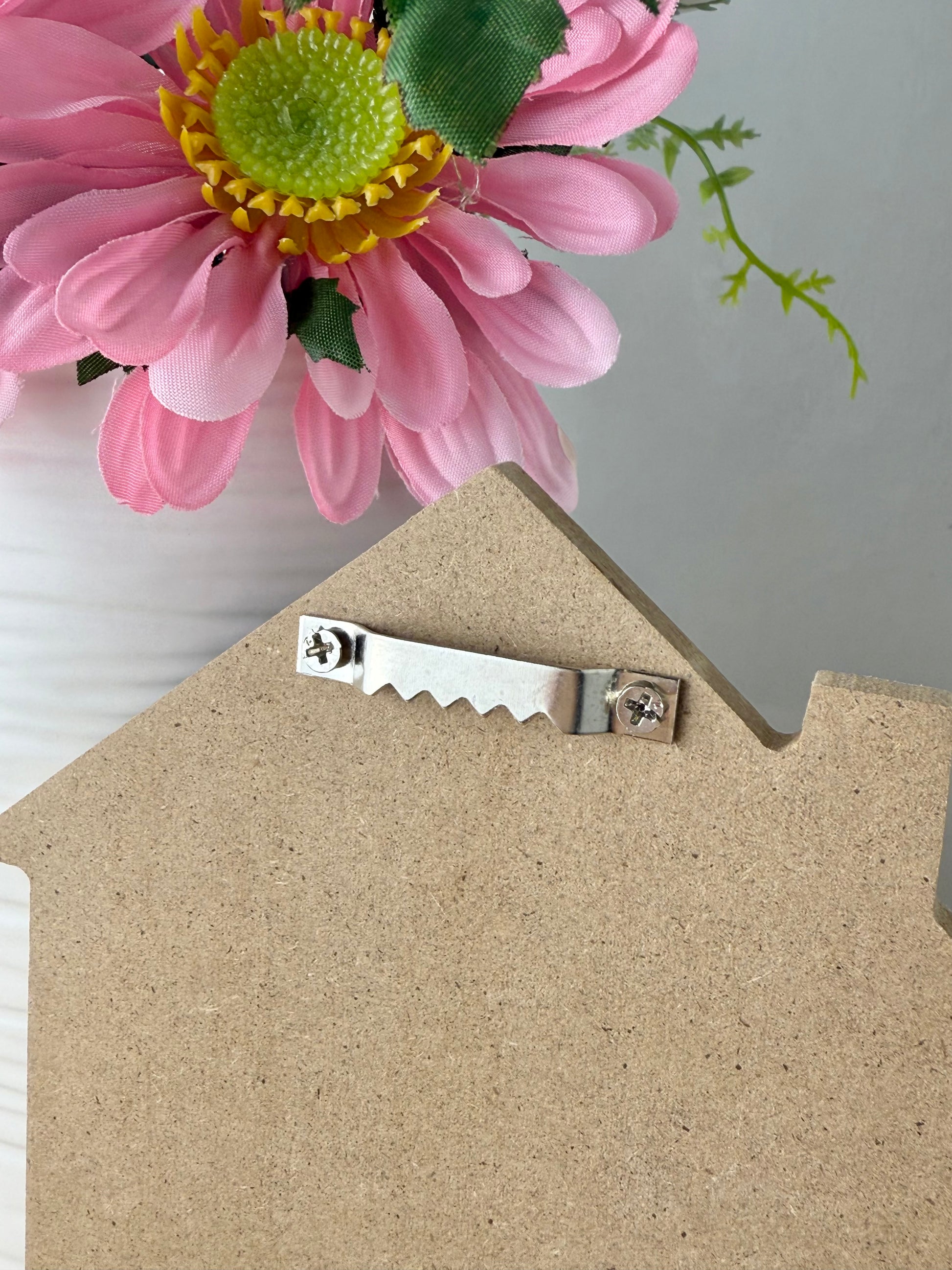 A quirky natural wooden house shaped plaque decorated with a humorous saying, the word Dog is 3D
