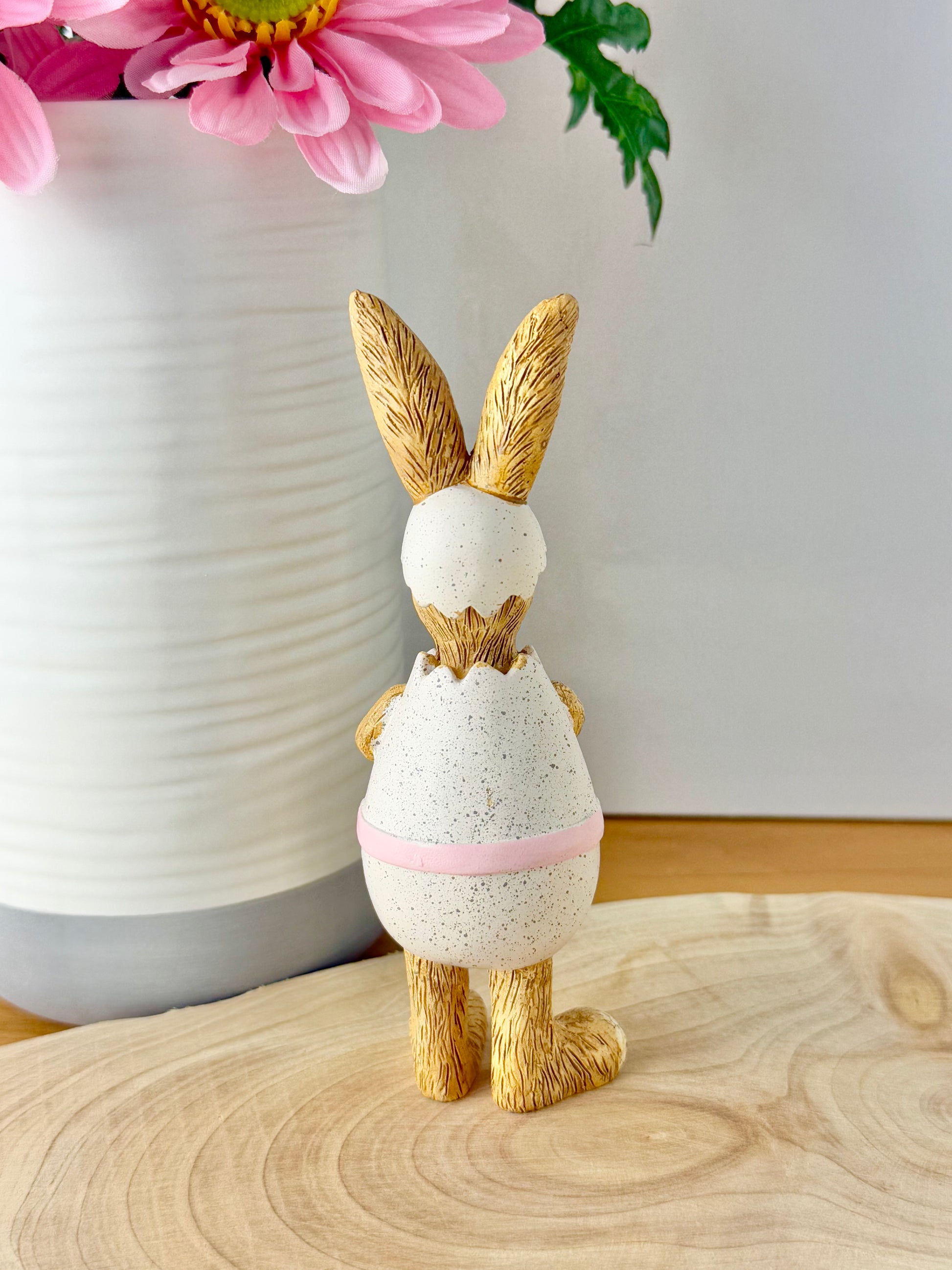 An adorably charming resin rabbit with speckled pink egg costume is perfect for adding a touch of fun to the home this Easter.