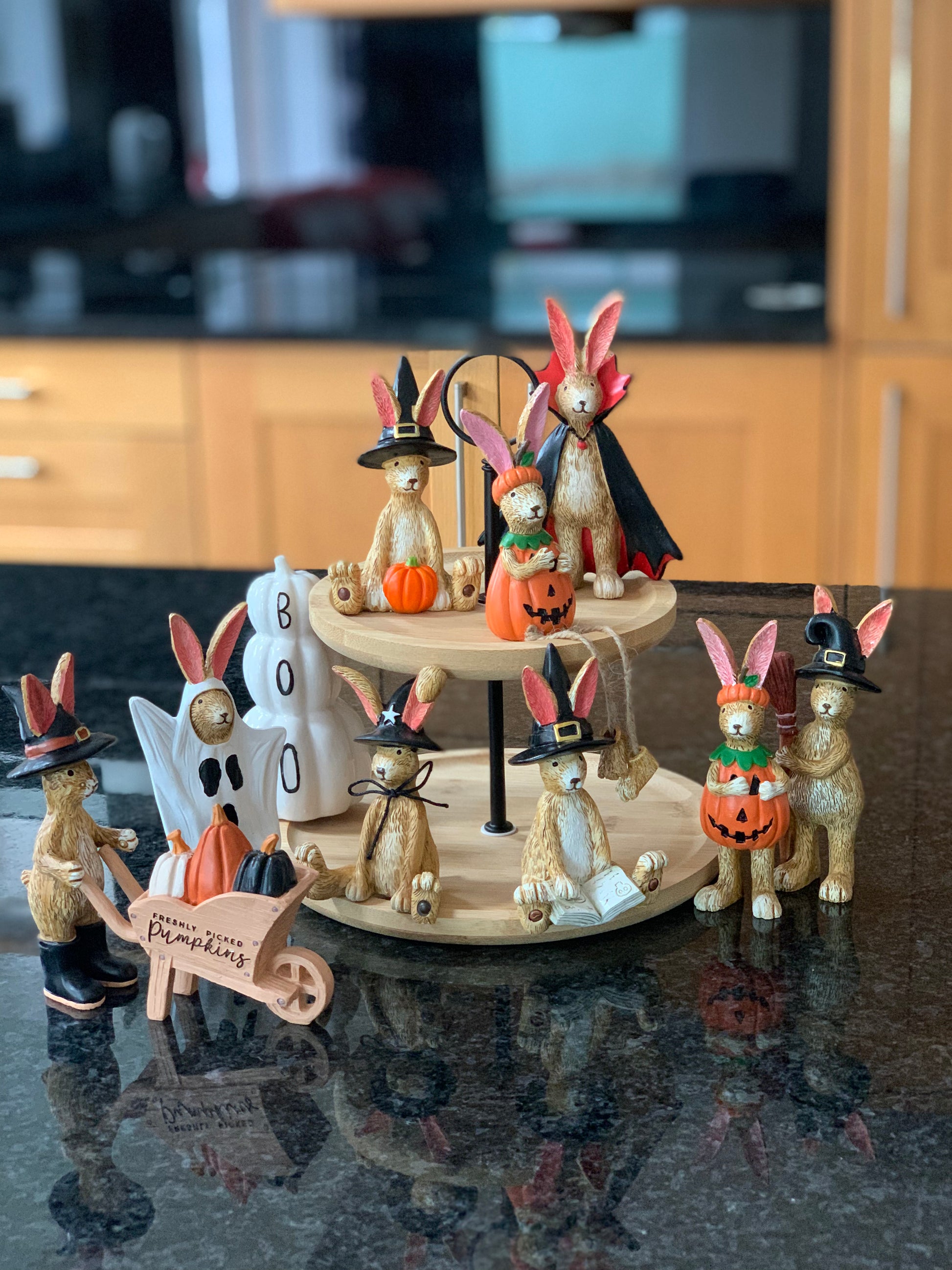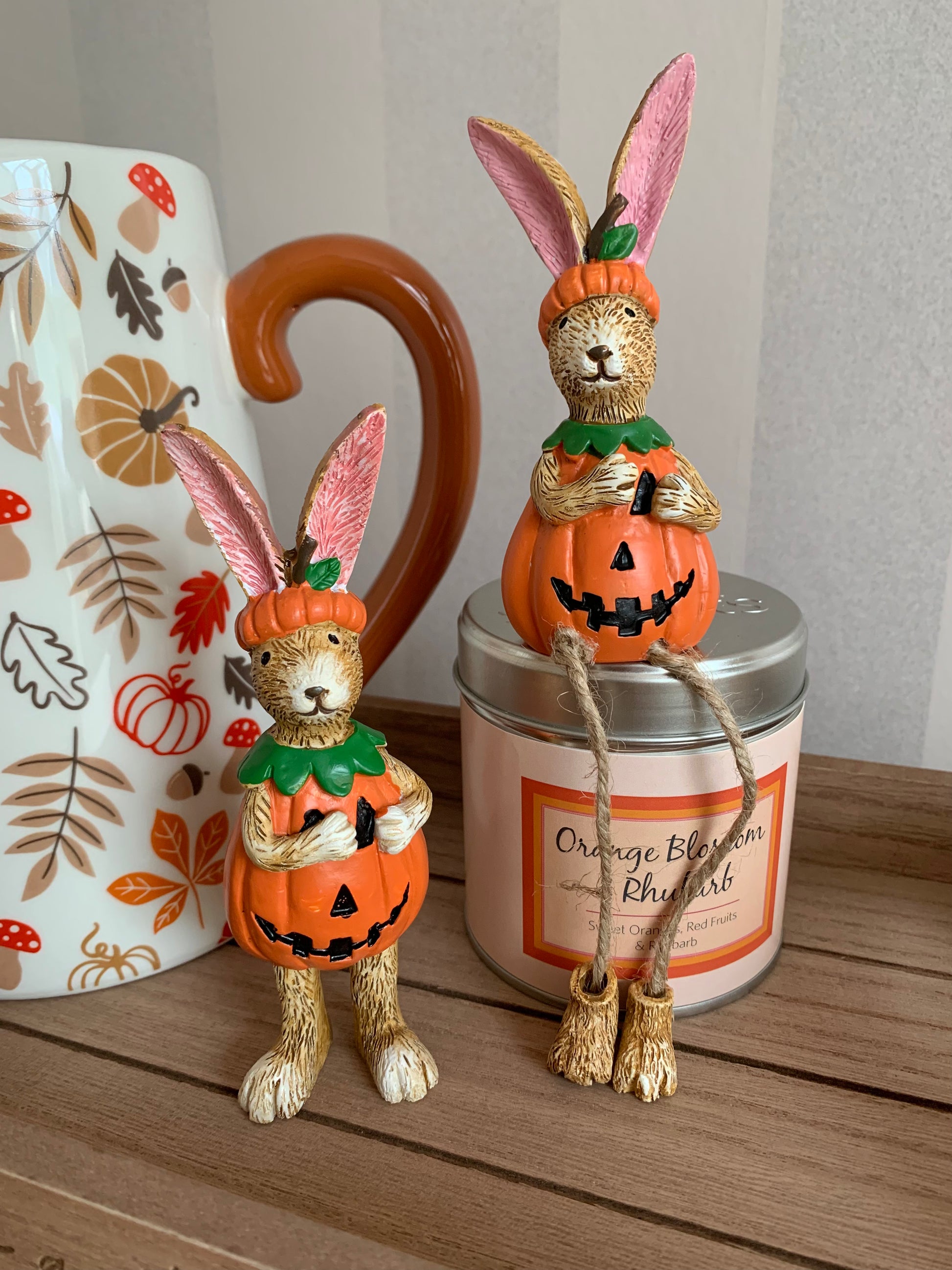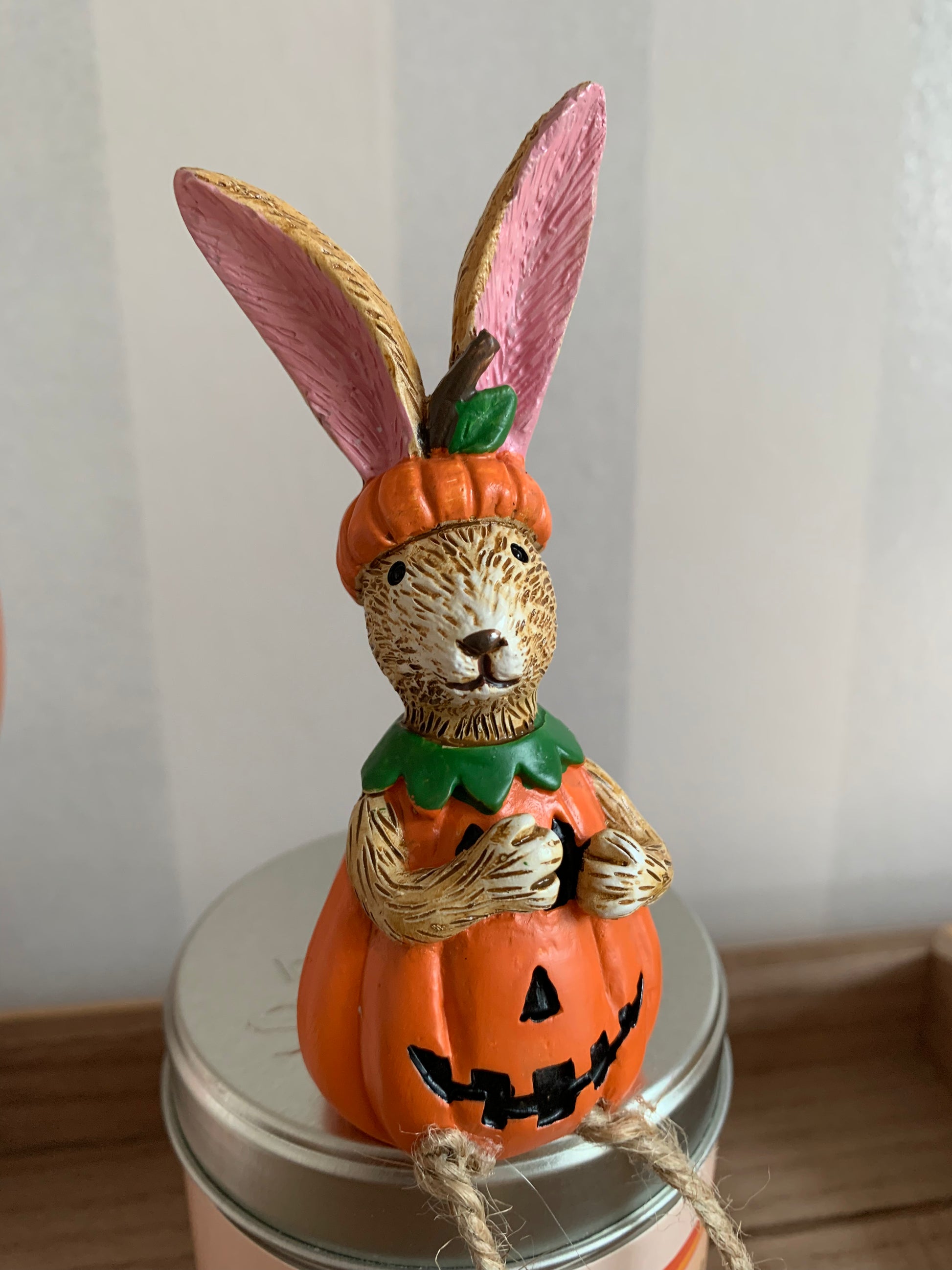 An adorable shelf sitting rabbit in a pumpkin costume. Complete with jute string dangly legs and a beautifully crafted textured finish.