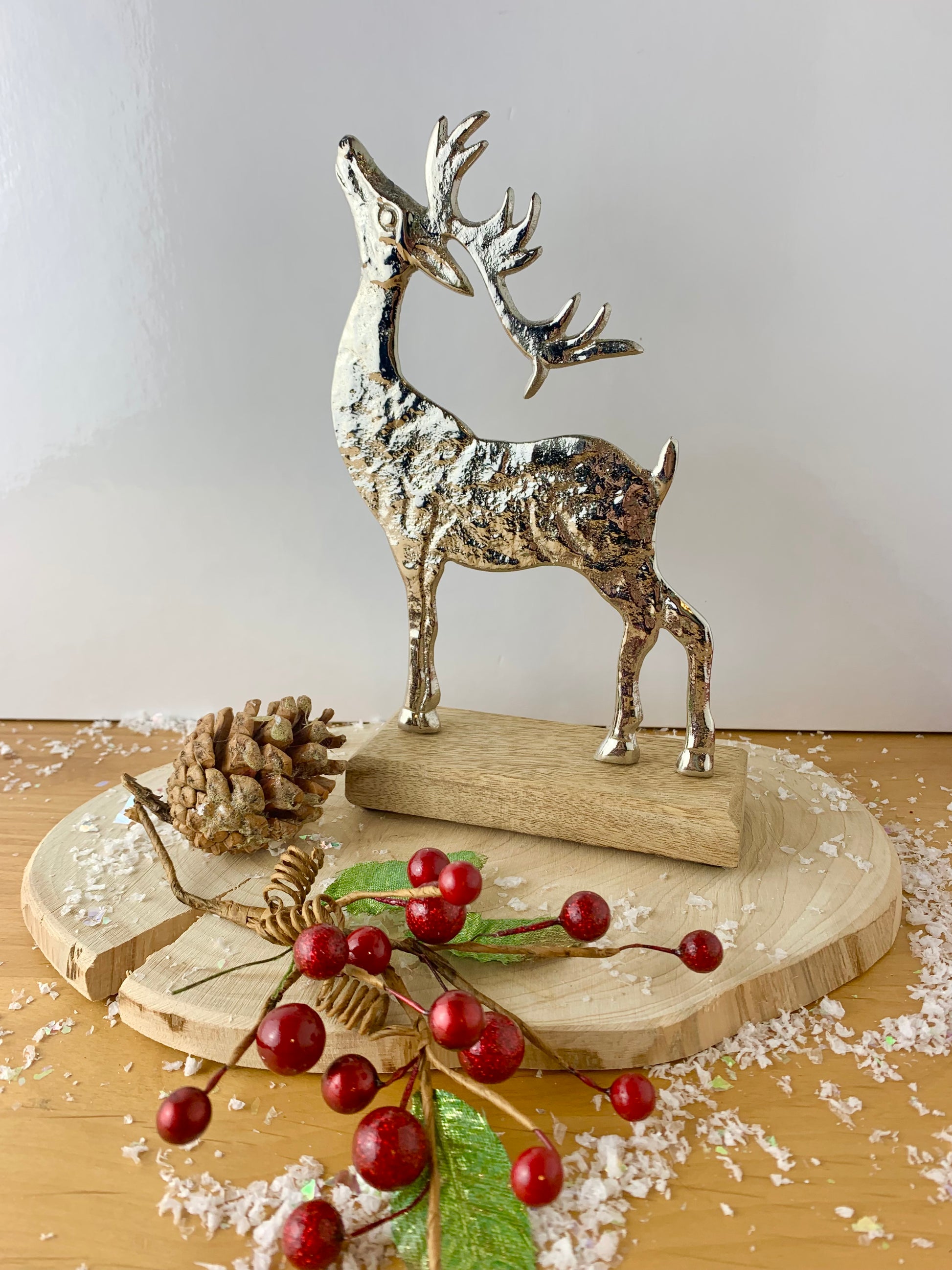 Highly Detailed Silver Reindeer With Large Antlers Stood On Thick Wooden Base With 1 Front Leg Raised