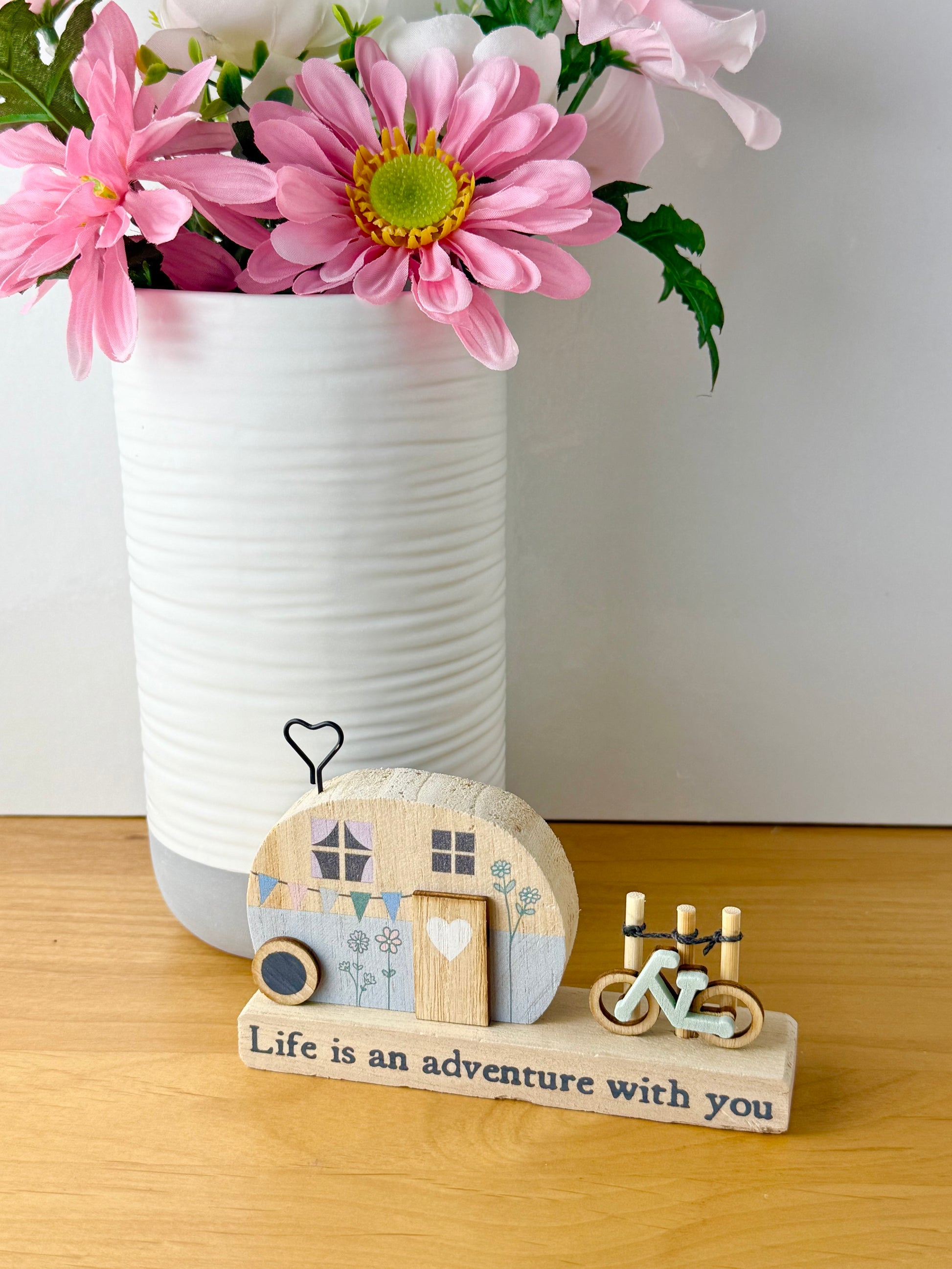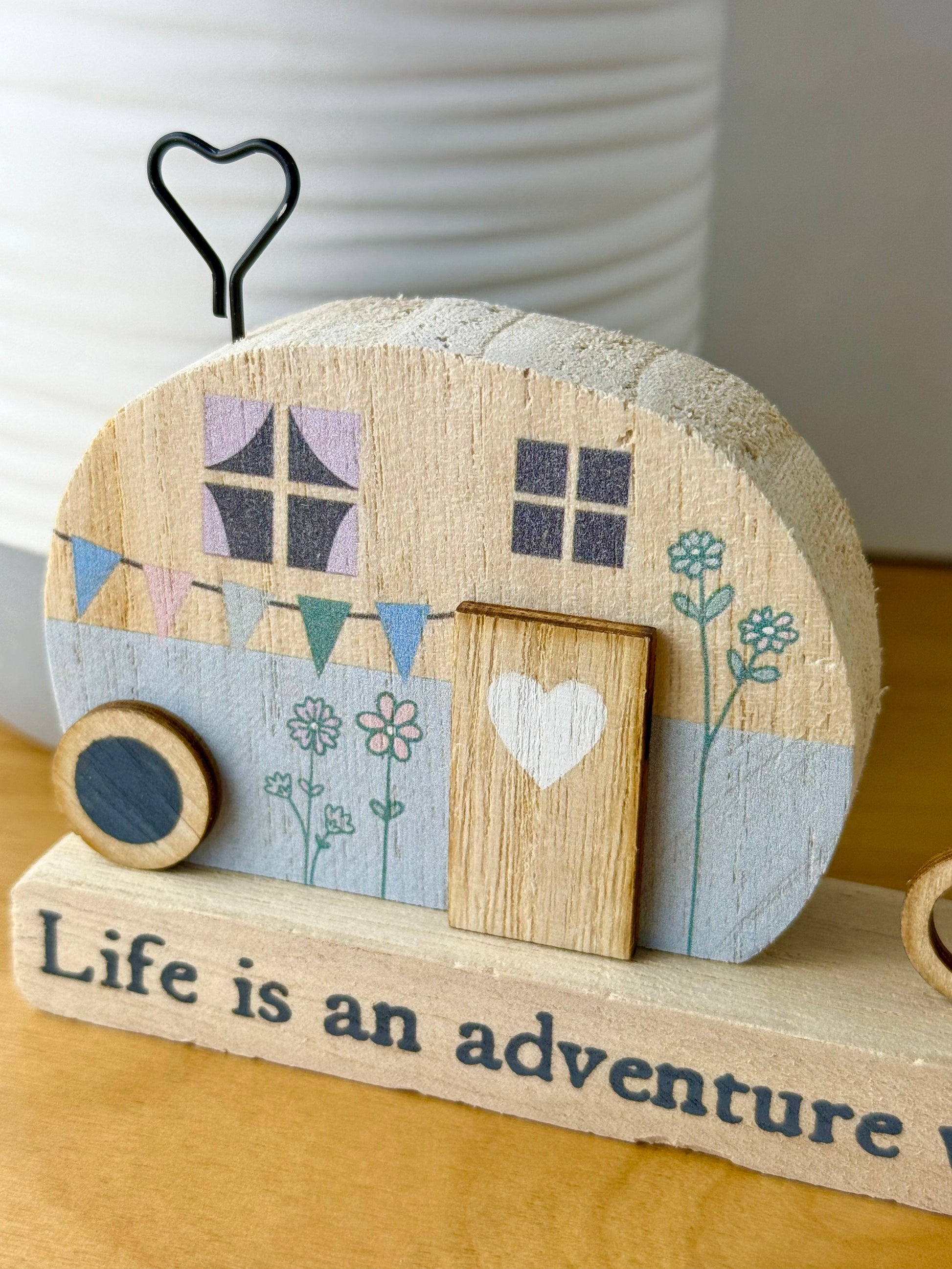 A cute wooden decoration of a vintage caravan on a stand with the wording "Life is an adventure with you" across the bottom. A charming little item to display in the home.