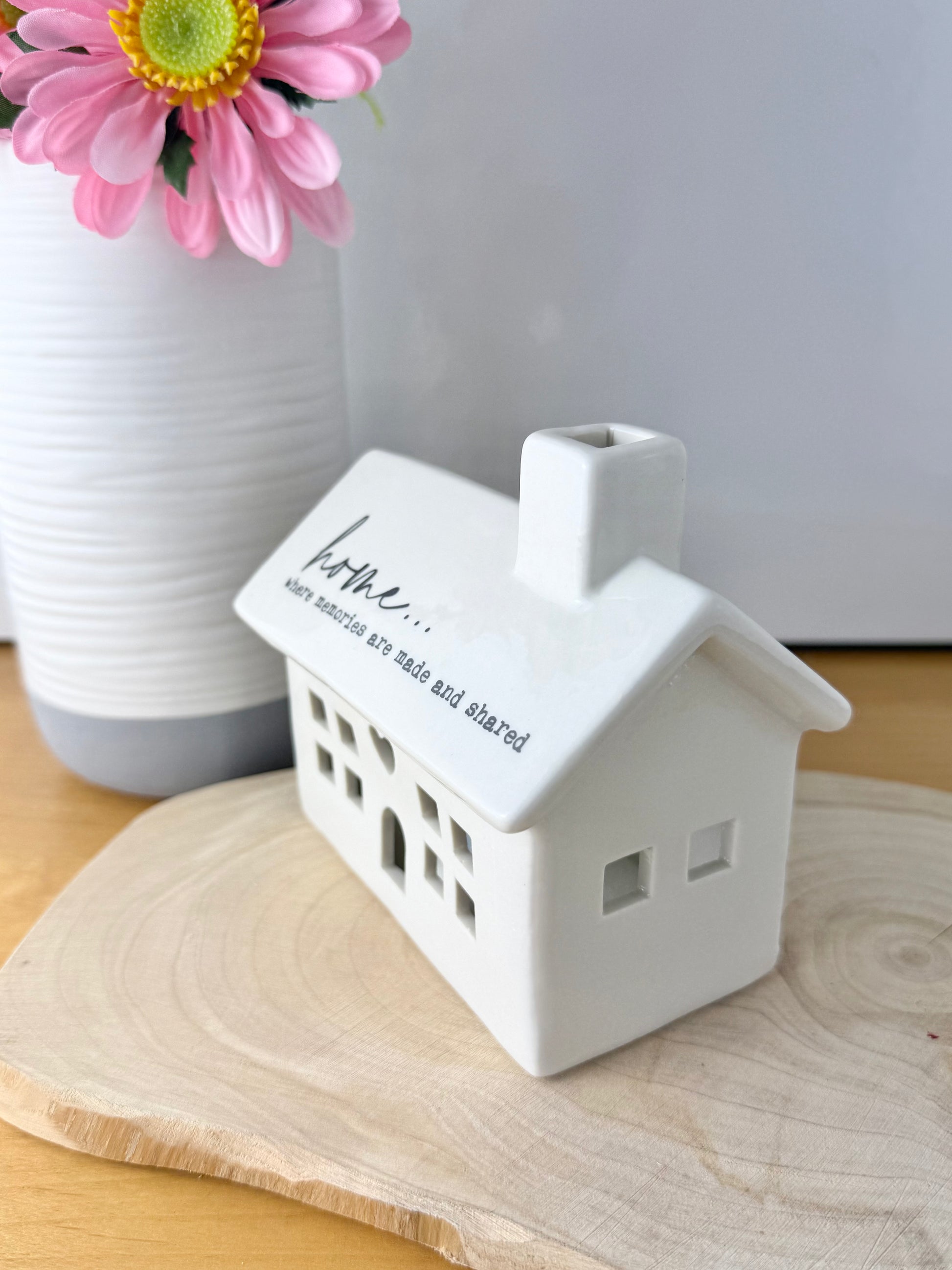 Crafted from delicate porcelain showcases the quote "Home is where memories are made and shared"