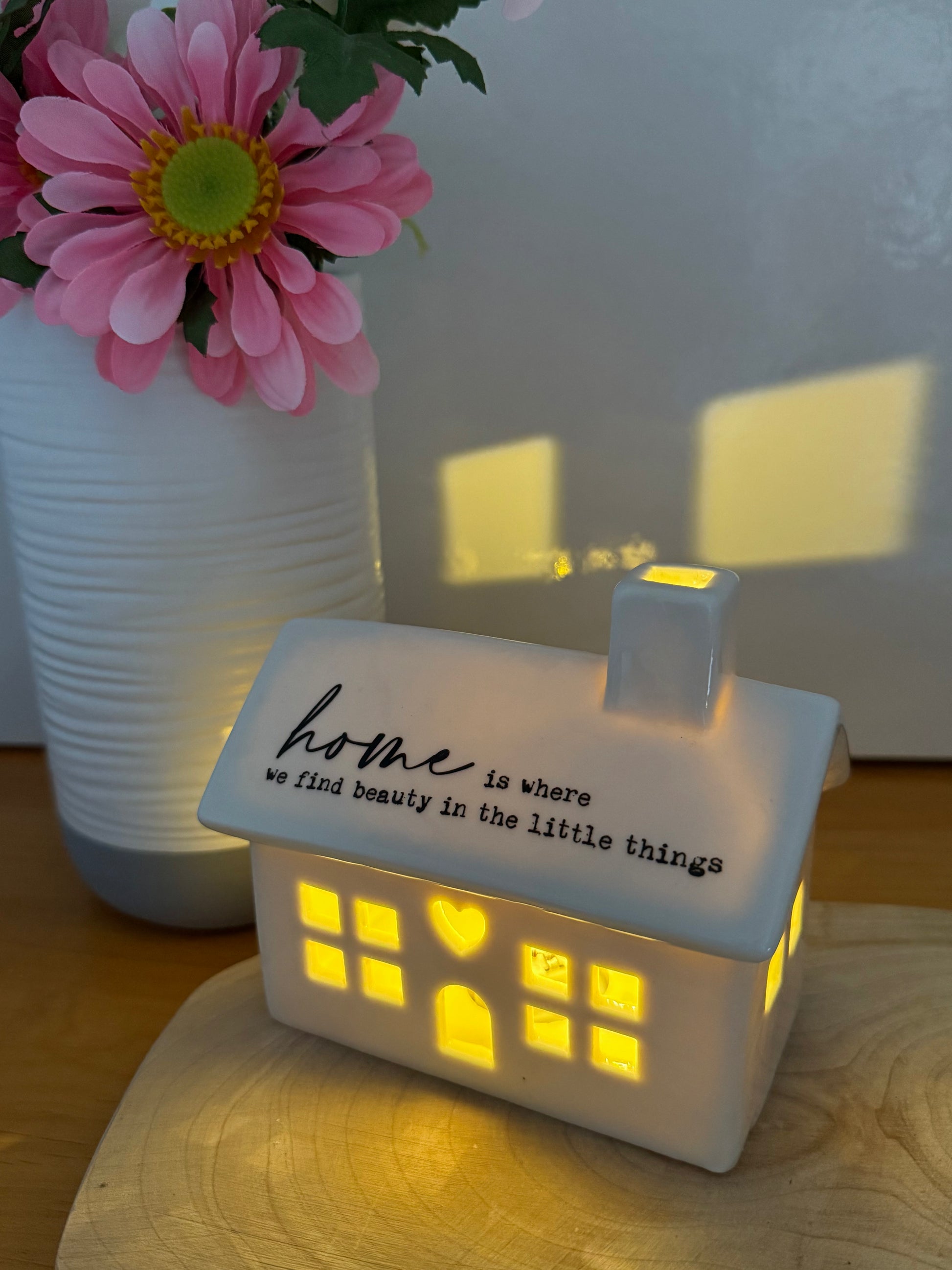 Crafted from delicate porcelain showcases the quote "Home Is Where We Find Beauty In The Little Things"