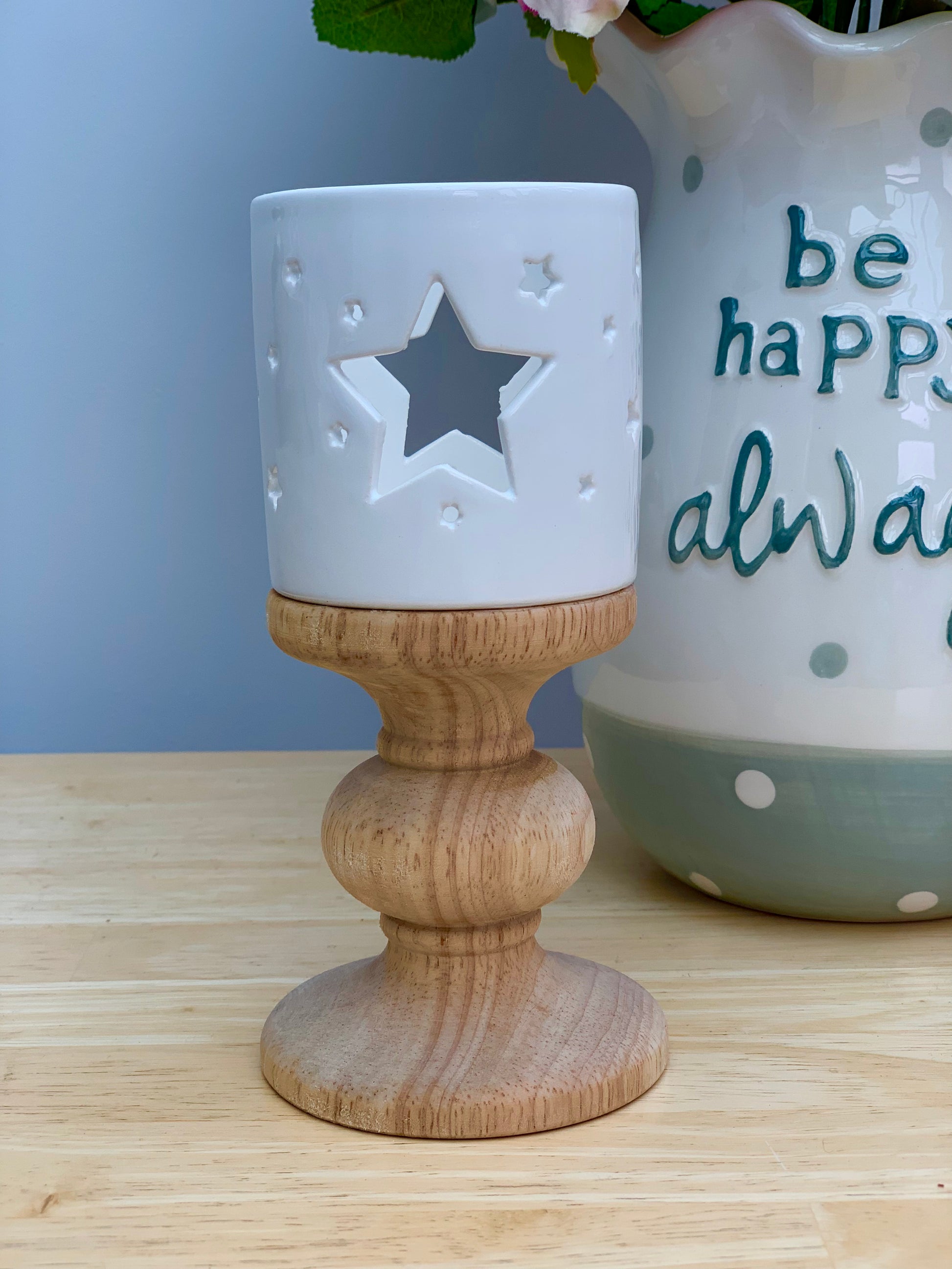 A natural mango wooden stand with white ceramic holder with star cut outs.