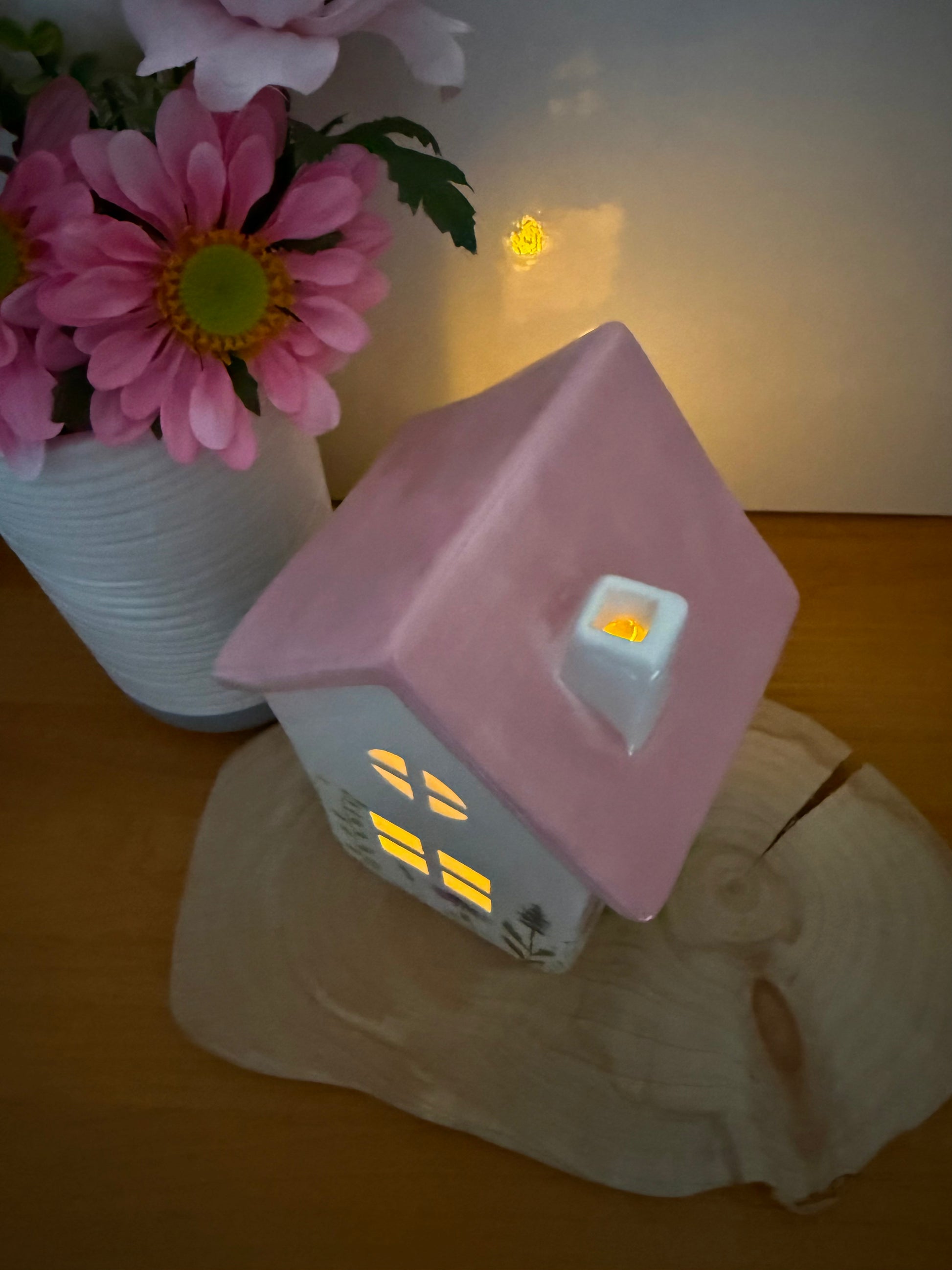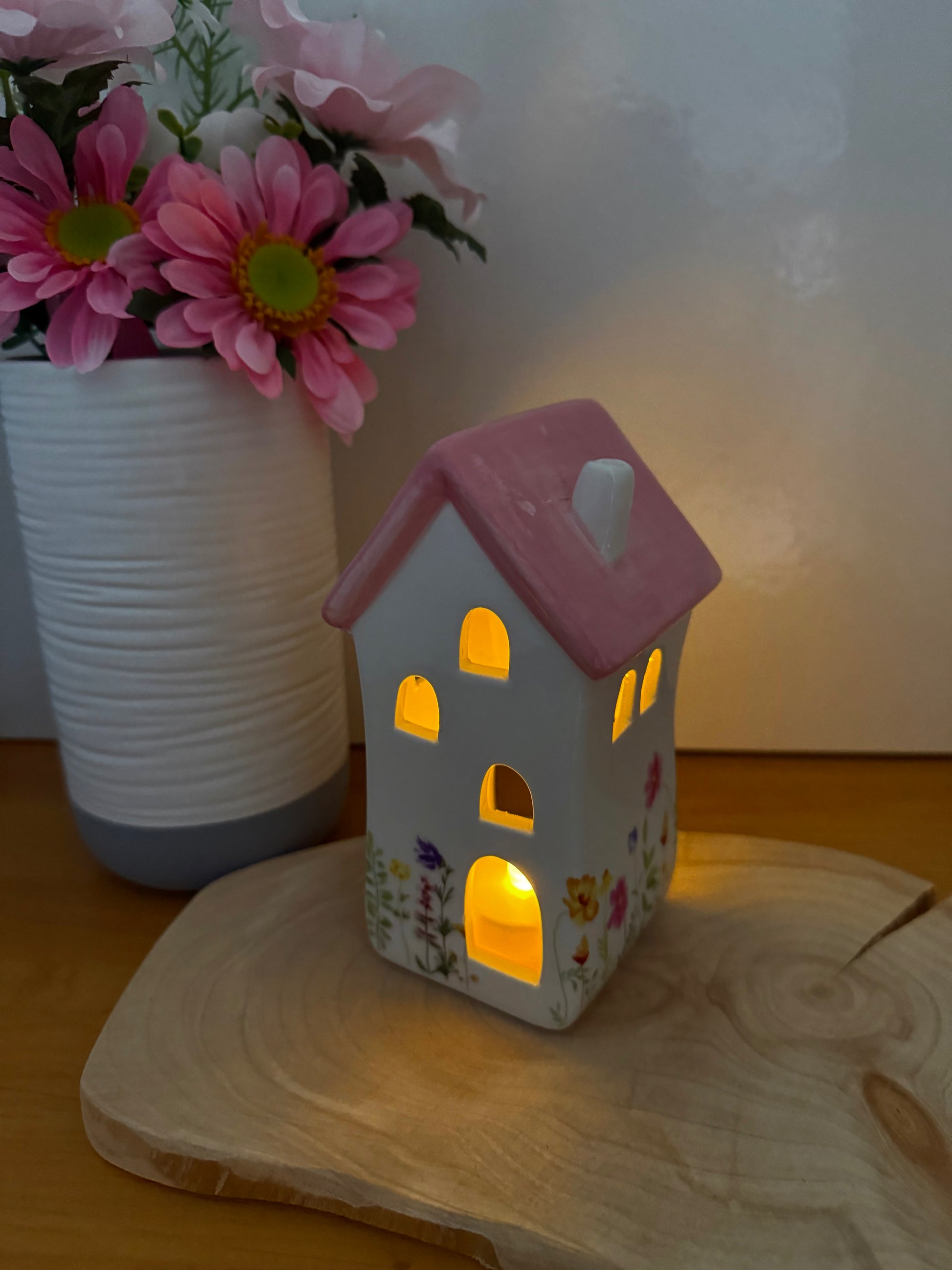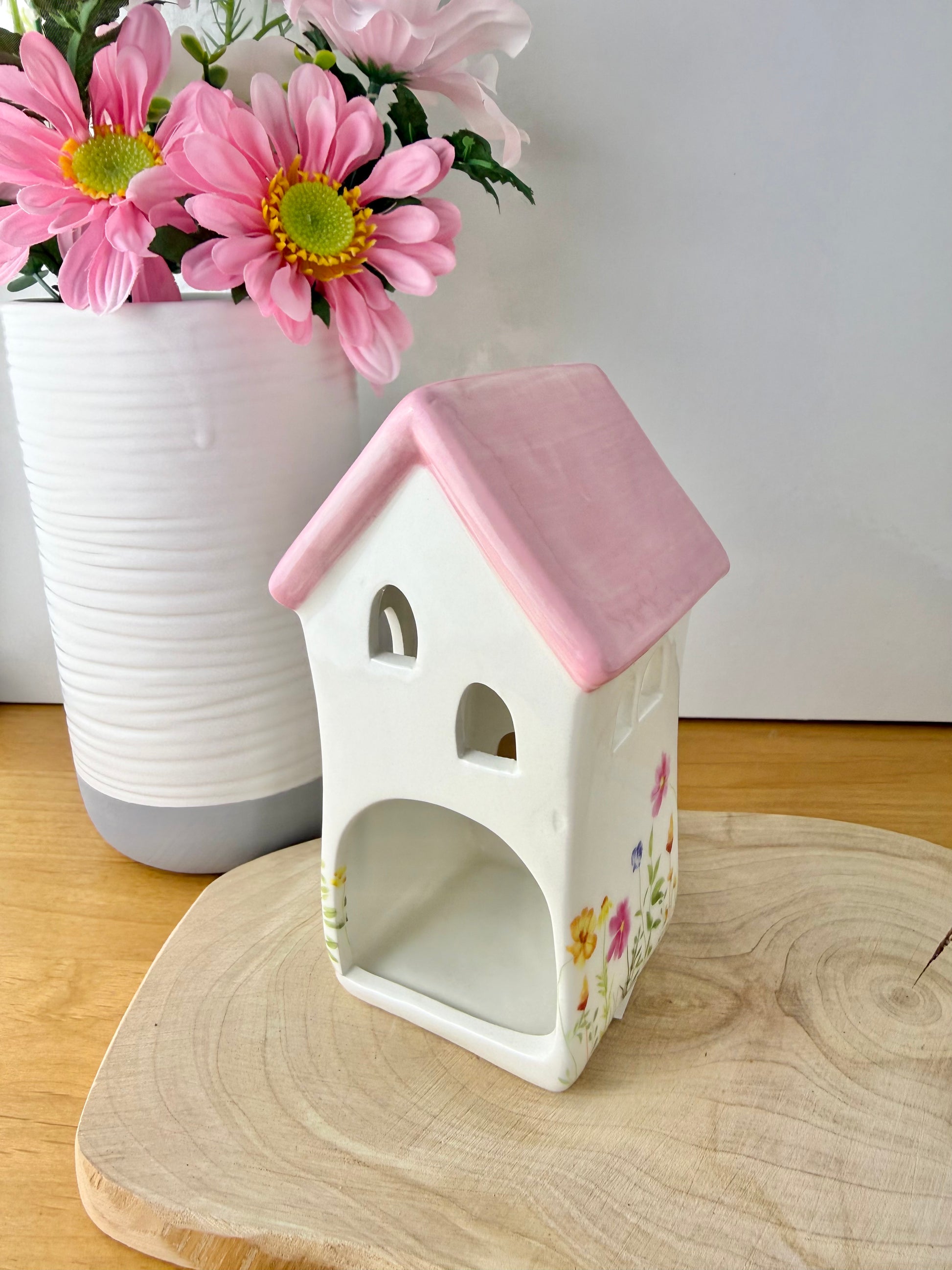 Ceramic white Tealight houses with pink roof and decorated around the house with bright meadow flowers.