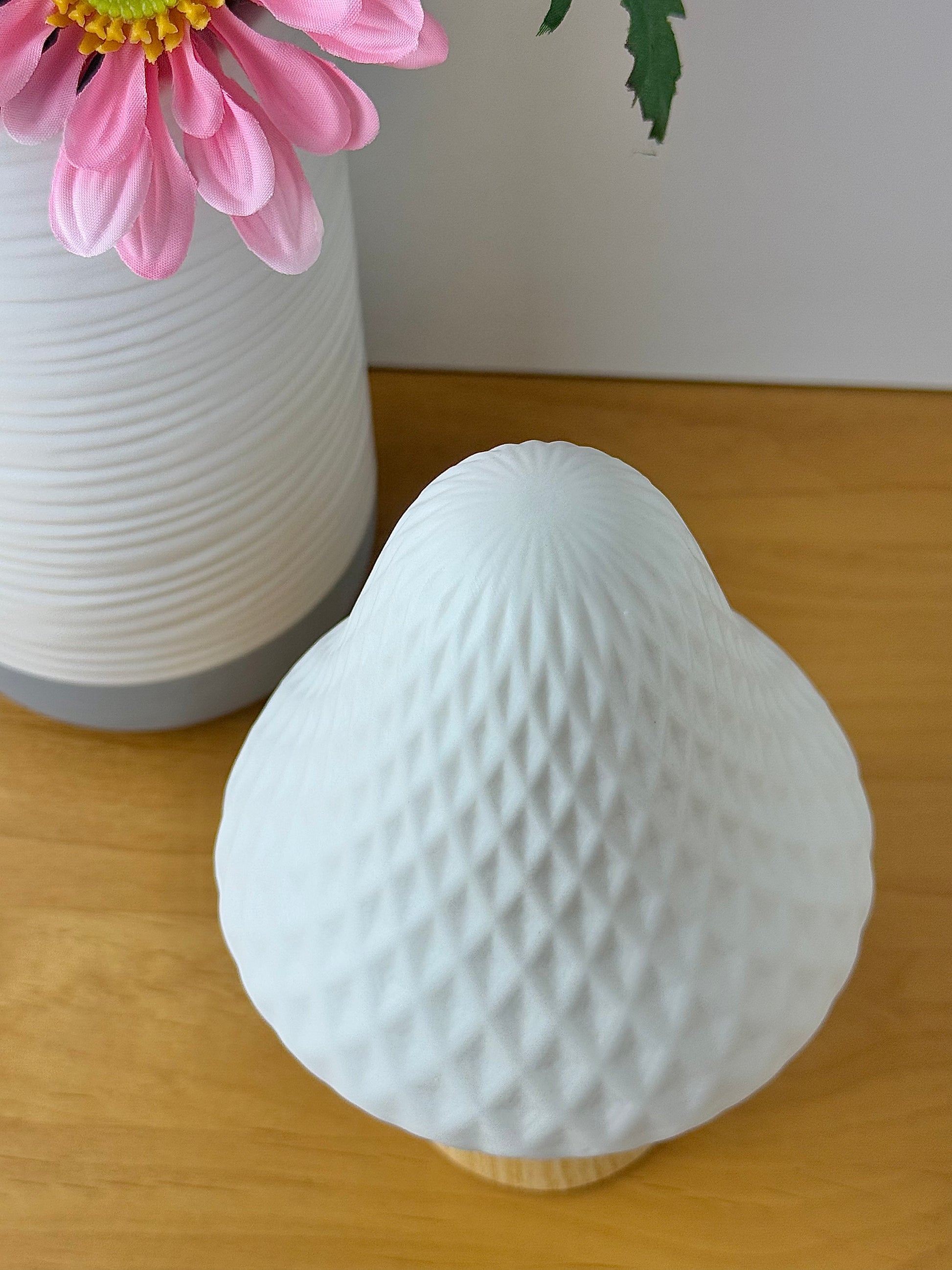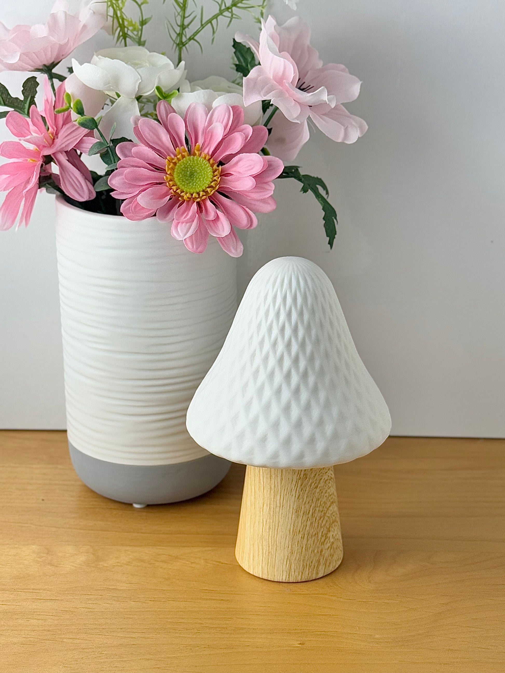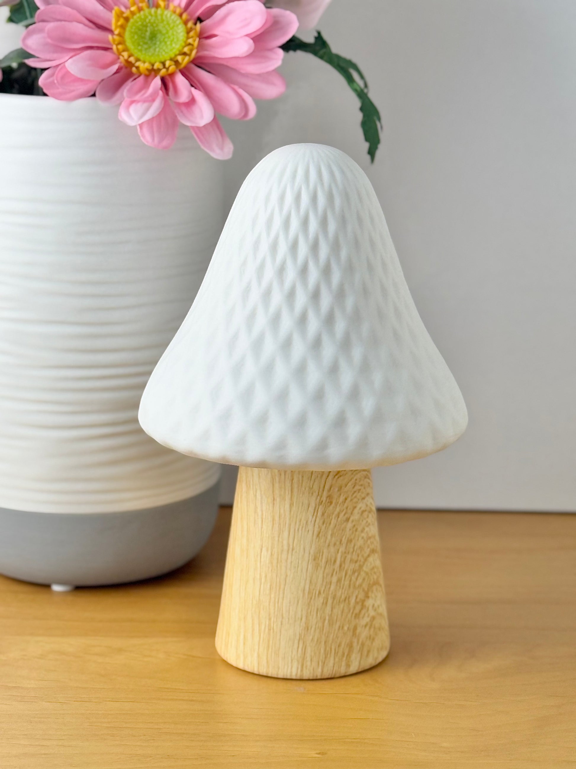 Medium Mushroom glow light with diamond pattern. Matt white top with wood like stem.