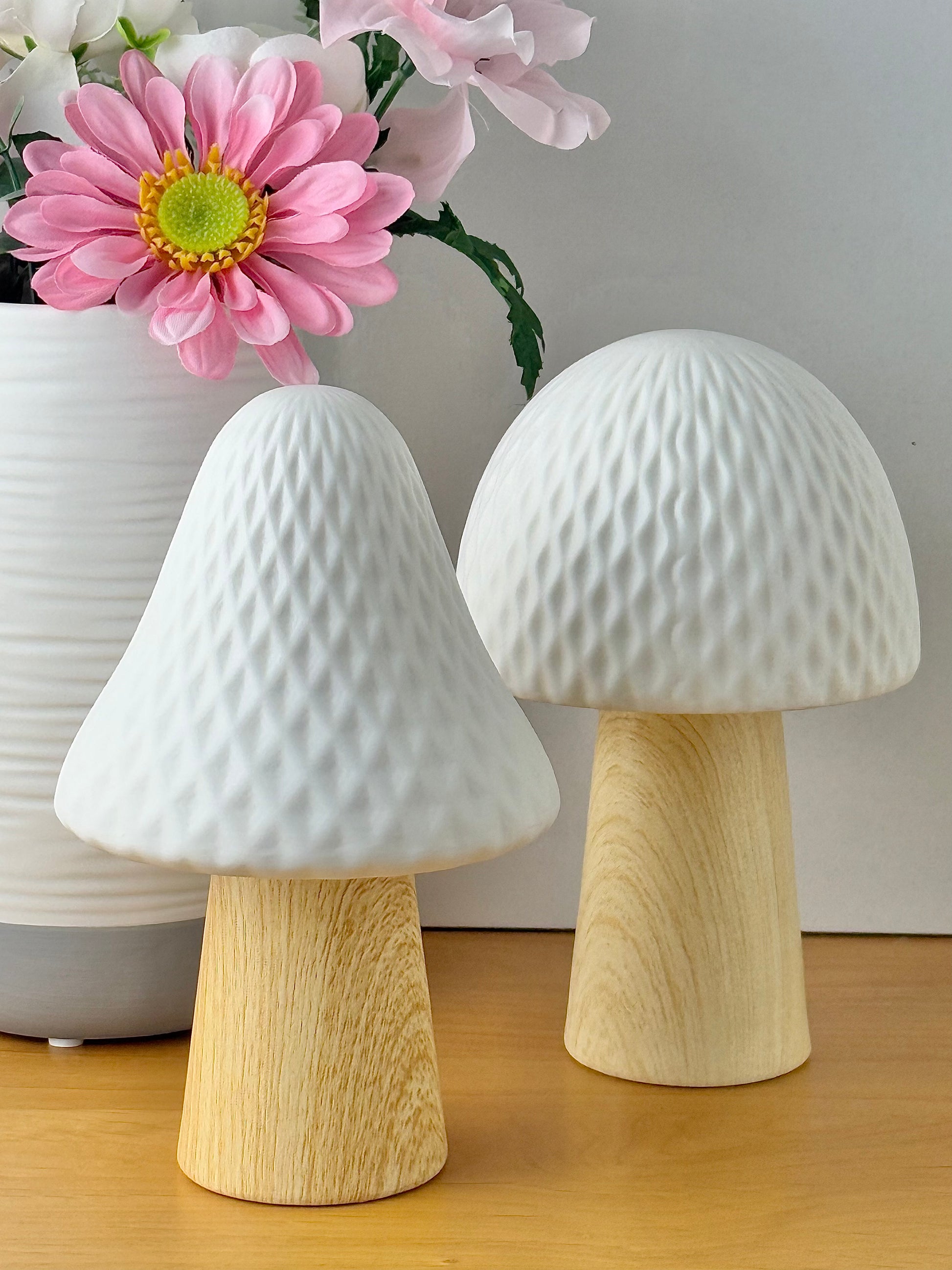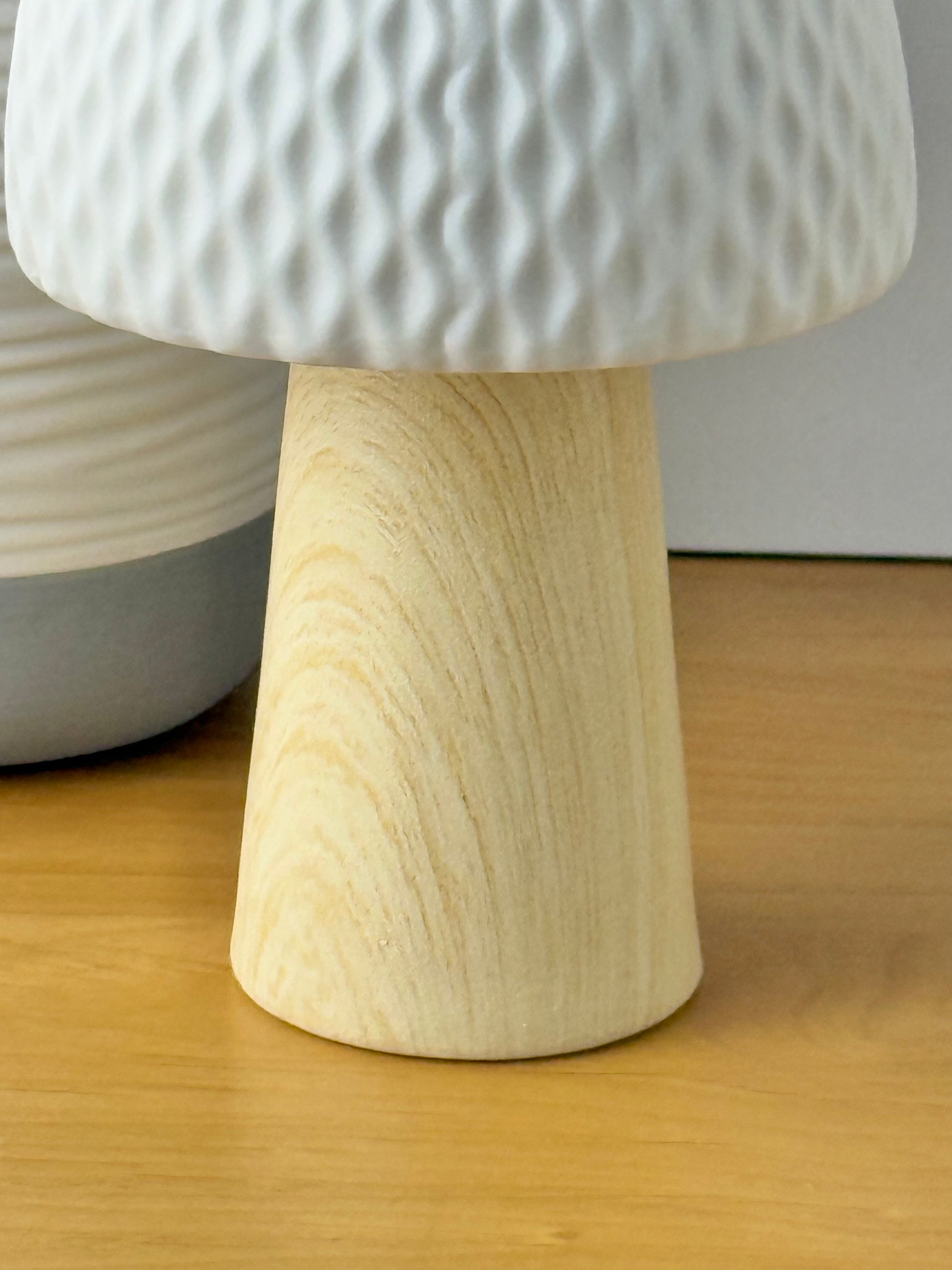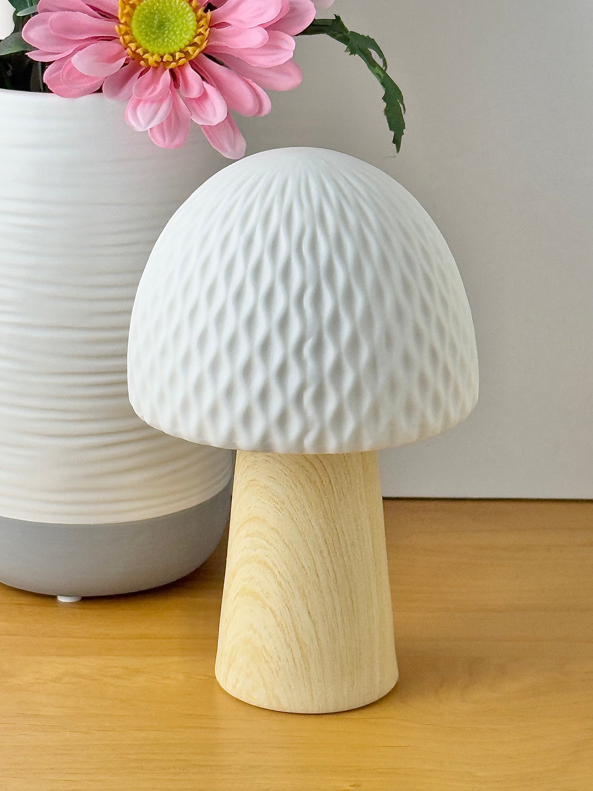 Medium Mushroom glow light with diamond pattern. Matt white top with wood like stem.
