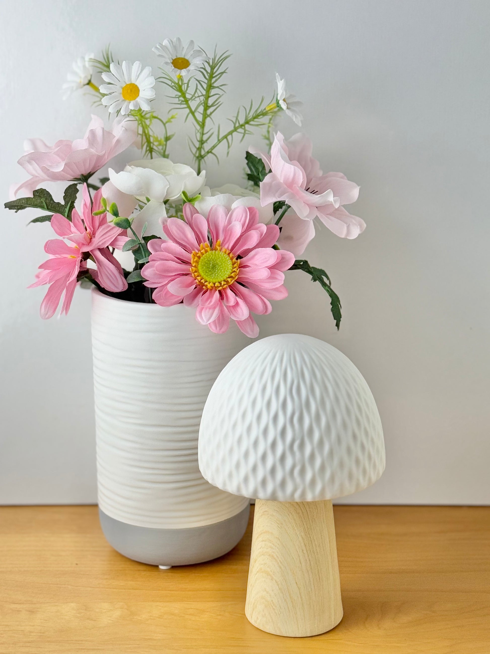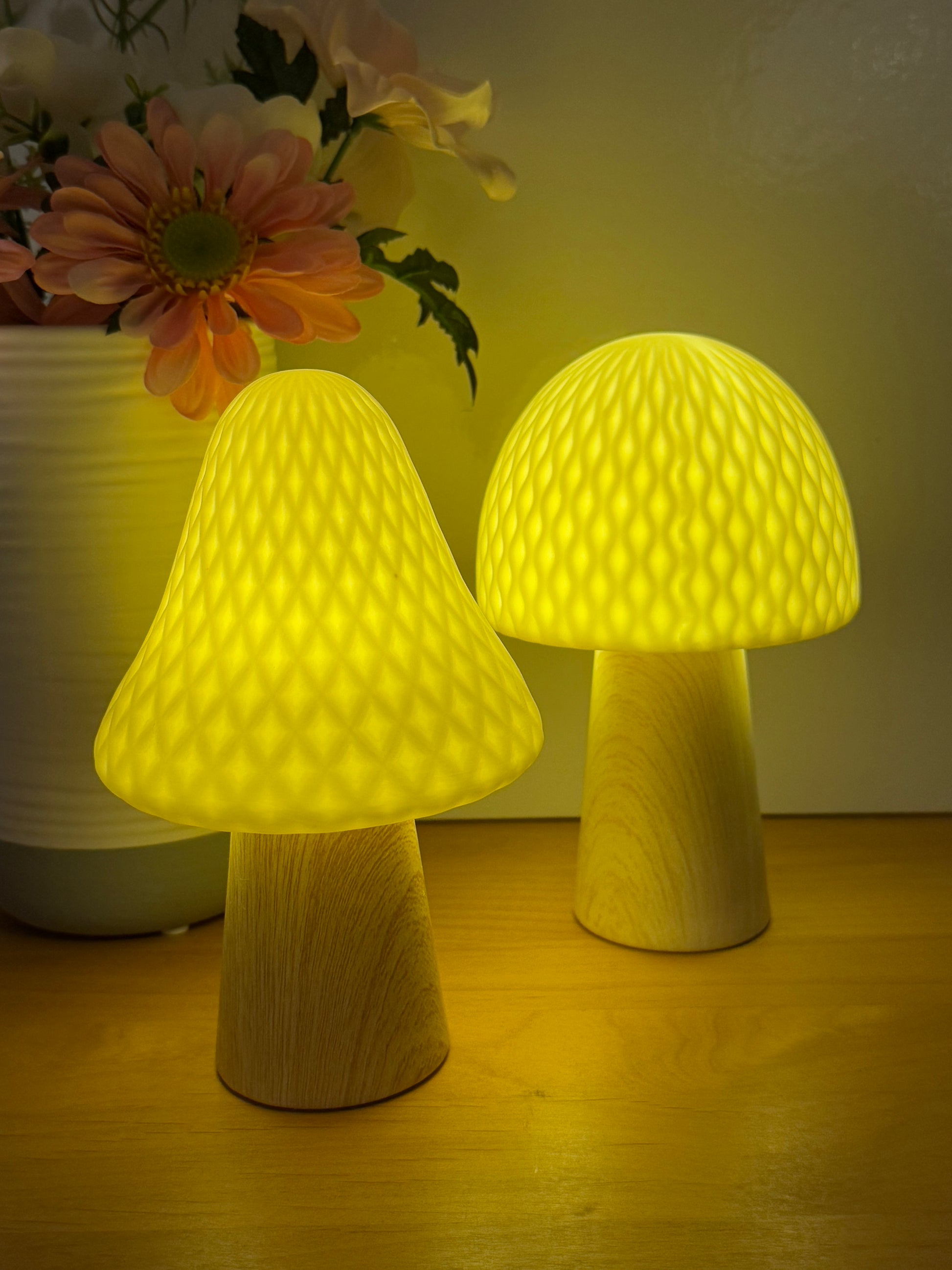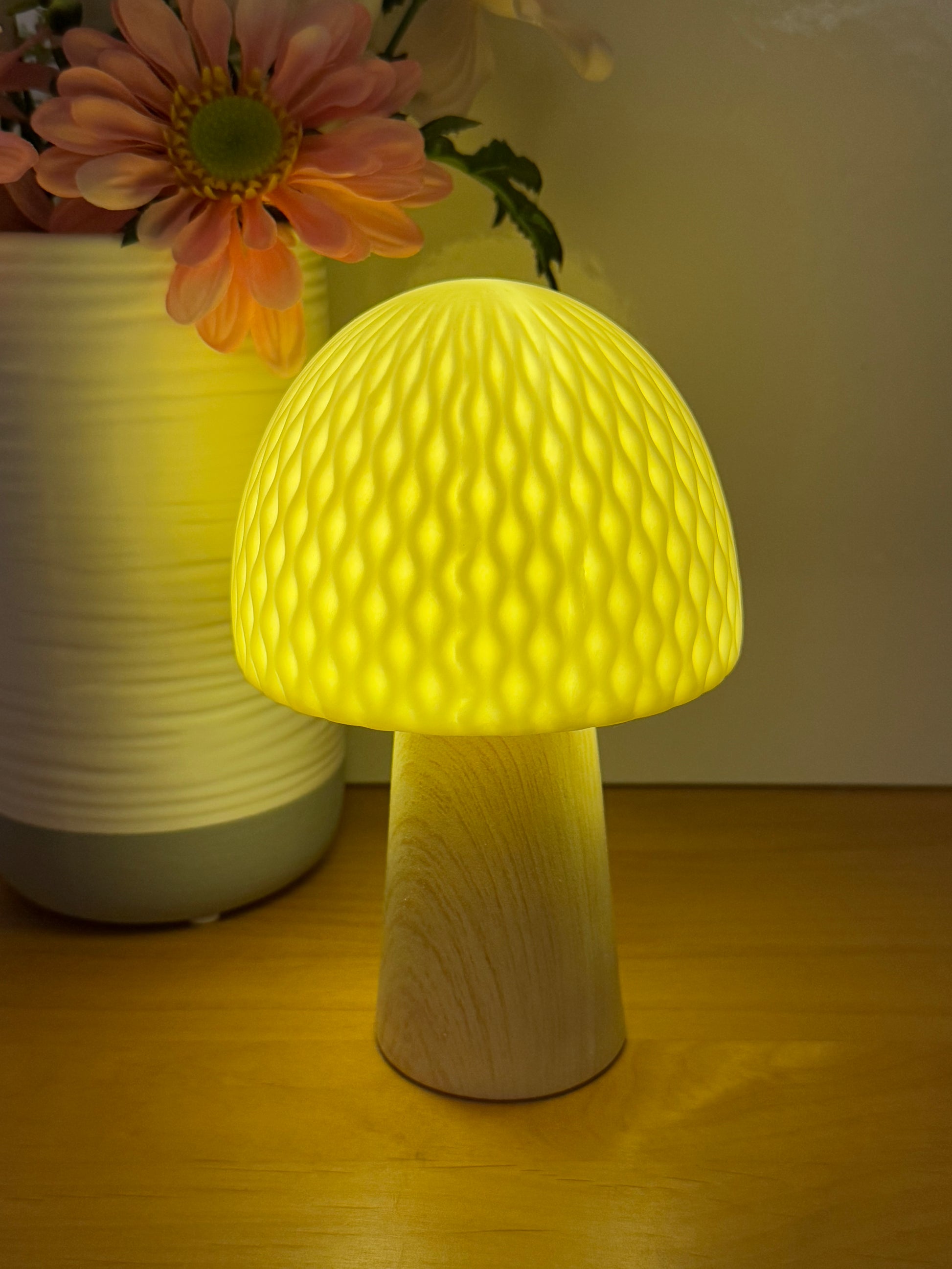 Medium Mushroom glow light with diamond pattern. Matt white top with wood like stem.