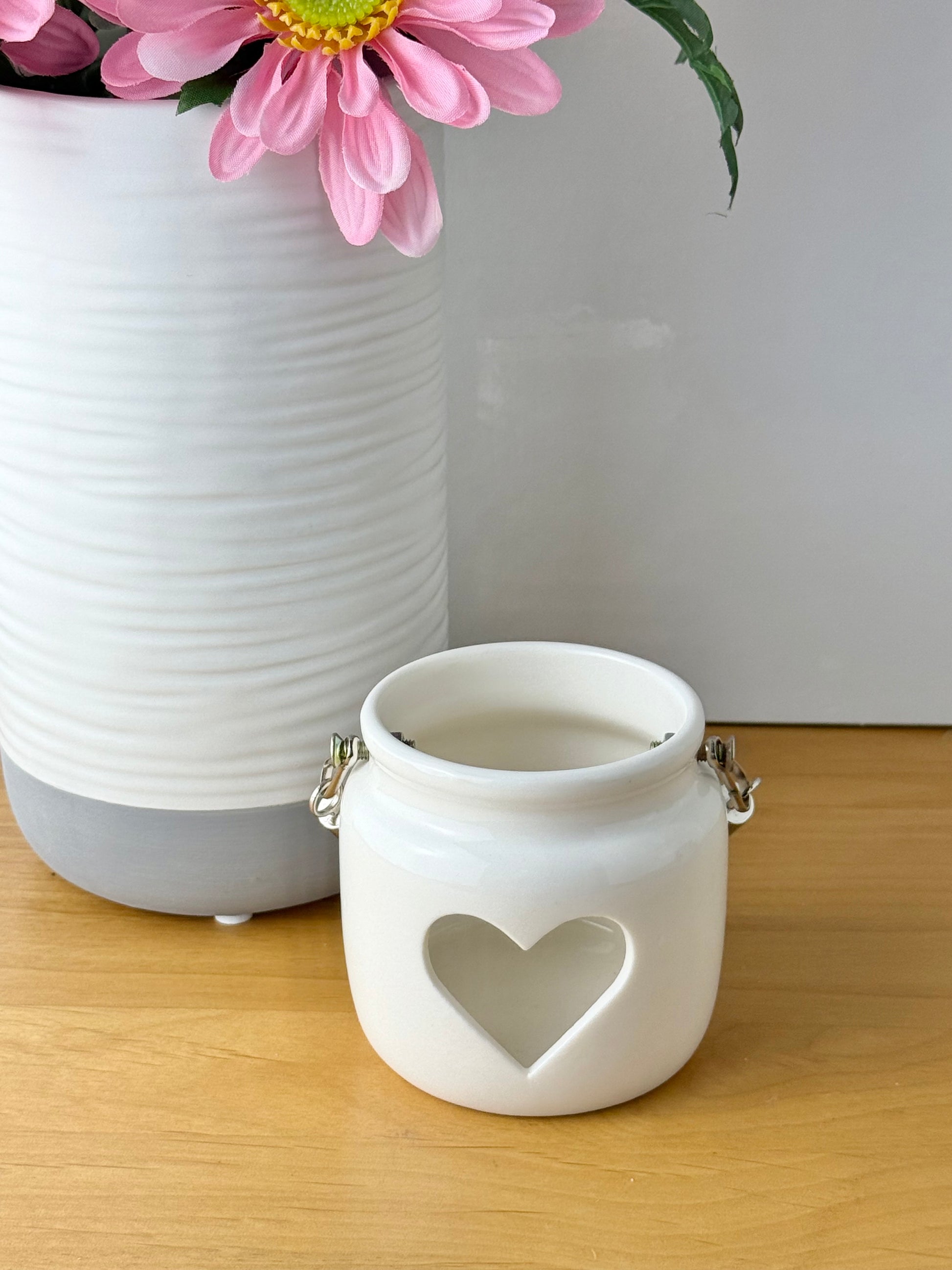 Small white porcelain lantern with cut out heart at the front & rope handle.