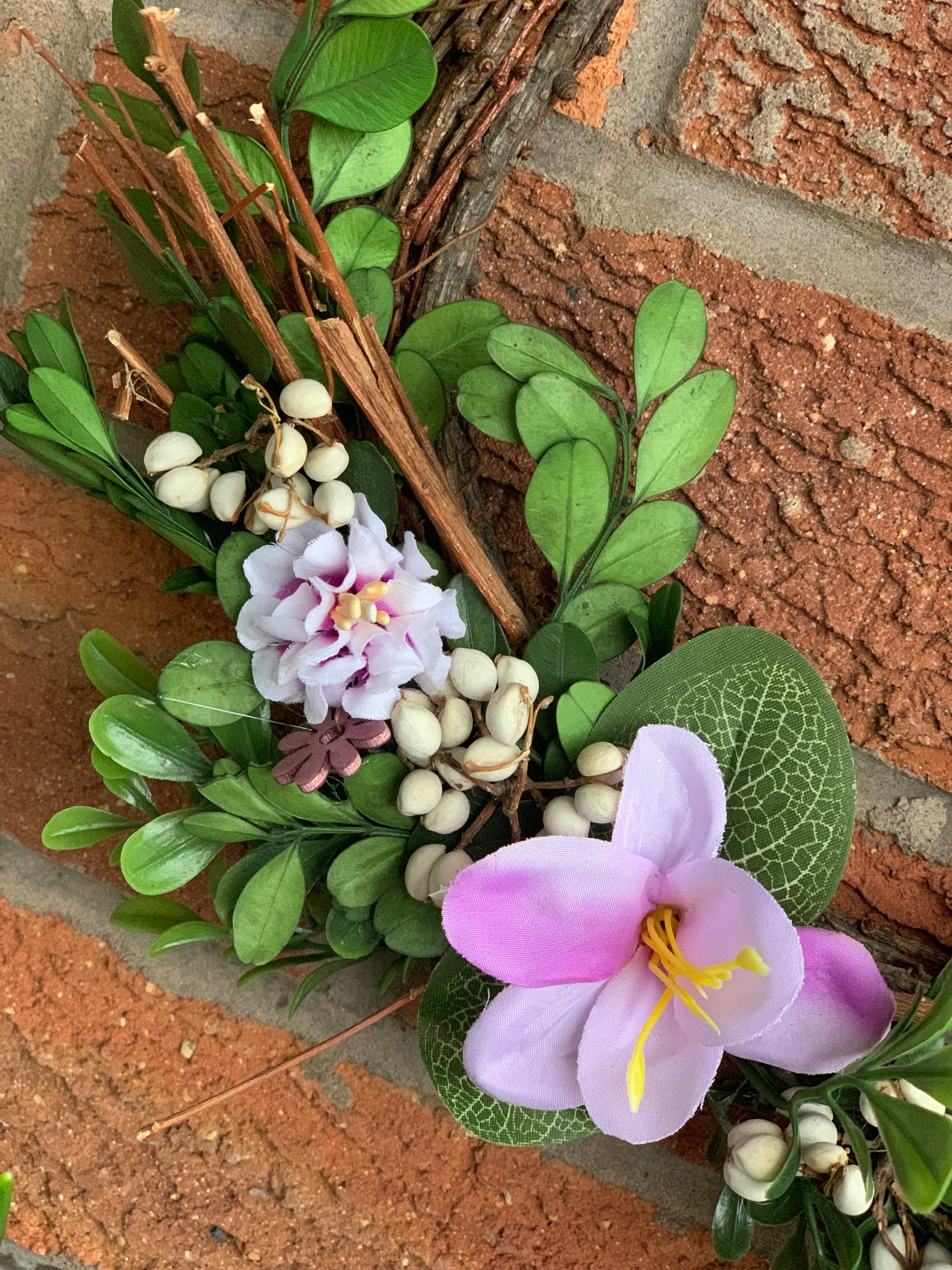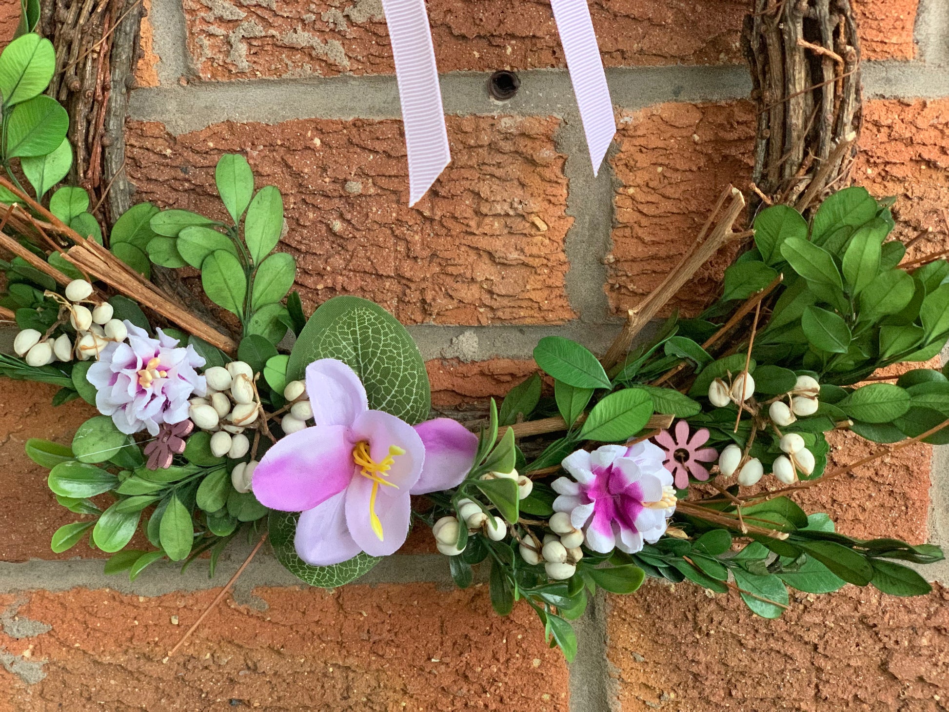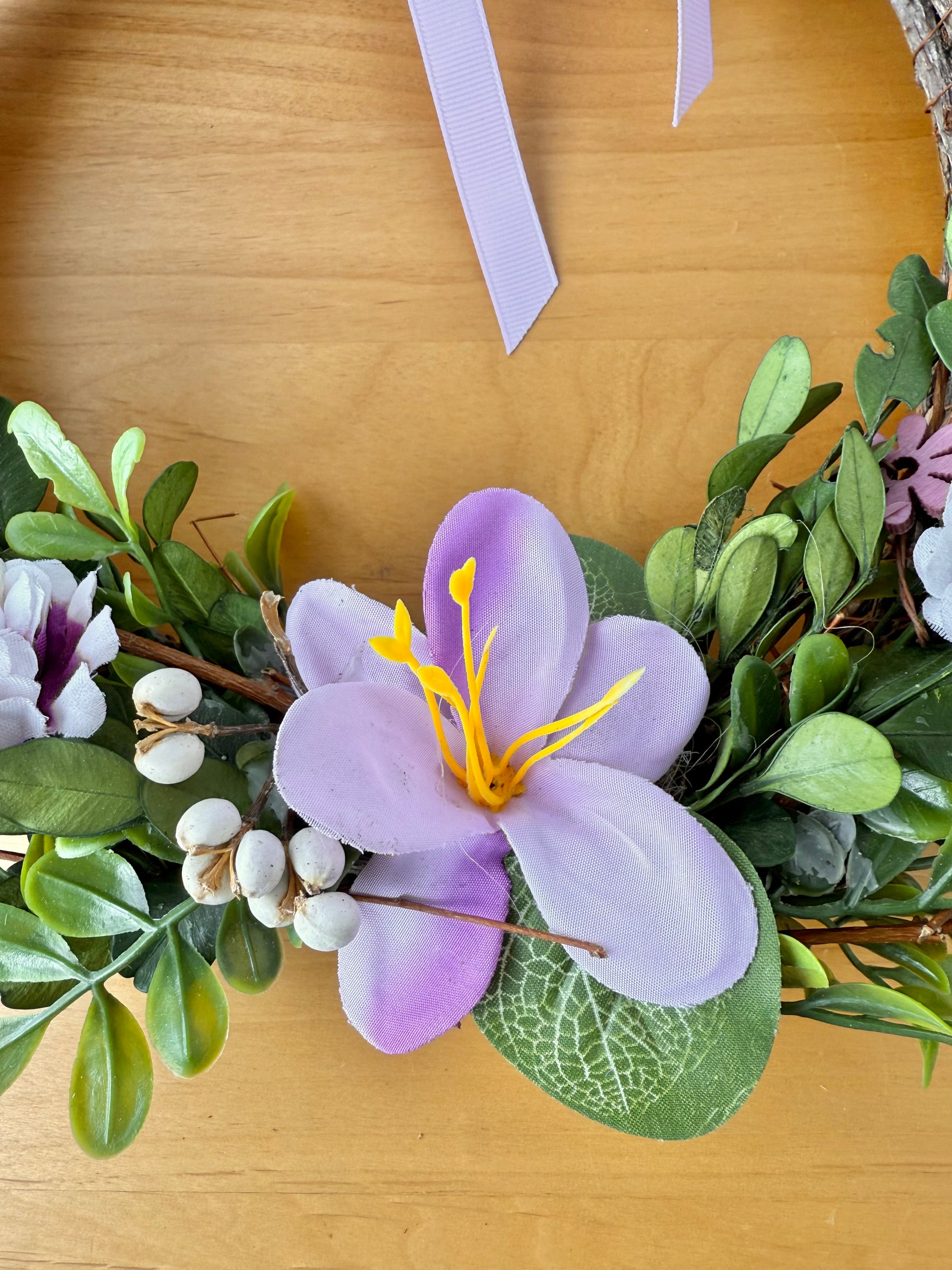 Faux foiliage & lilac & purple flowers decorate the bottom of the wreath