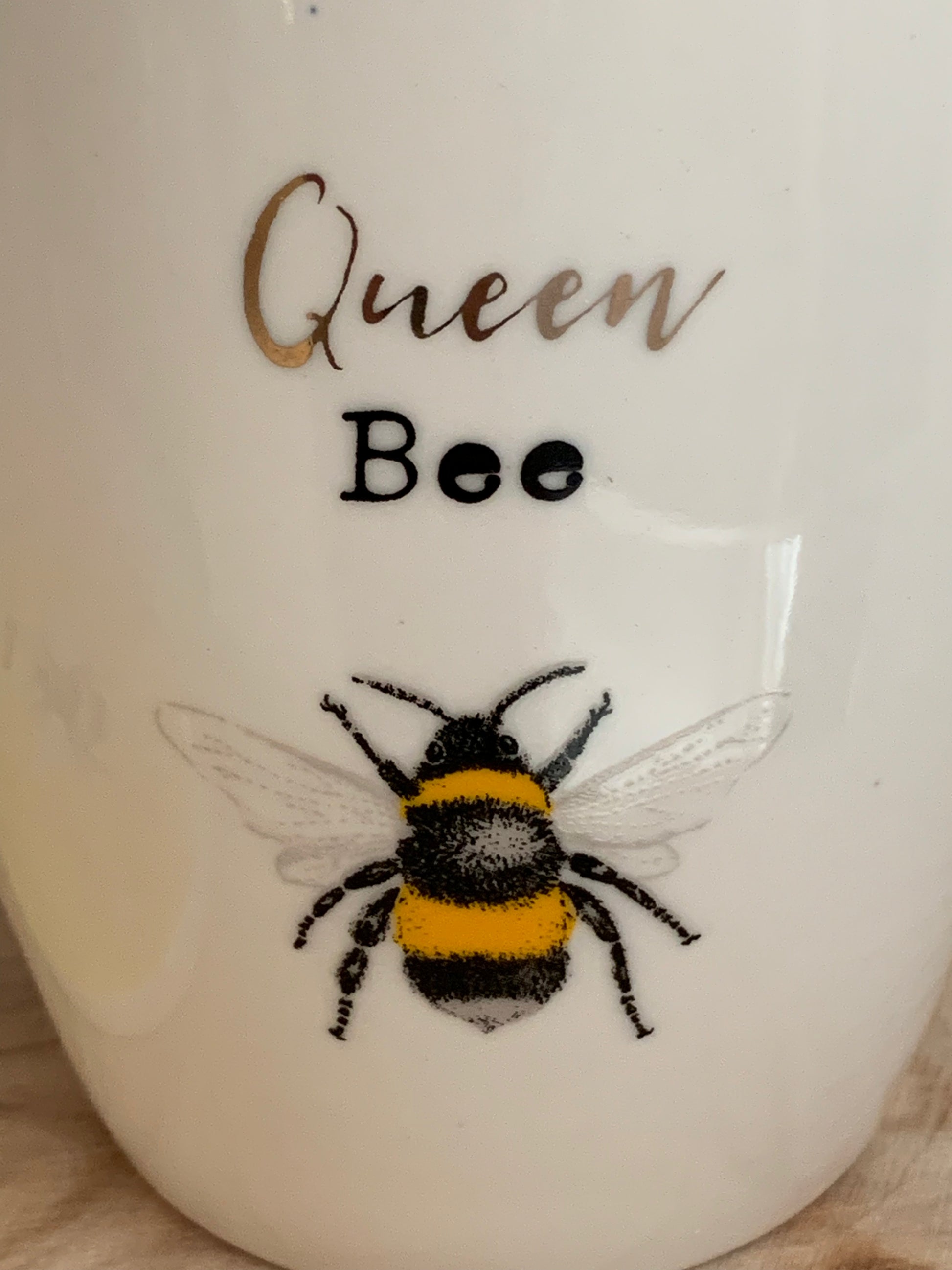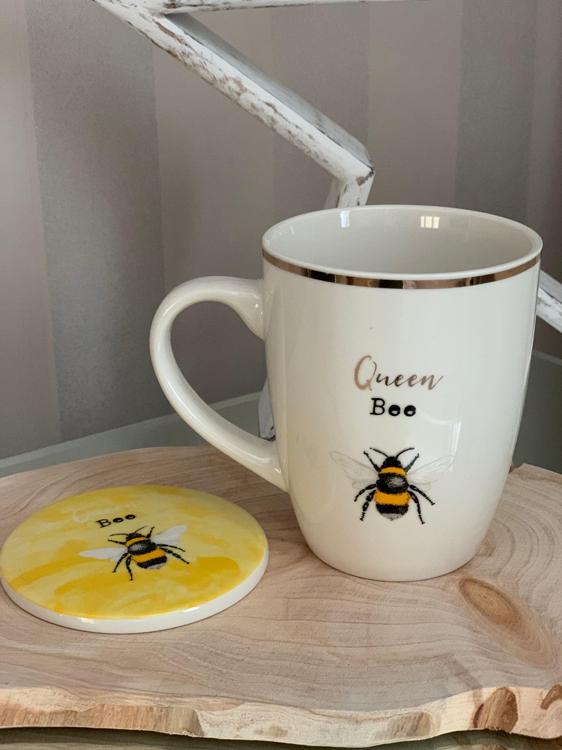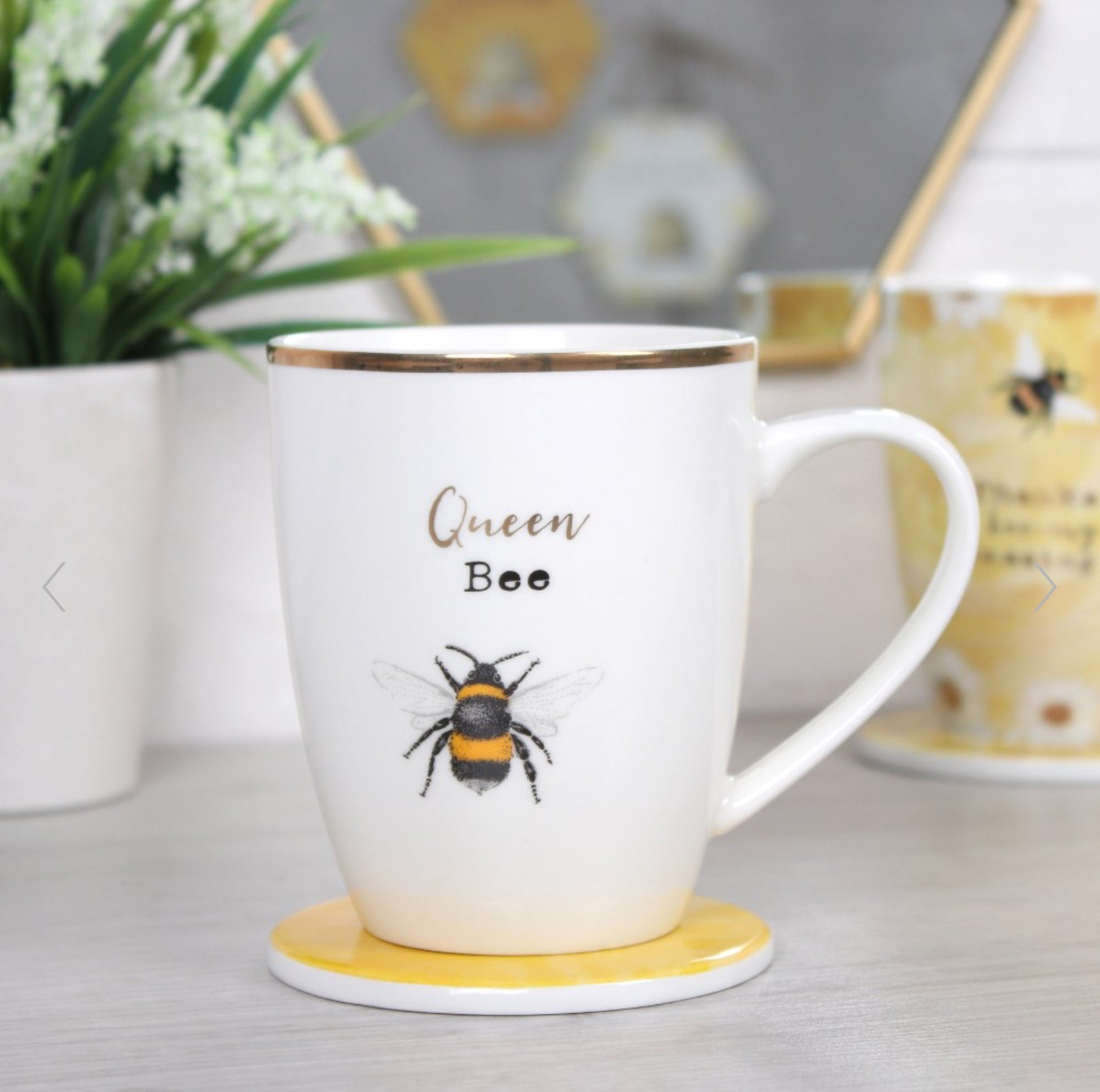 This ceramic 'Queen Bee' mug and coaster set has metallic gold detailing
