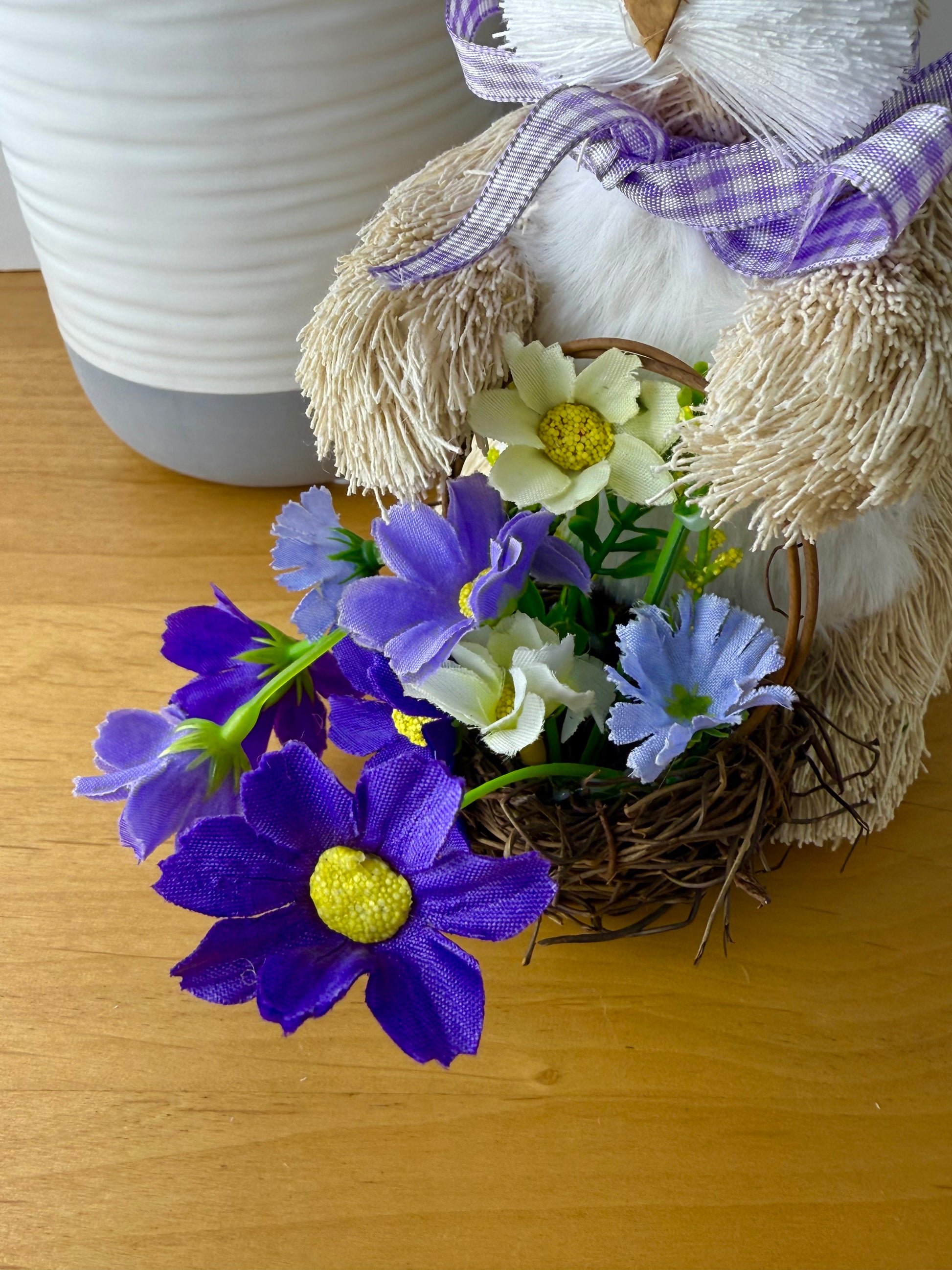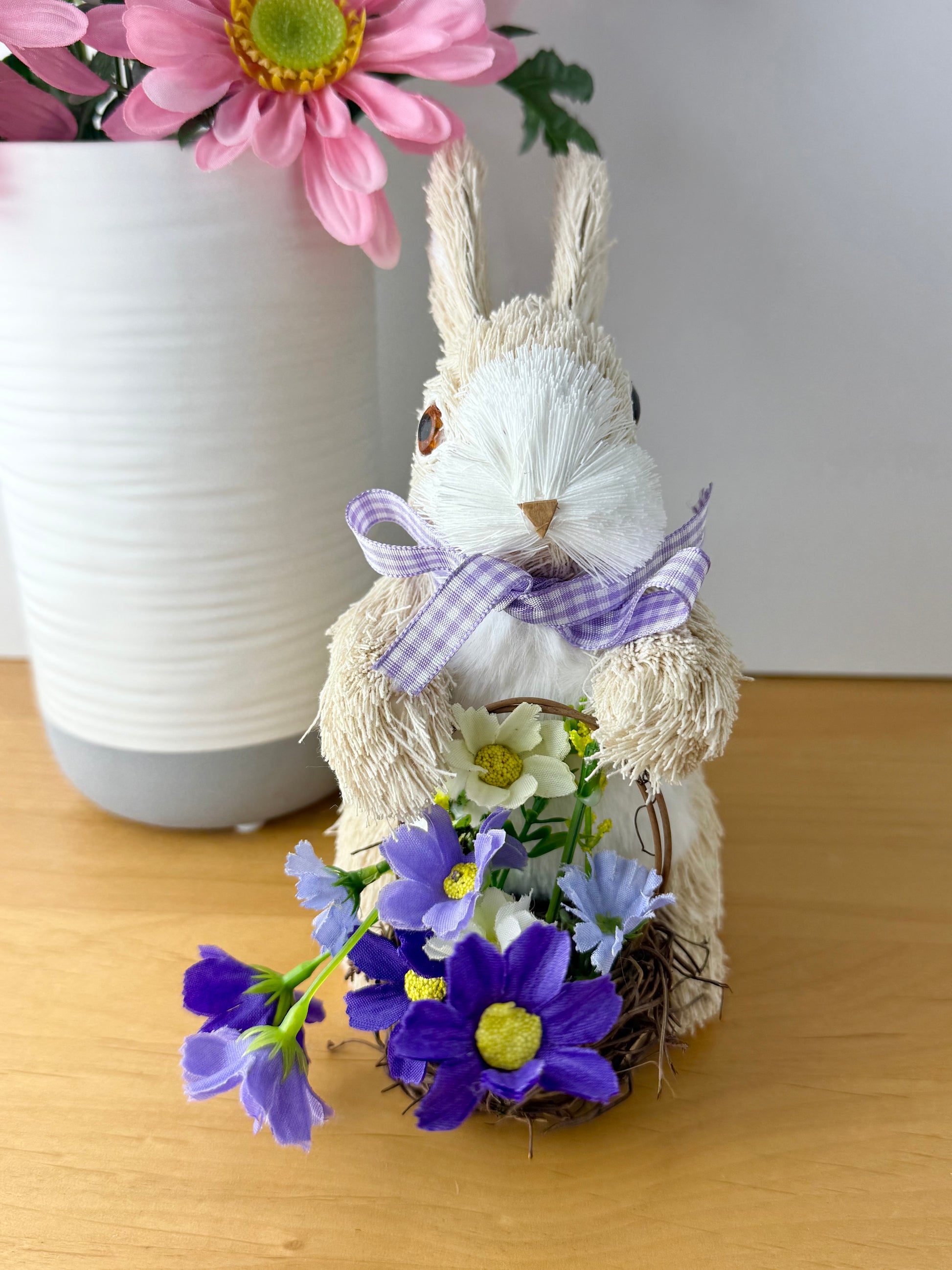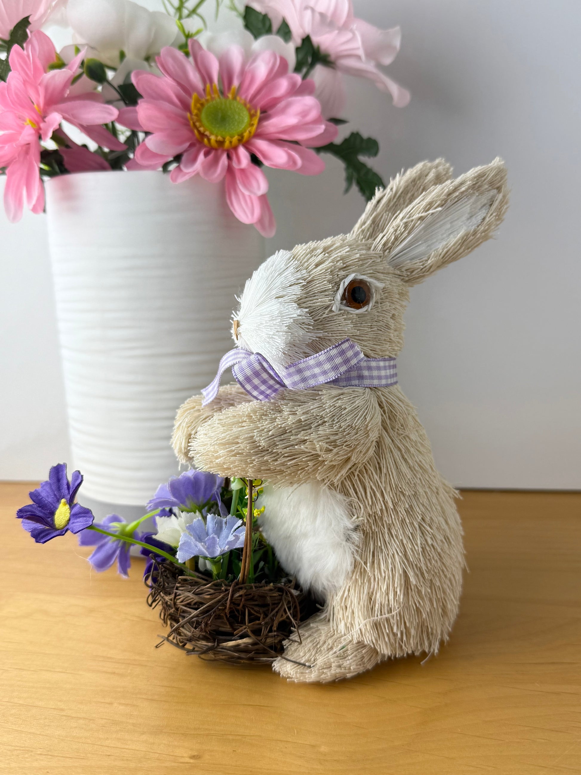 Beige & white rattan bunny rabbit with lilac gingham bow round its neck, carrying a twig basket with purple & white flowers.