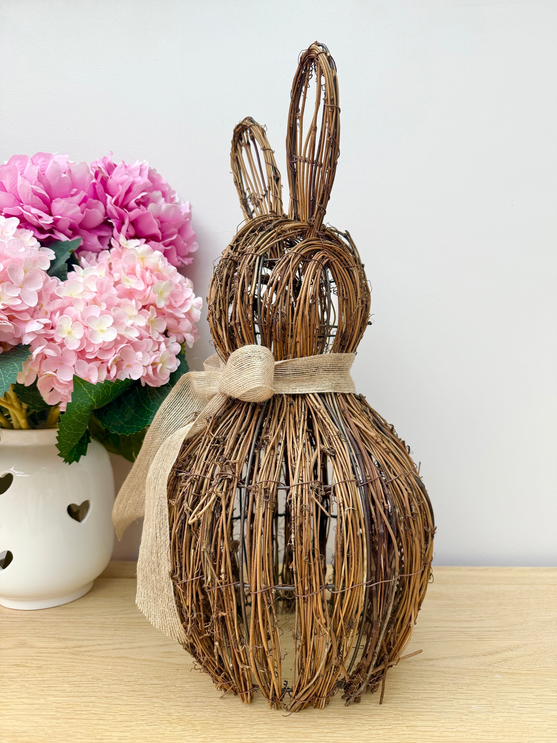 Charming rattan bunnys with a rustic hessian bow to the front