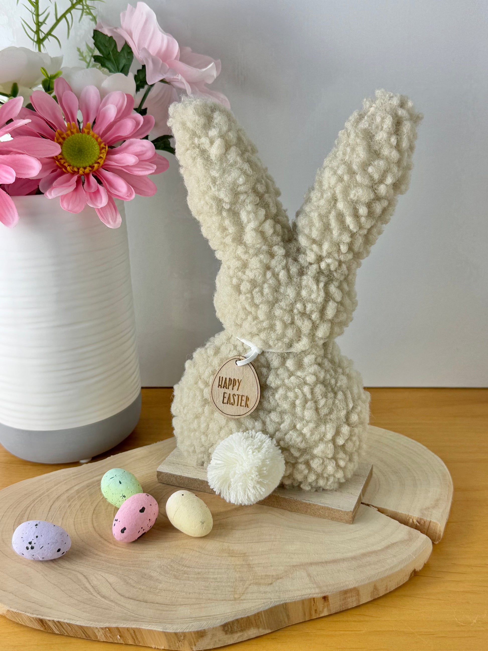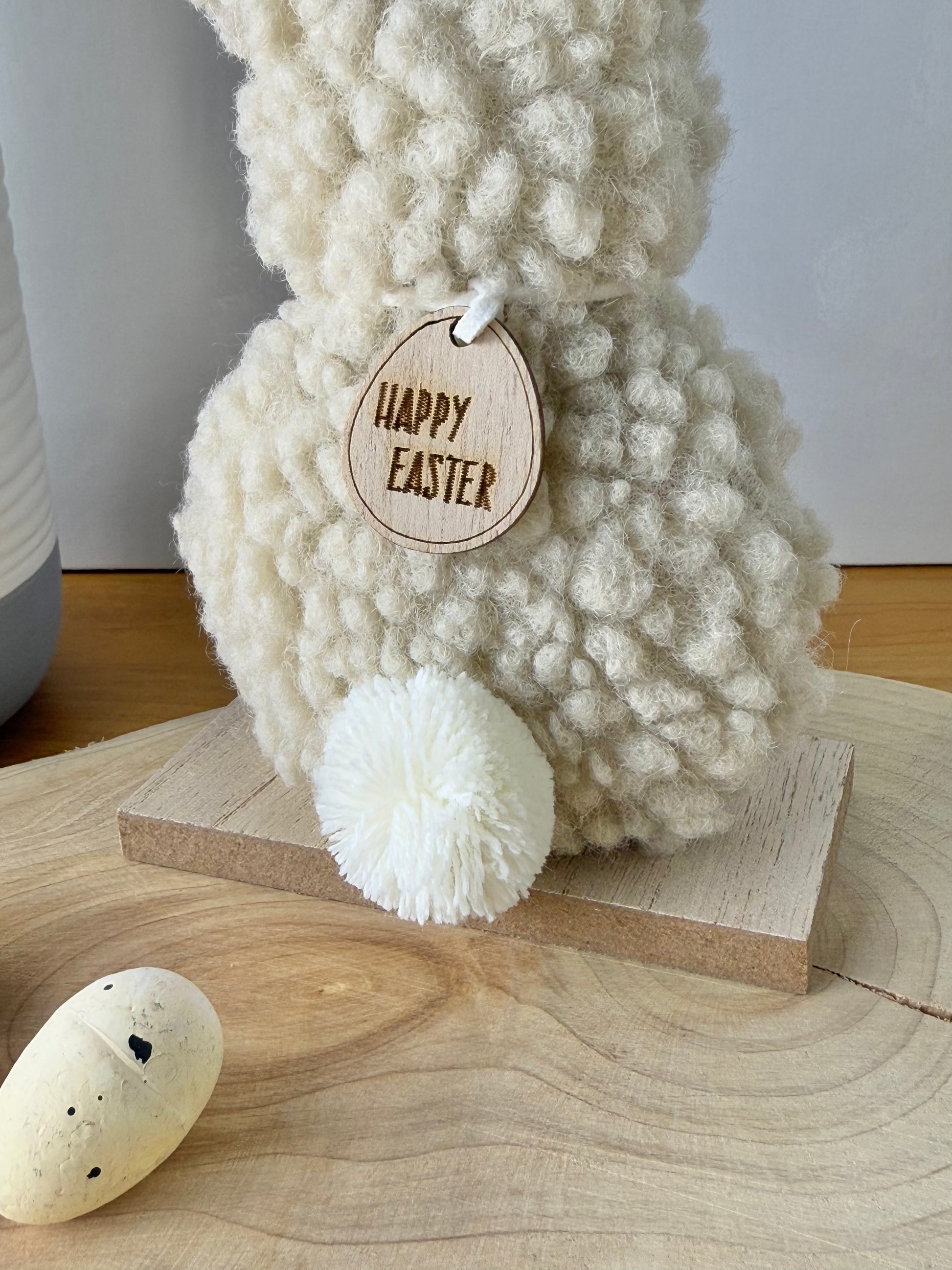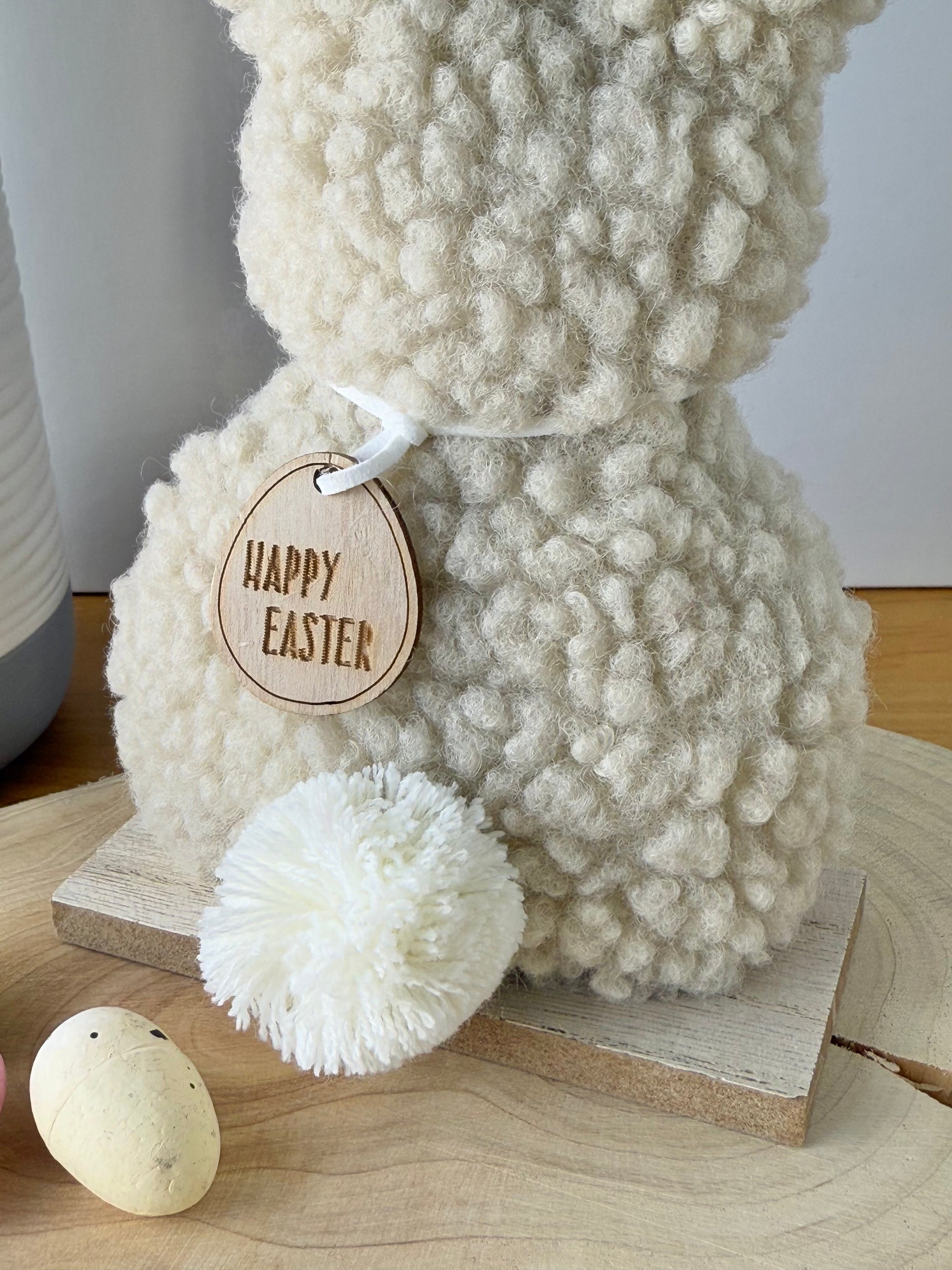 A gorgeous fluffy bunny ornament made from on trend Sherpa fabric. A chic, neutral bunny ornament with a white fluffy tail and a wooden tag reading 'HAPPY EASTER'.