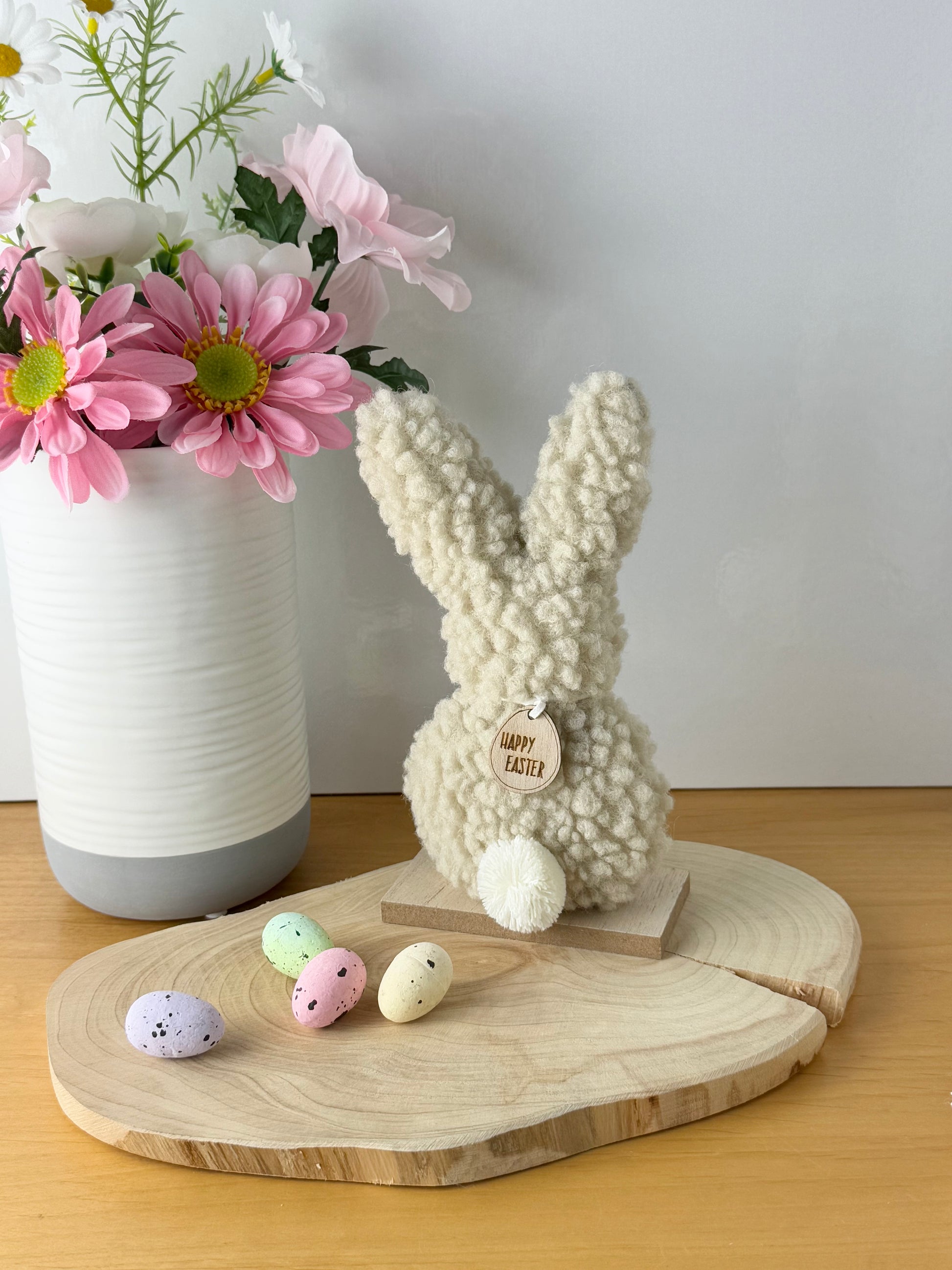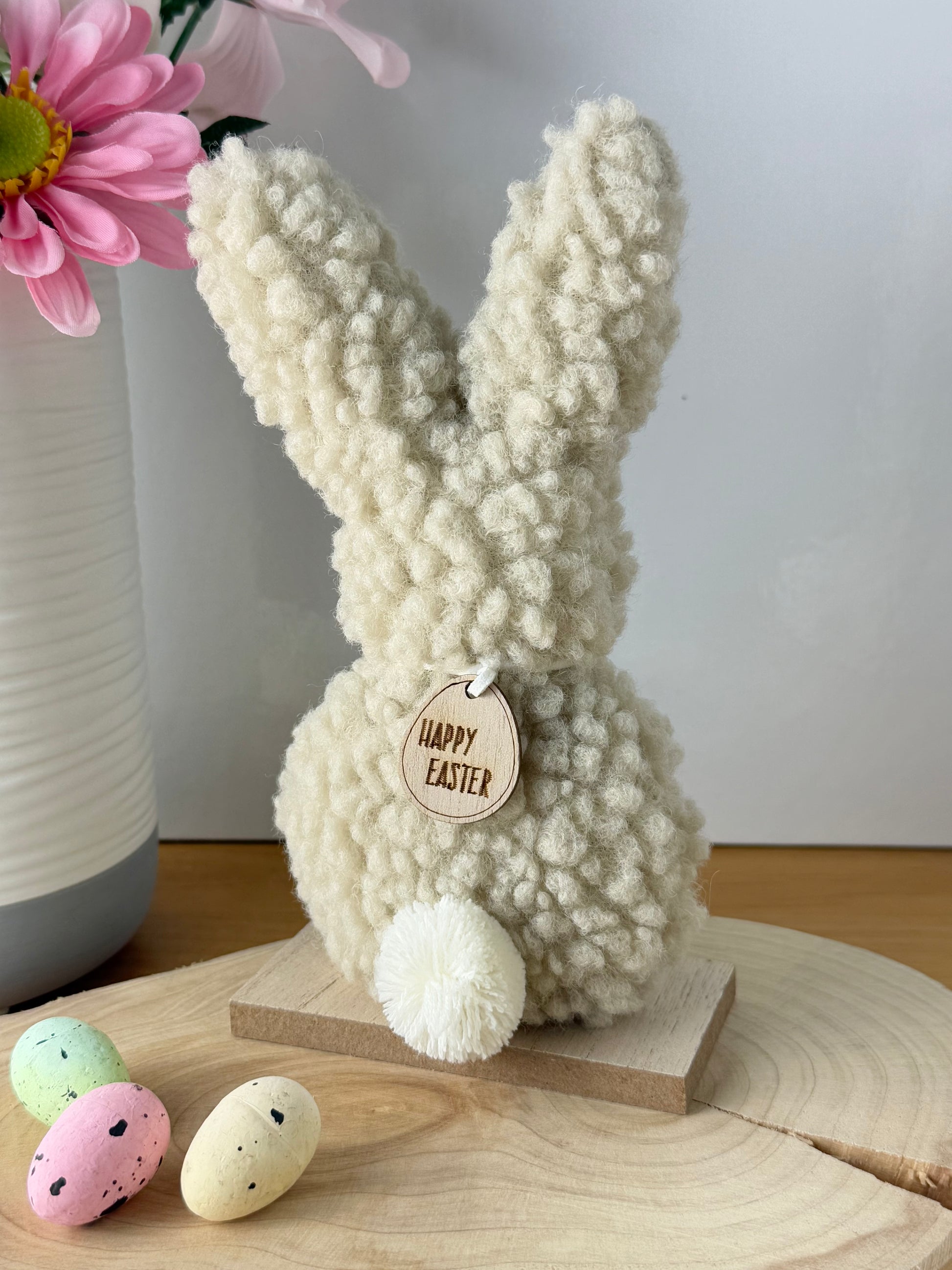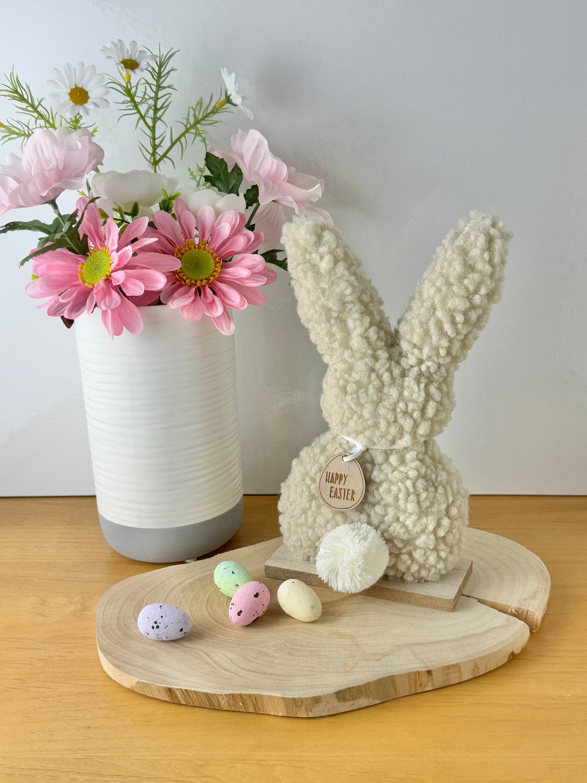 A gorgeous fluffy bunny ornament made from on trend Sherpa fabric. A chic, neutral bunny ornament with a white fluffy tail and a wooden tag reading 'HAPPY EASTER'.