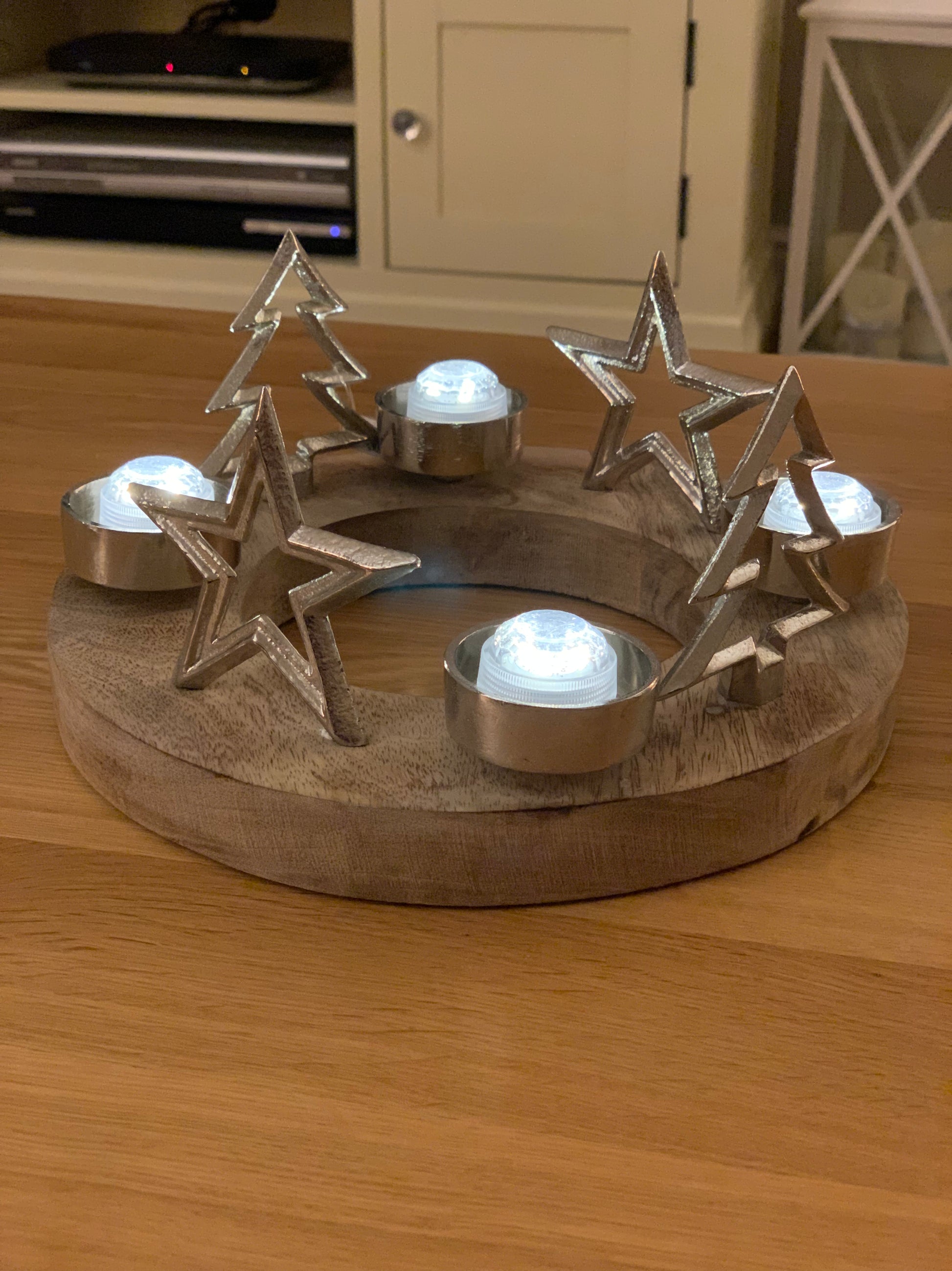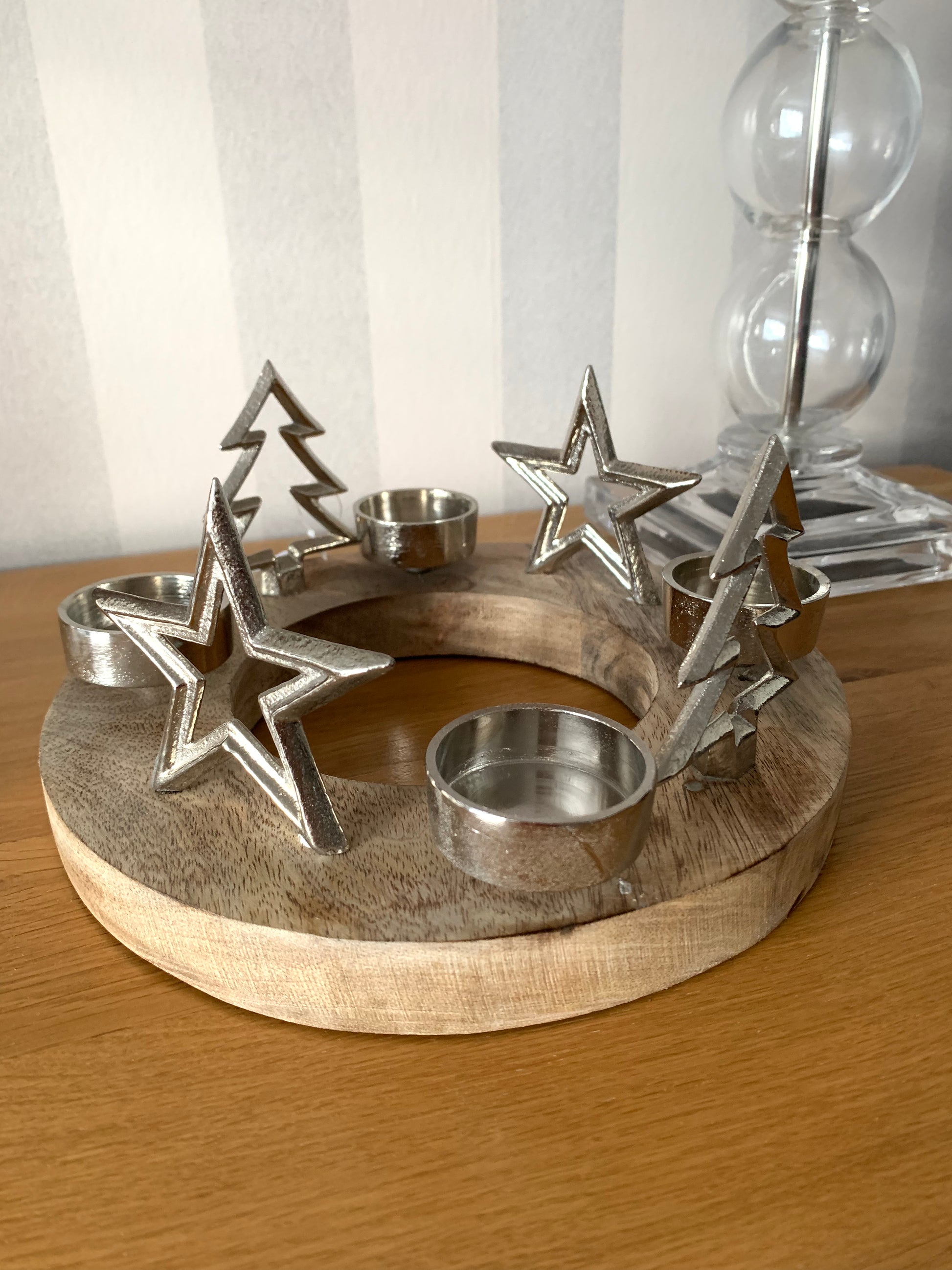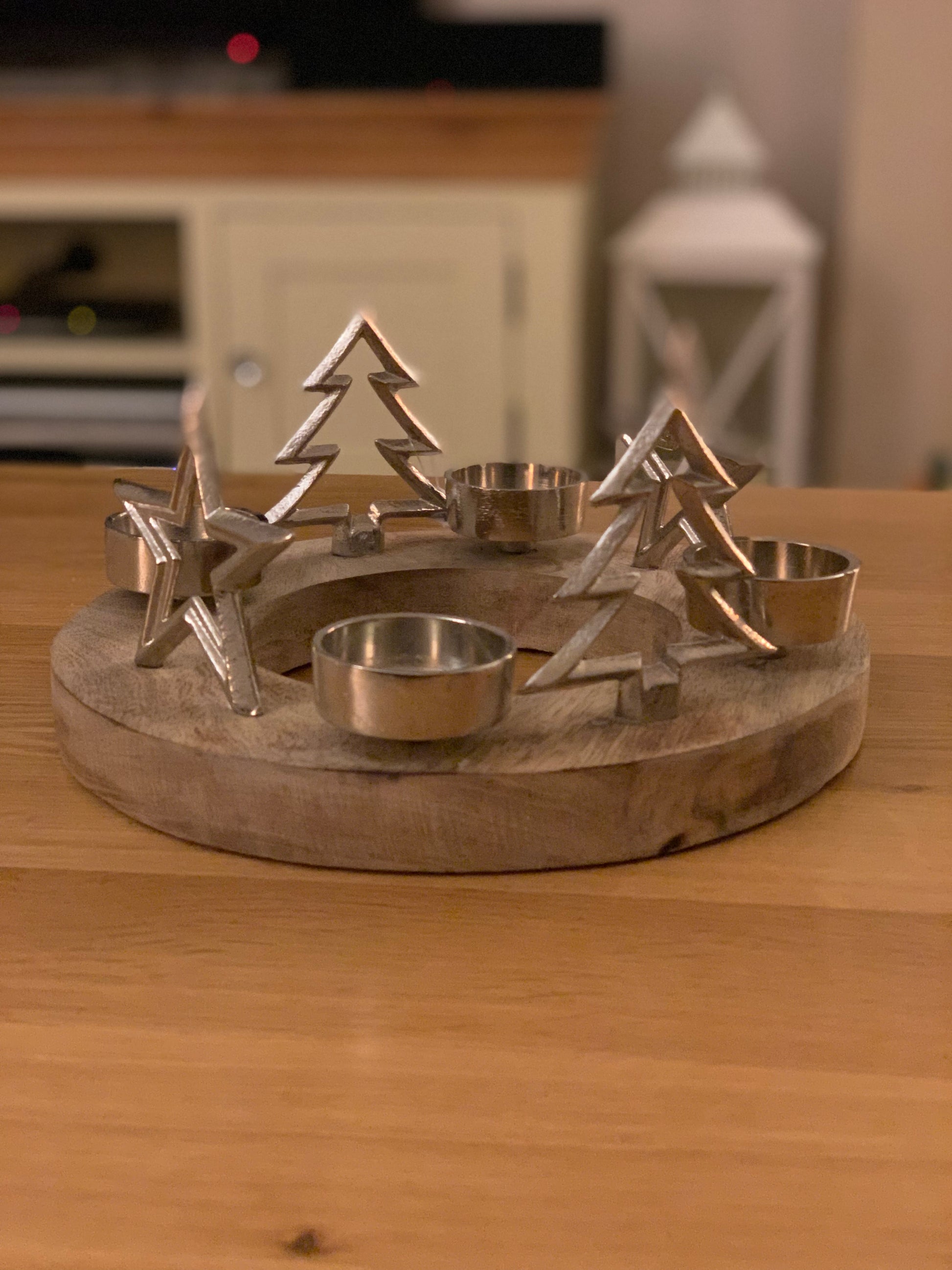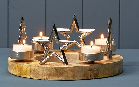 Round Chunky Wood Stand With 2 Silver Stars And Trees With Space For 4 Tealights To Sit. Perfect Centre Piece For a Table Or Mantel This Christmas Time