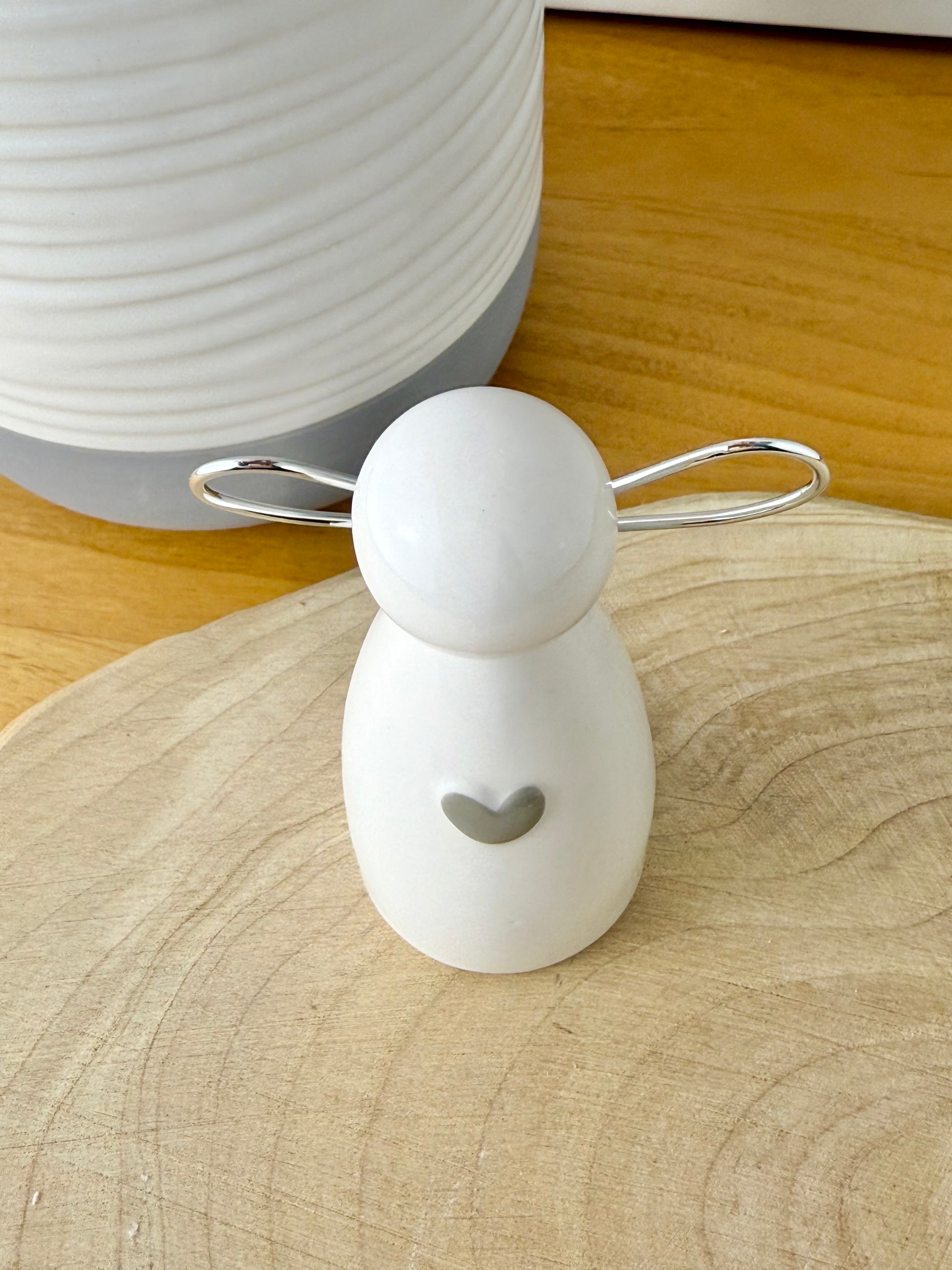 High gloss ceramic angel ornament with grey heart on the front & silver wire wings at the back