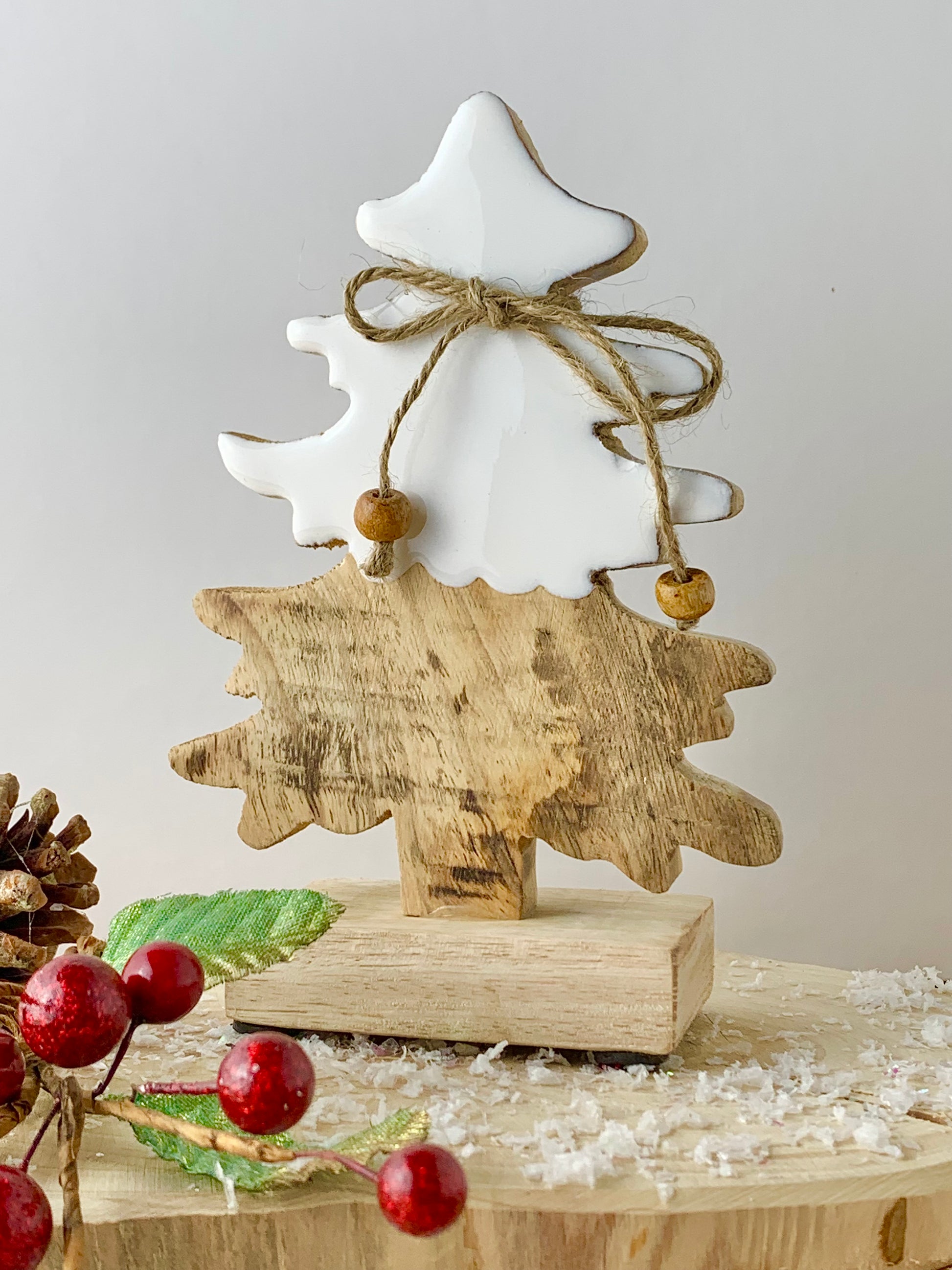 Natural wooden Christmas tree topped with white ceramic gloss snow And a string bow.