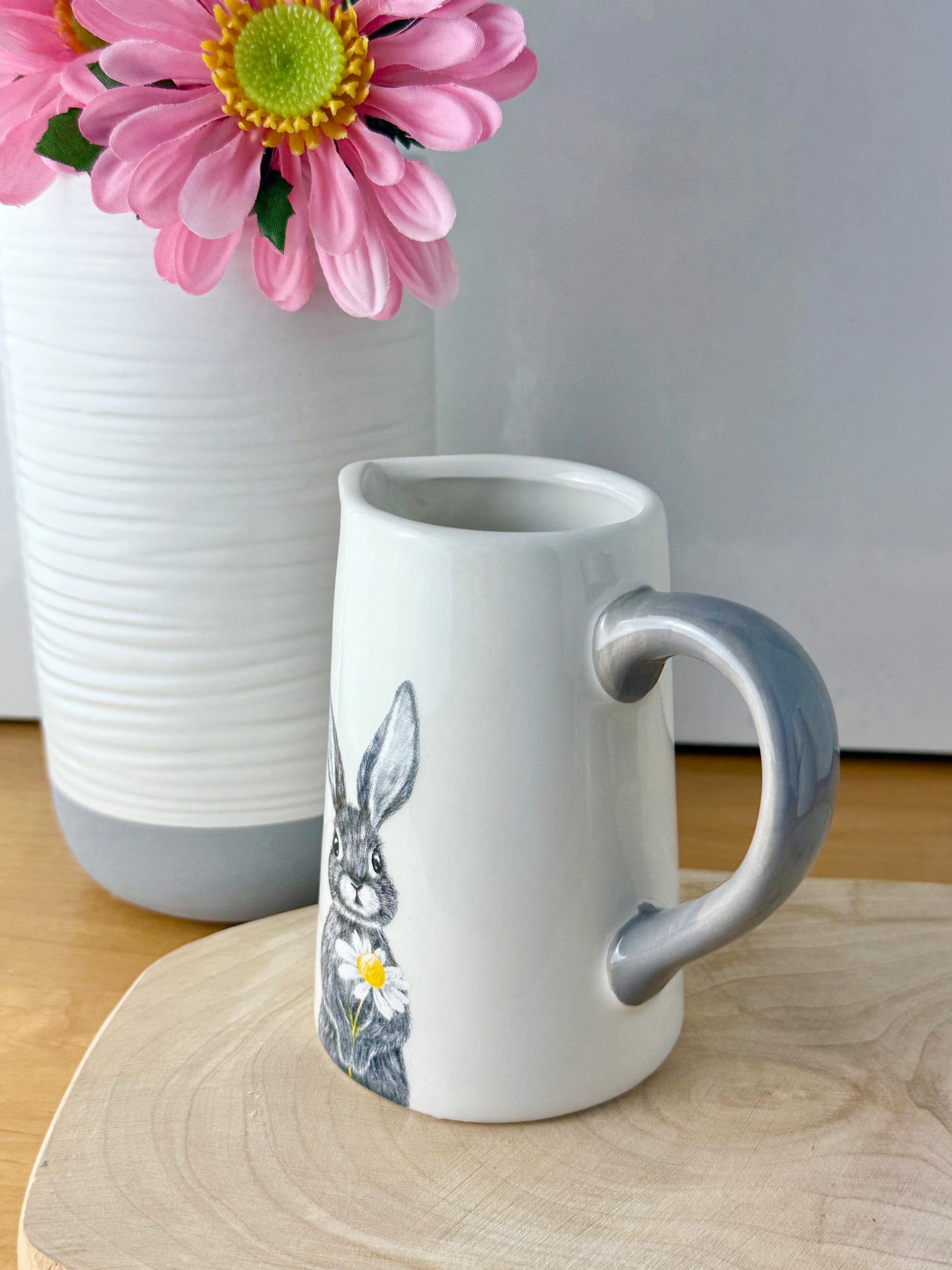 This charming flower jug features an adorable hare sketch cradling a daisy.