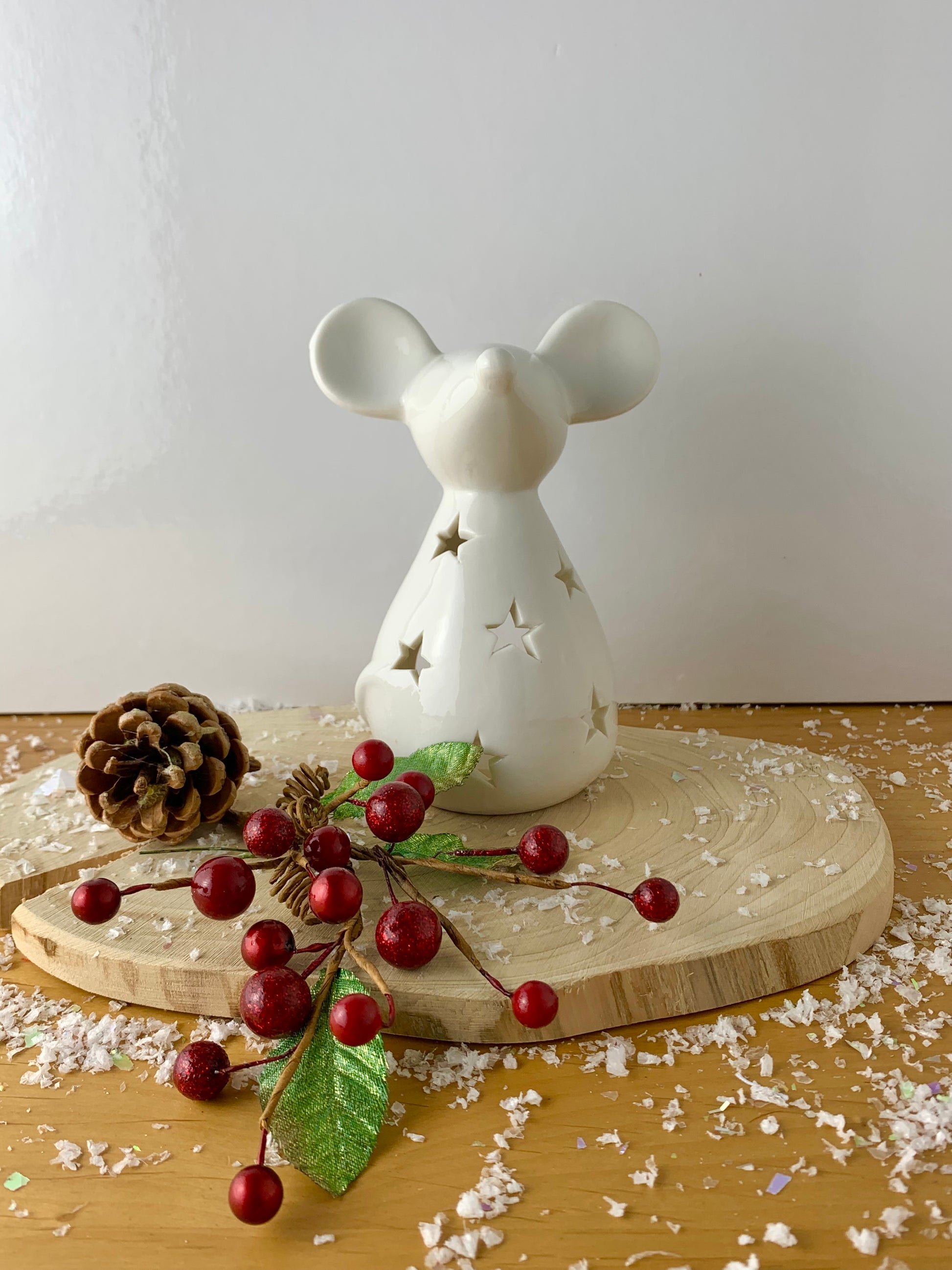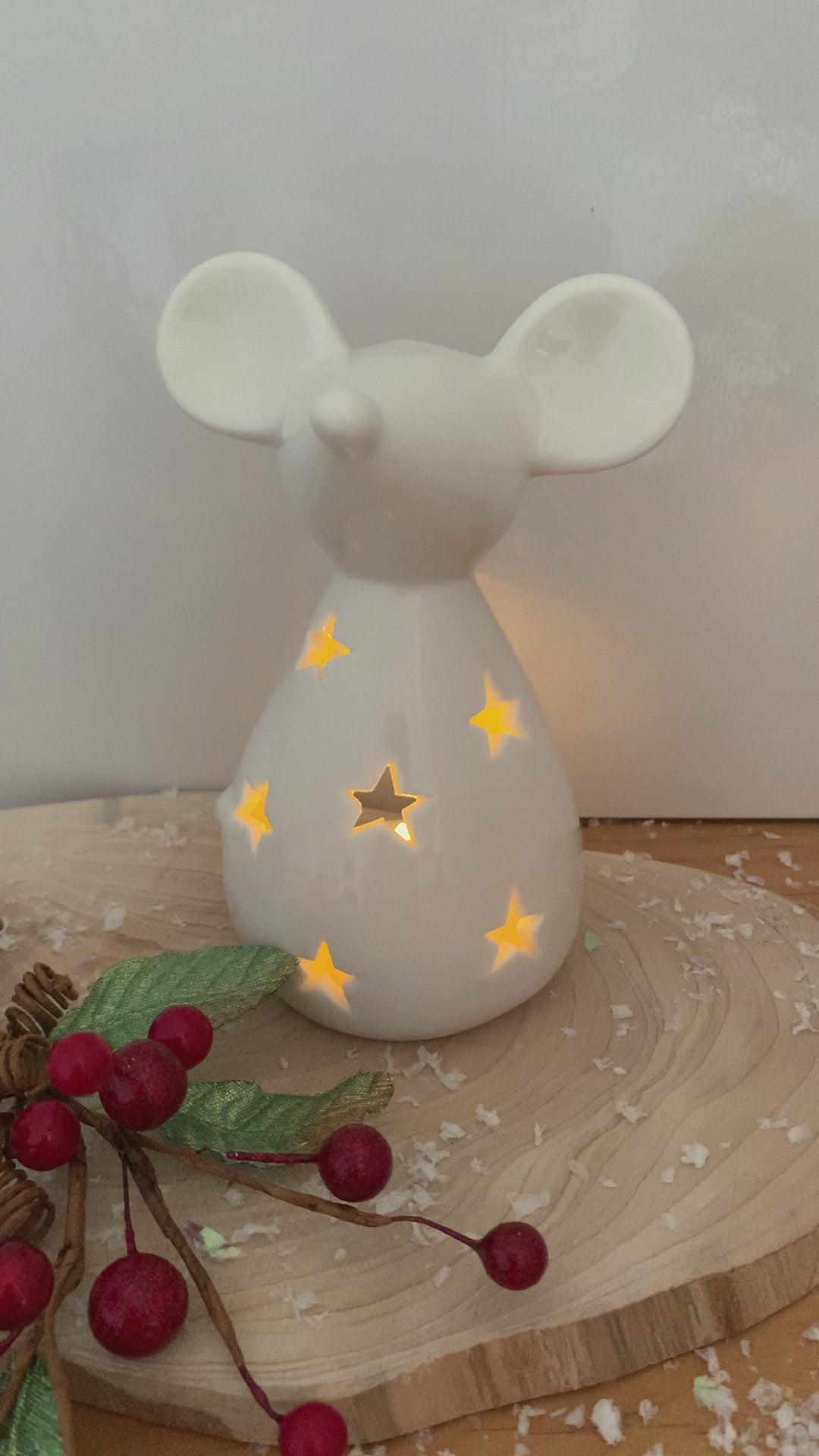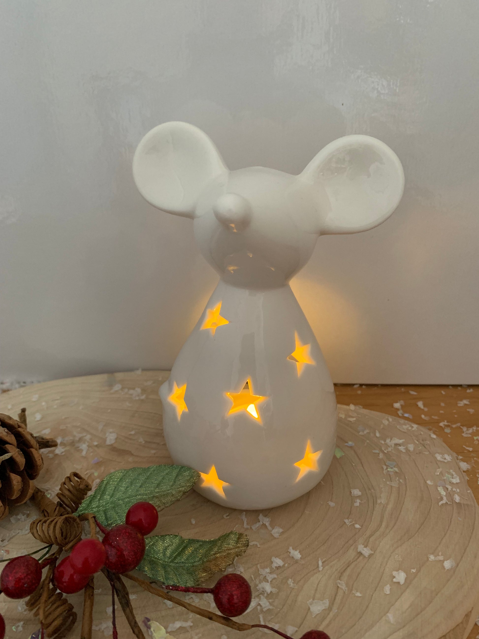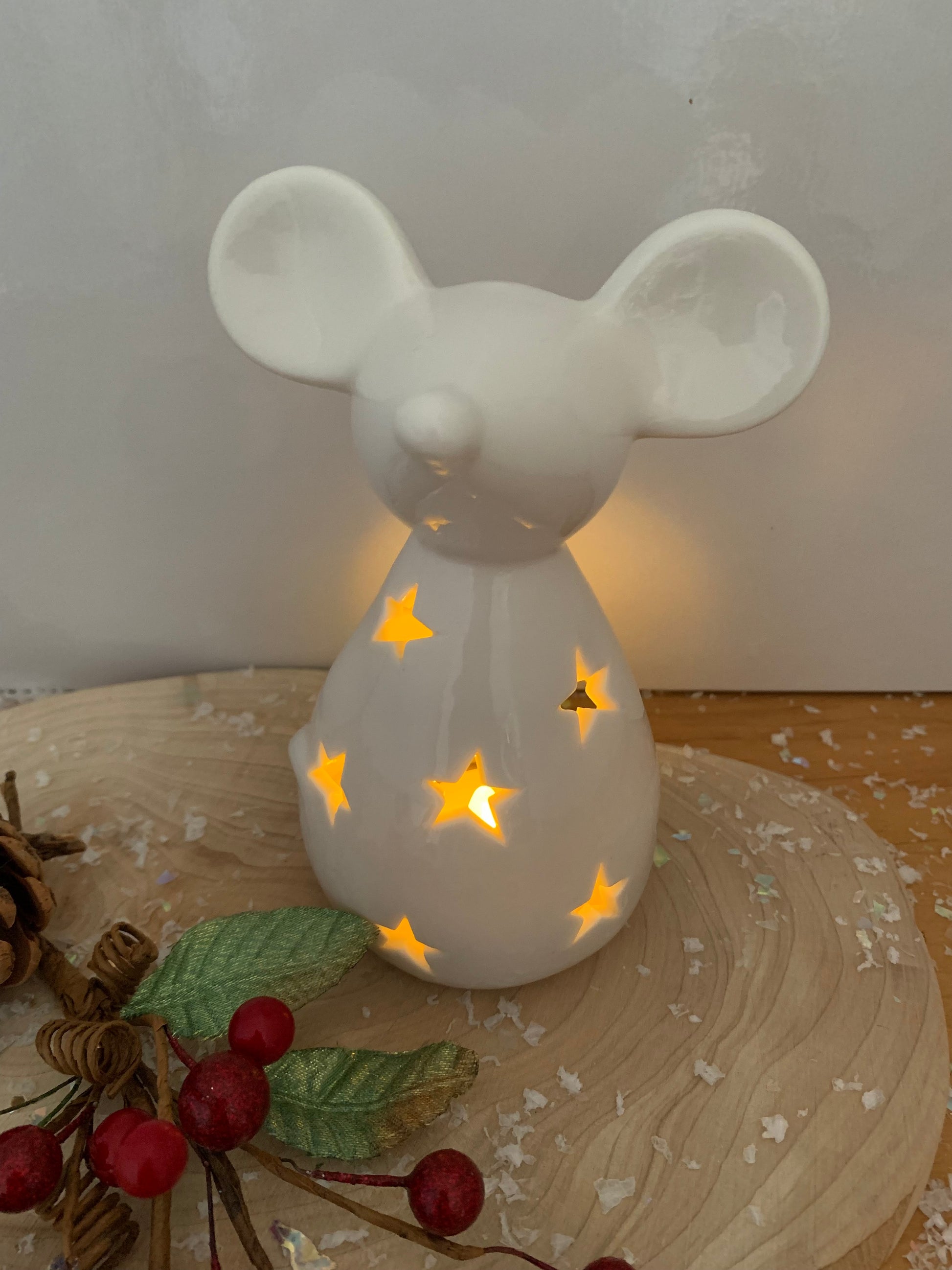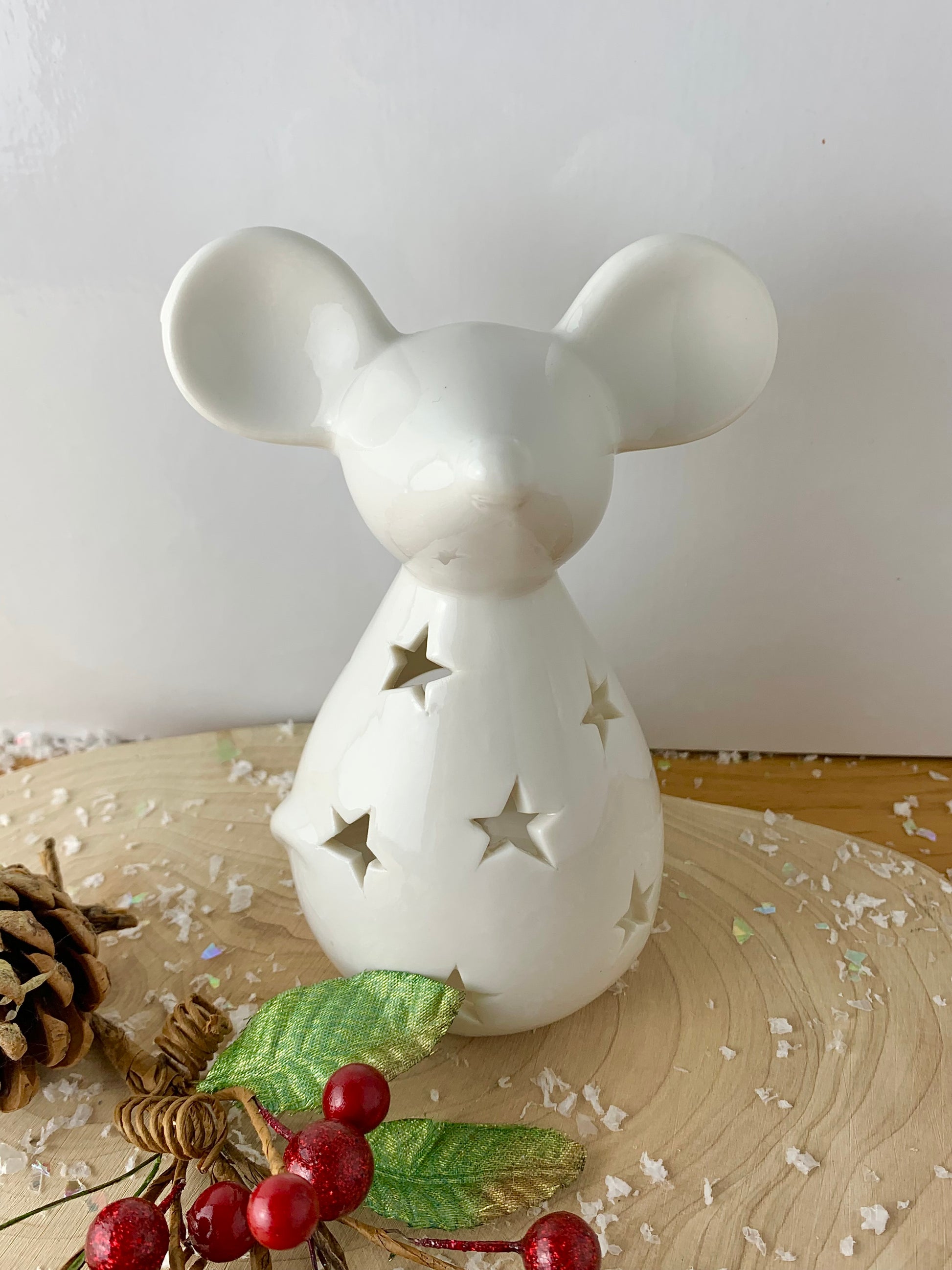 White ceramic gloss tea light holder in the shape of a mouse with cutout stars.