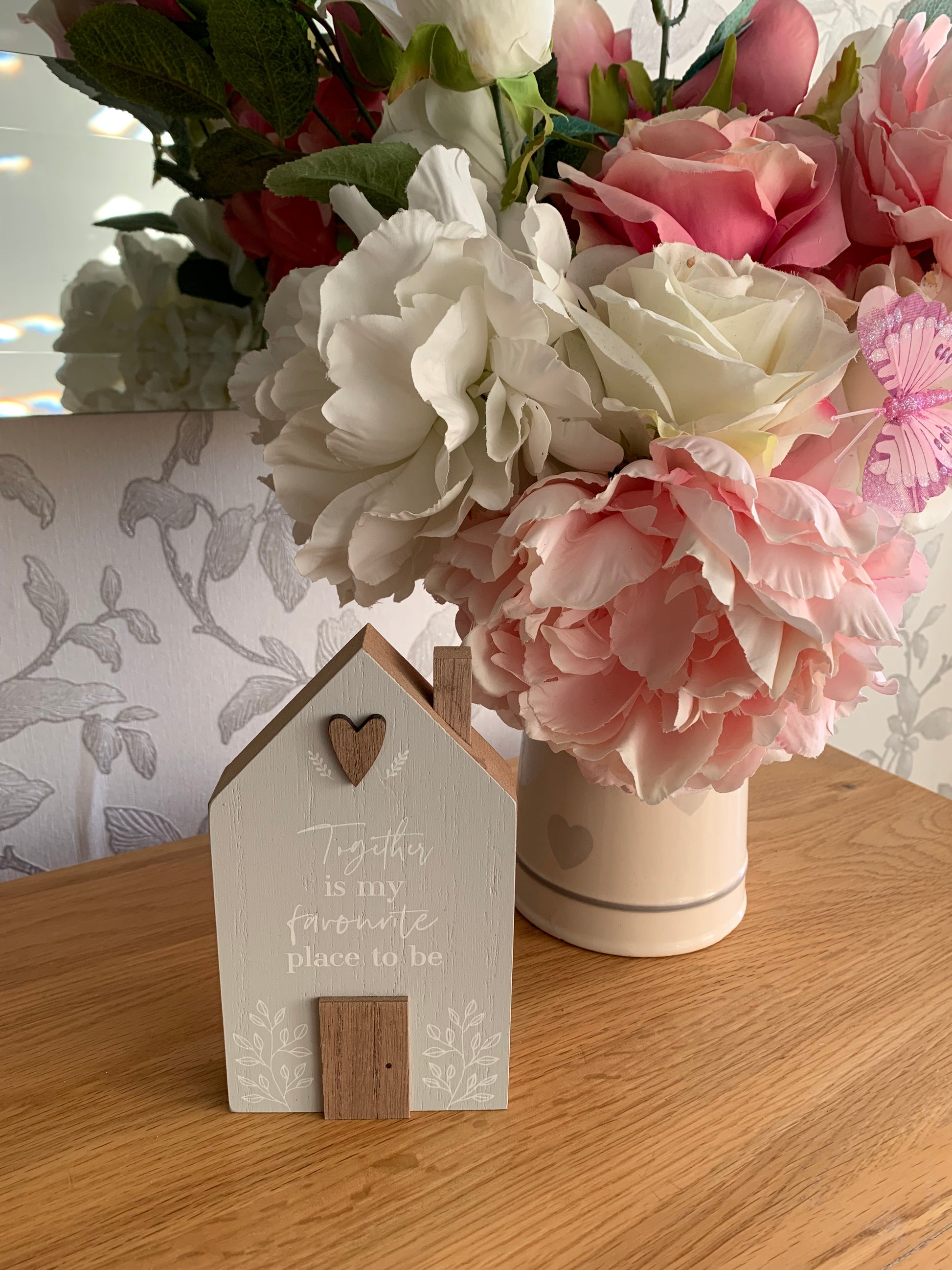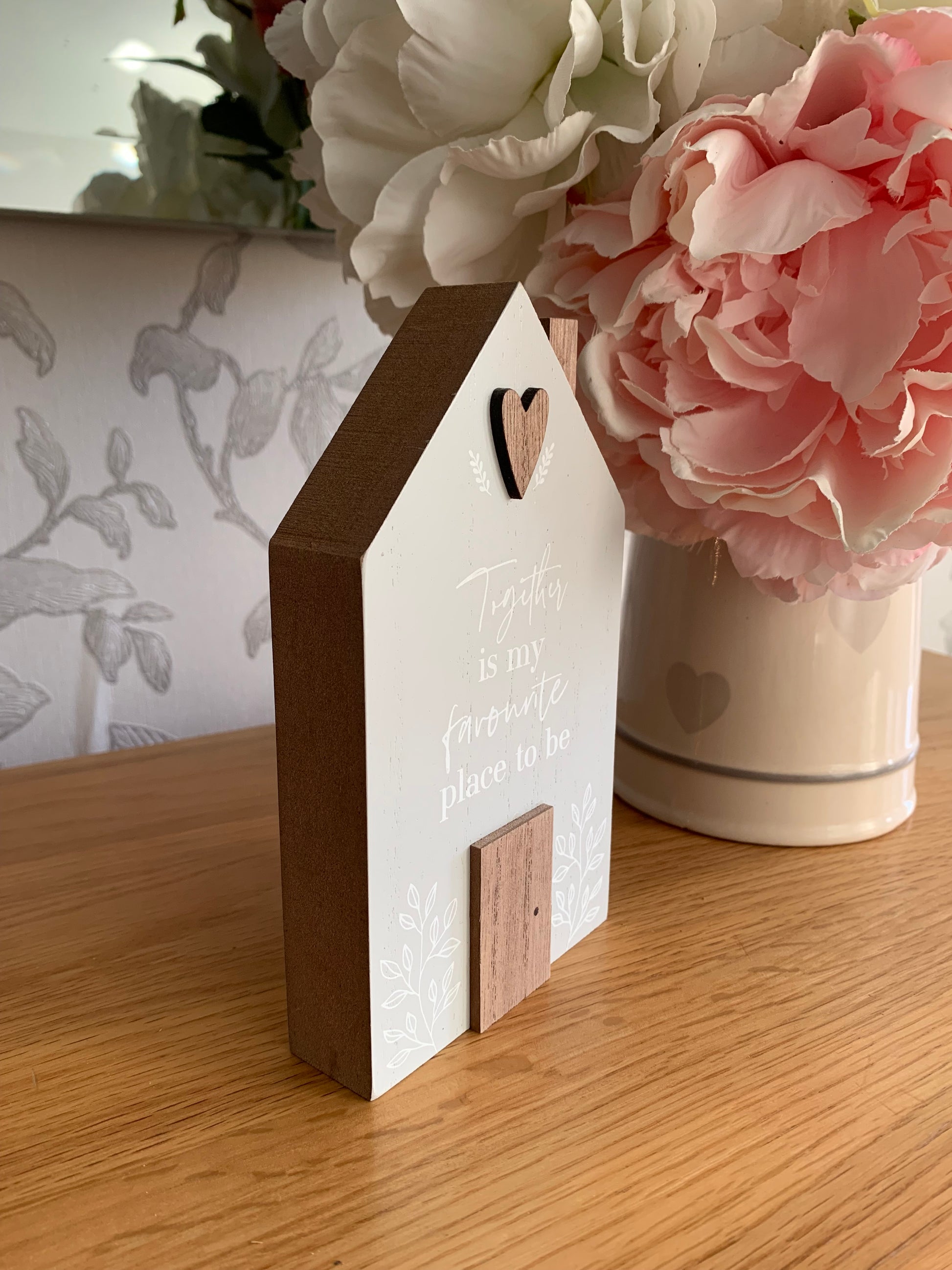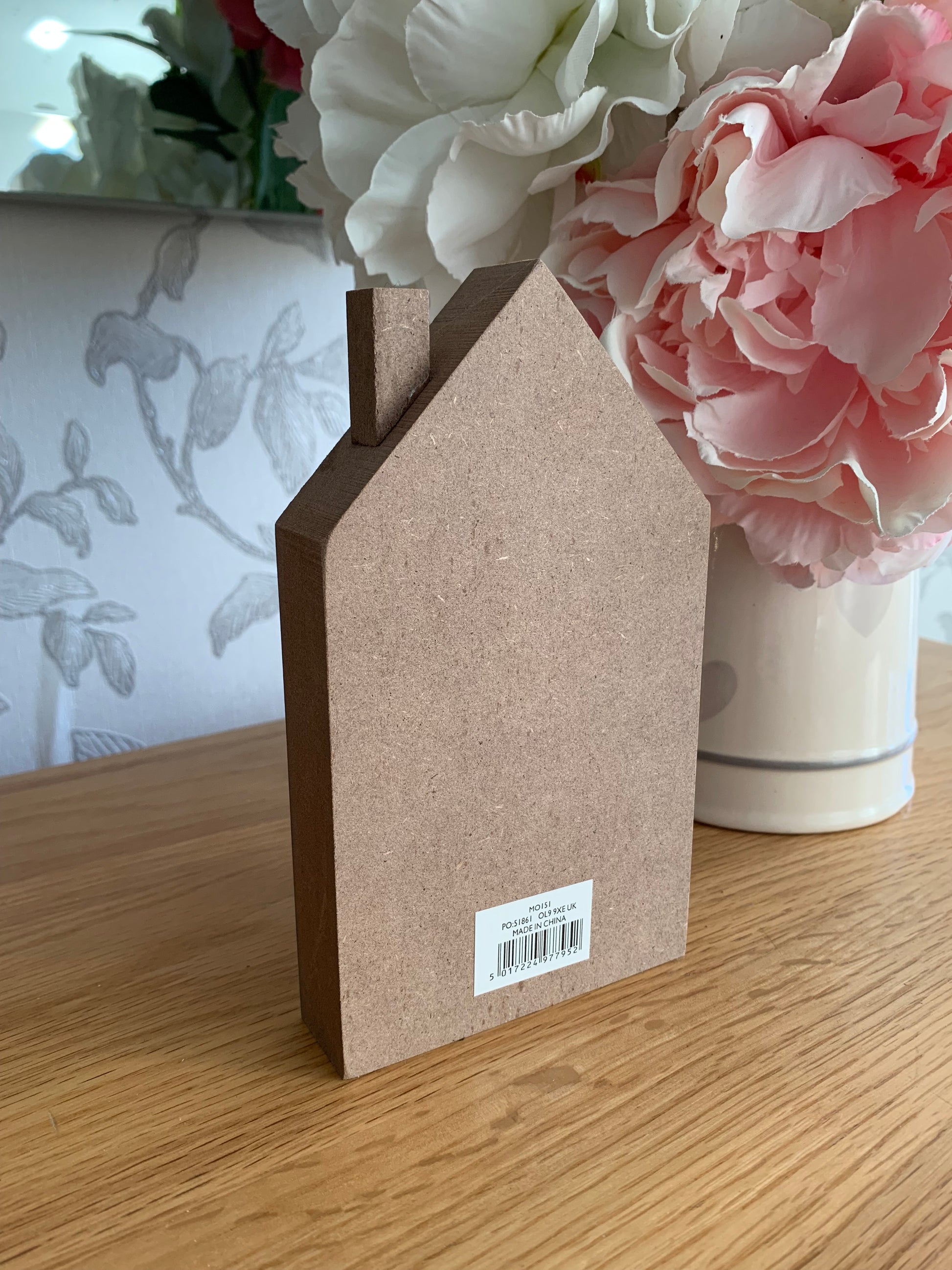 Free standing wooden sign in the shape of a house in grey and natural wood, with white writing.