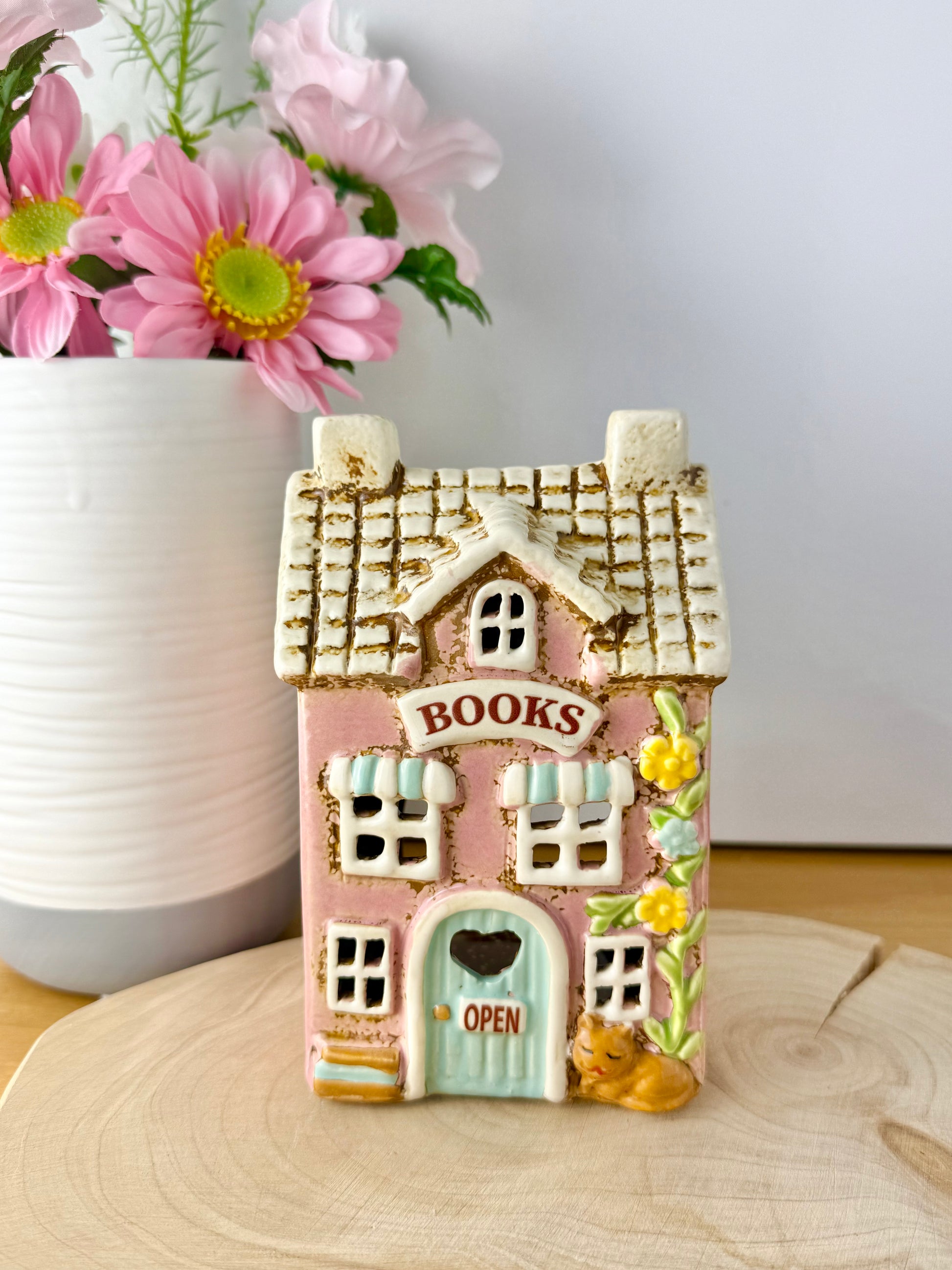 With details such as a textured roof, double chimney & floral accents and a Books Sign on the front & an open sign on the door it creates a warm and inviting addition to a shelf, bookcase or sideboard.