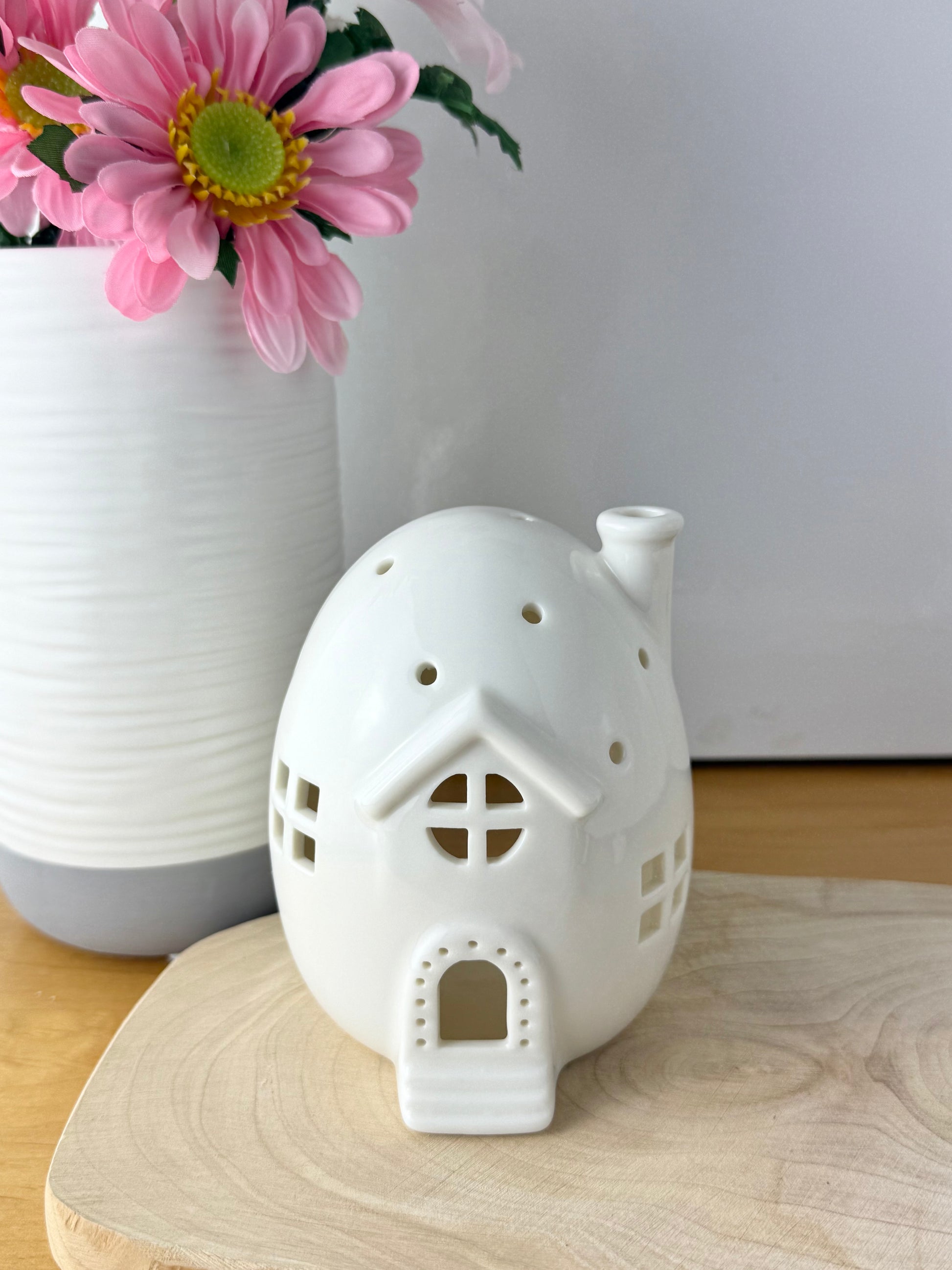 A ceramic white unique egg shaped house t-light holder.