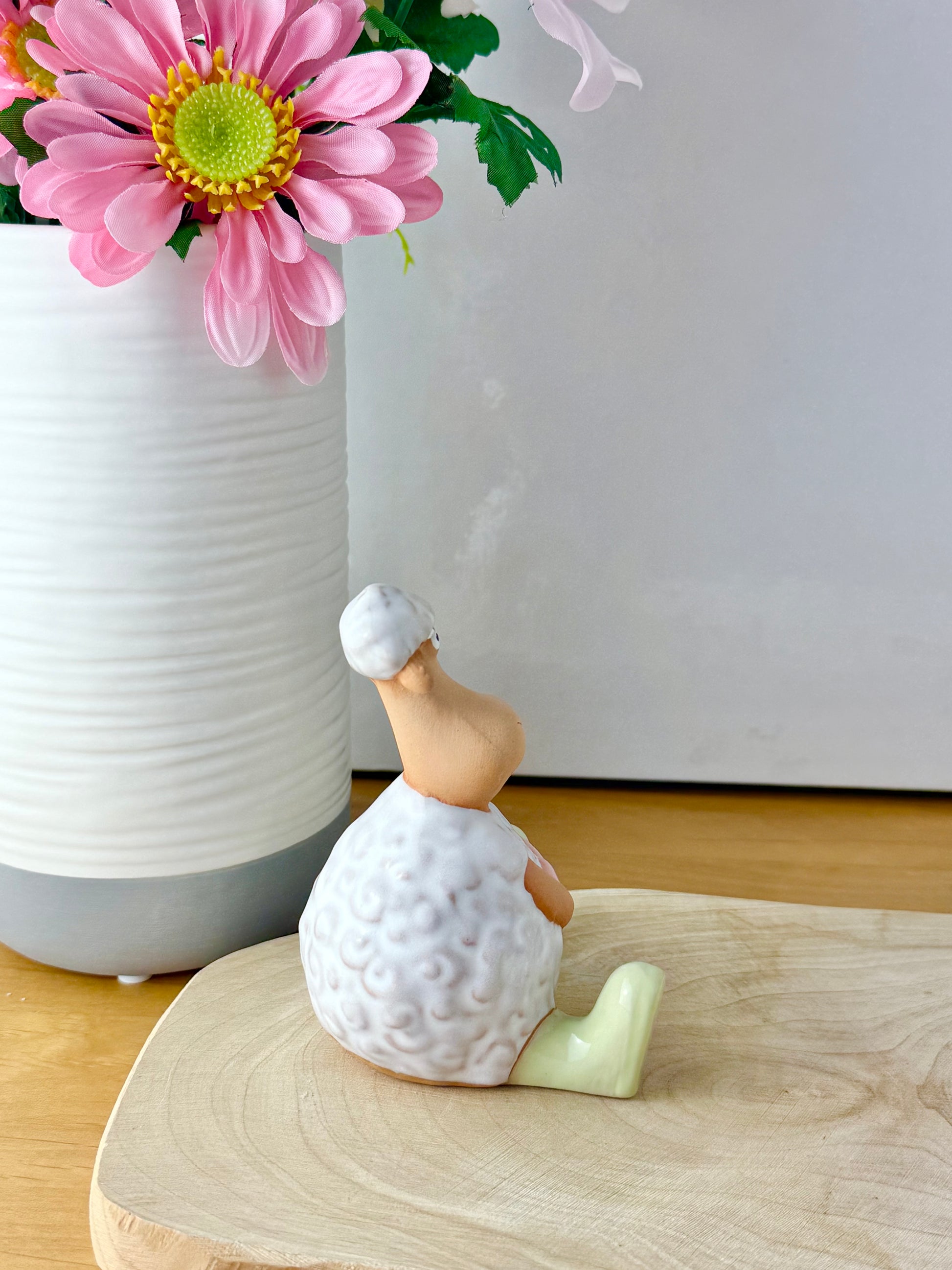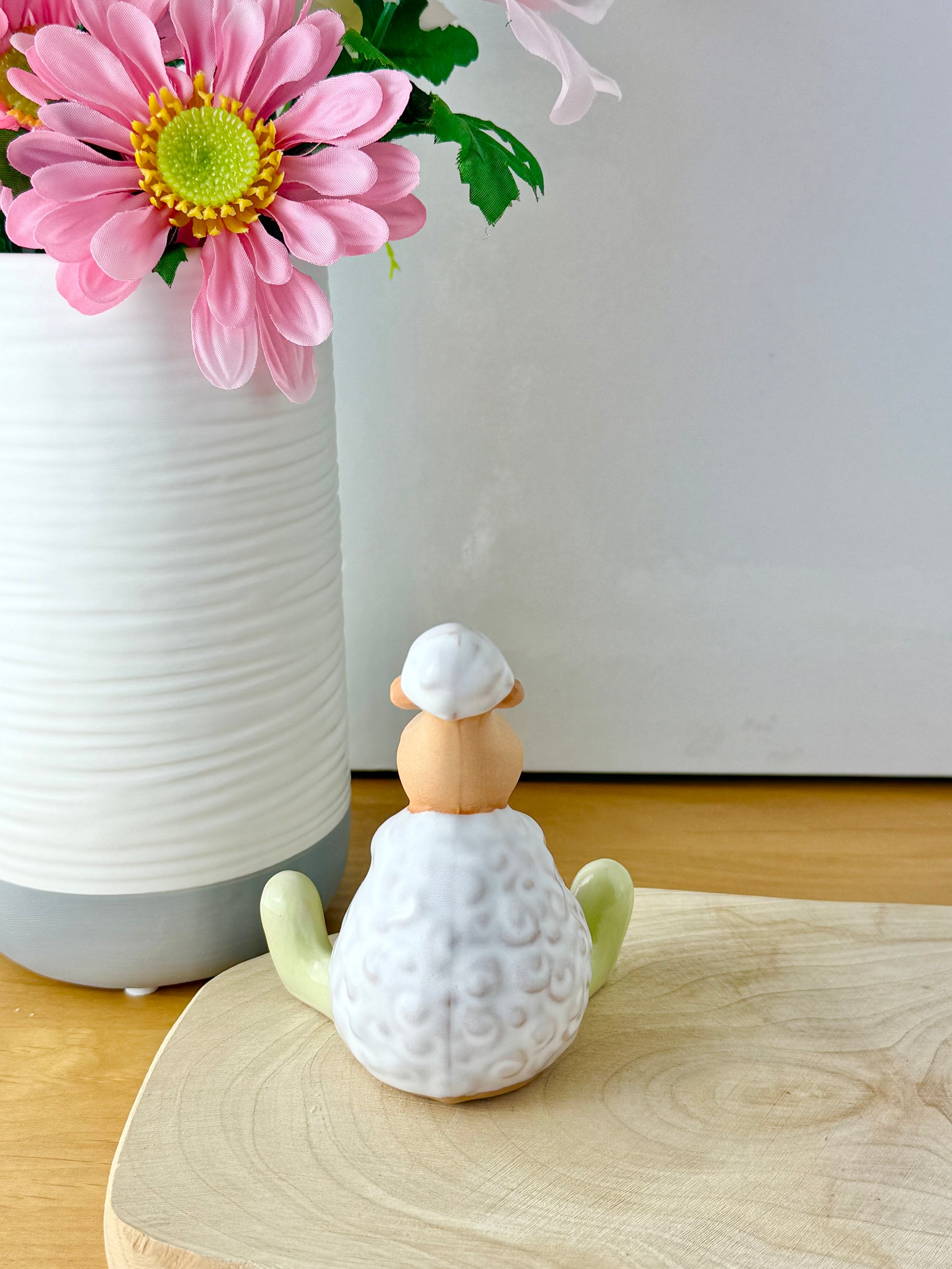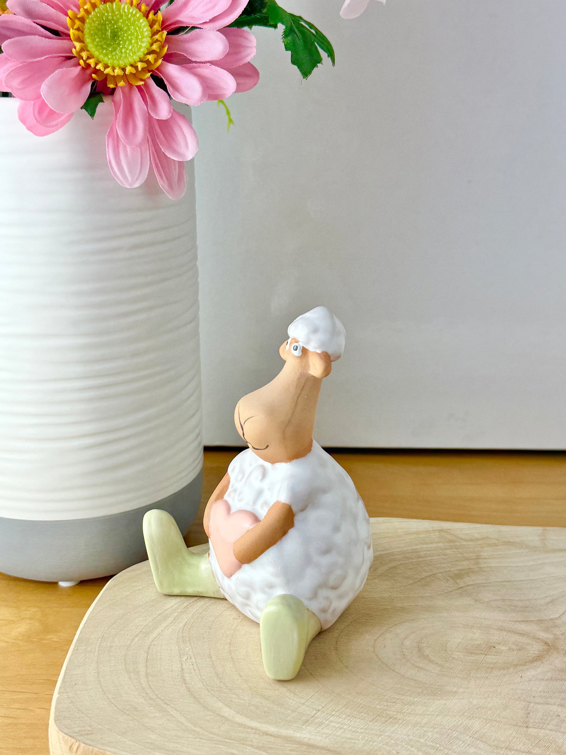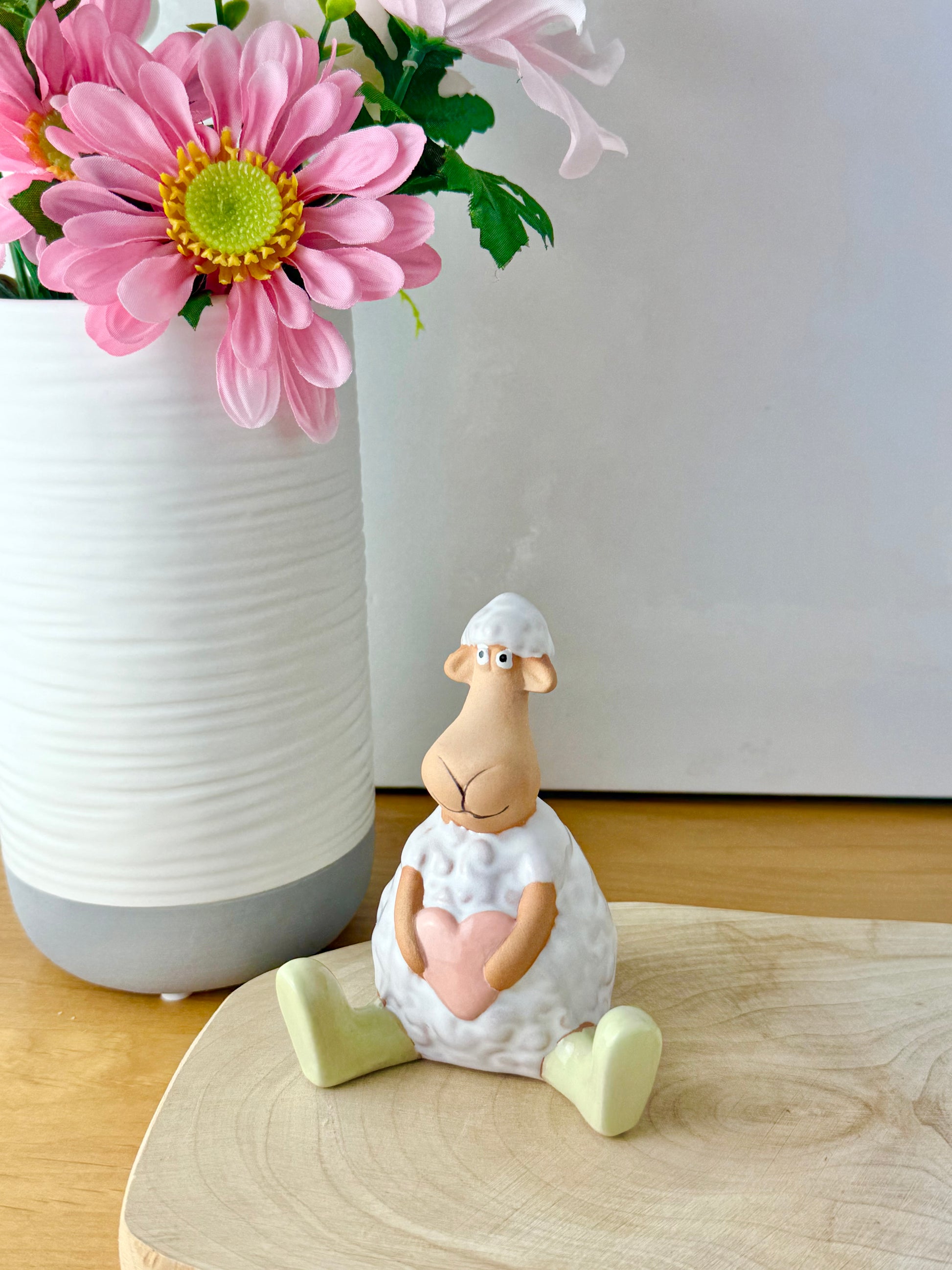 Add a touch of spring charm to your Easter décor with these delightful standing & sitting sheep carrying a pink heart & wearing light green wellies